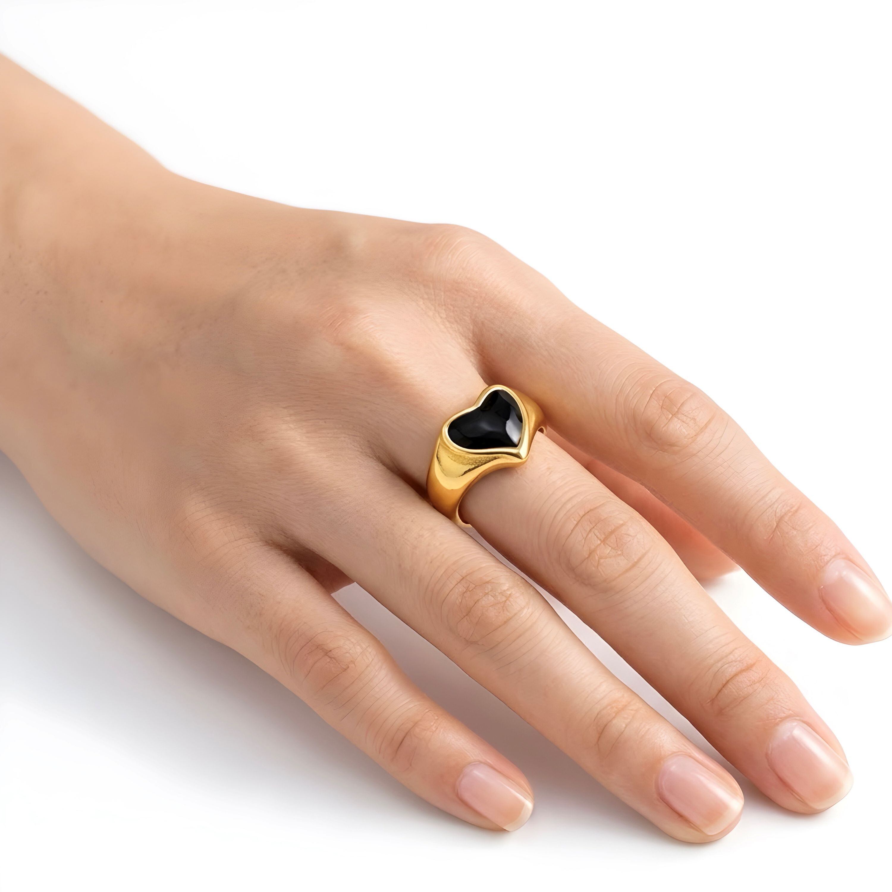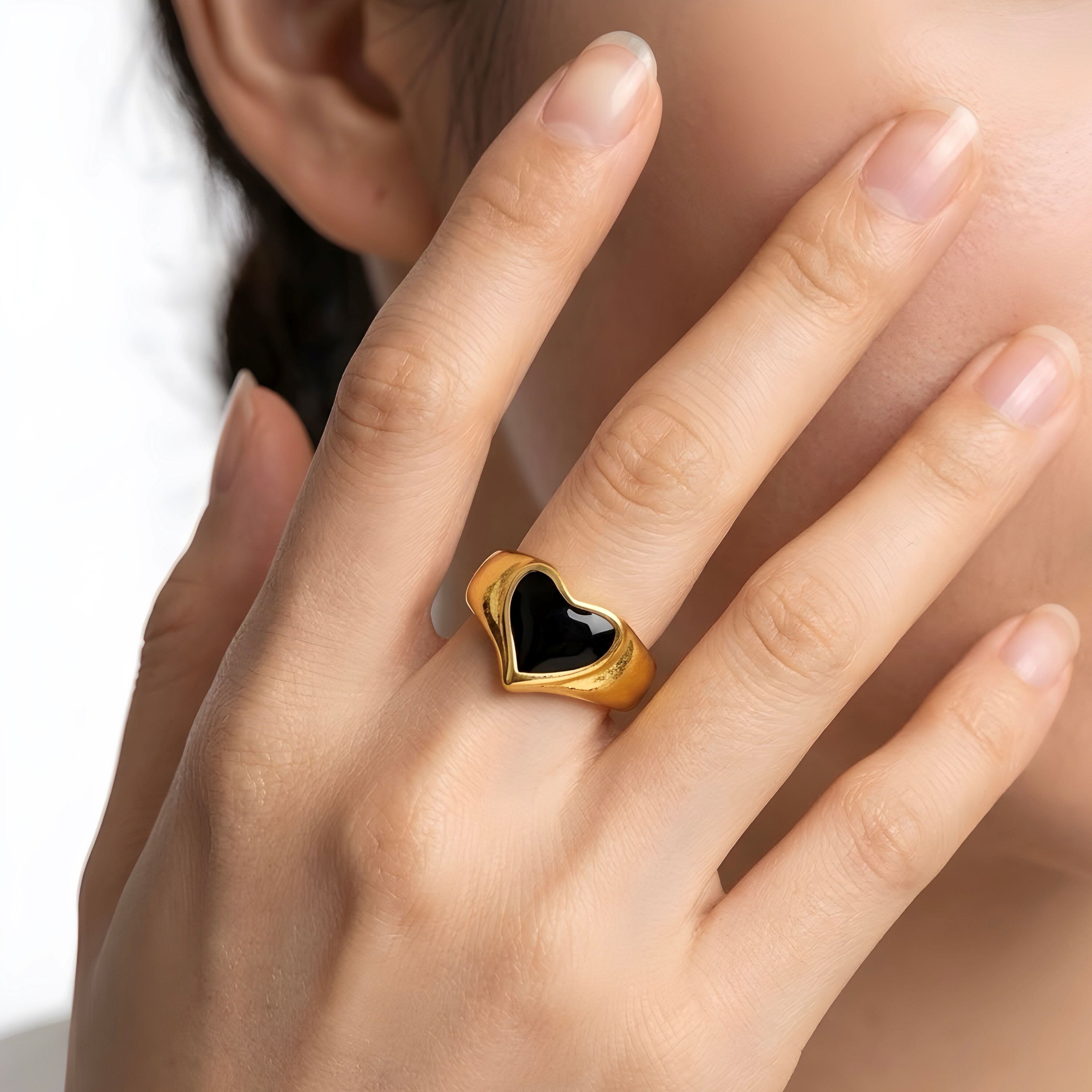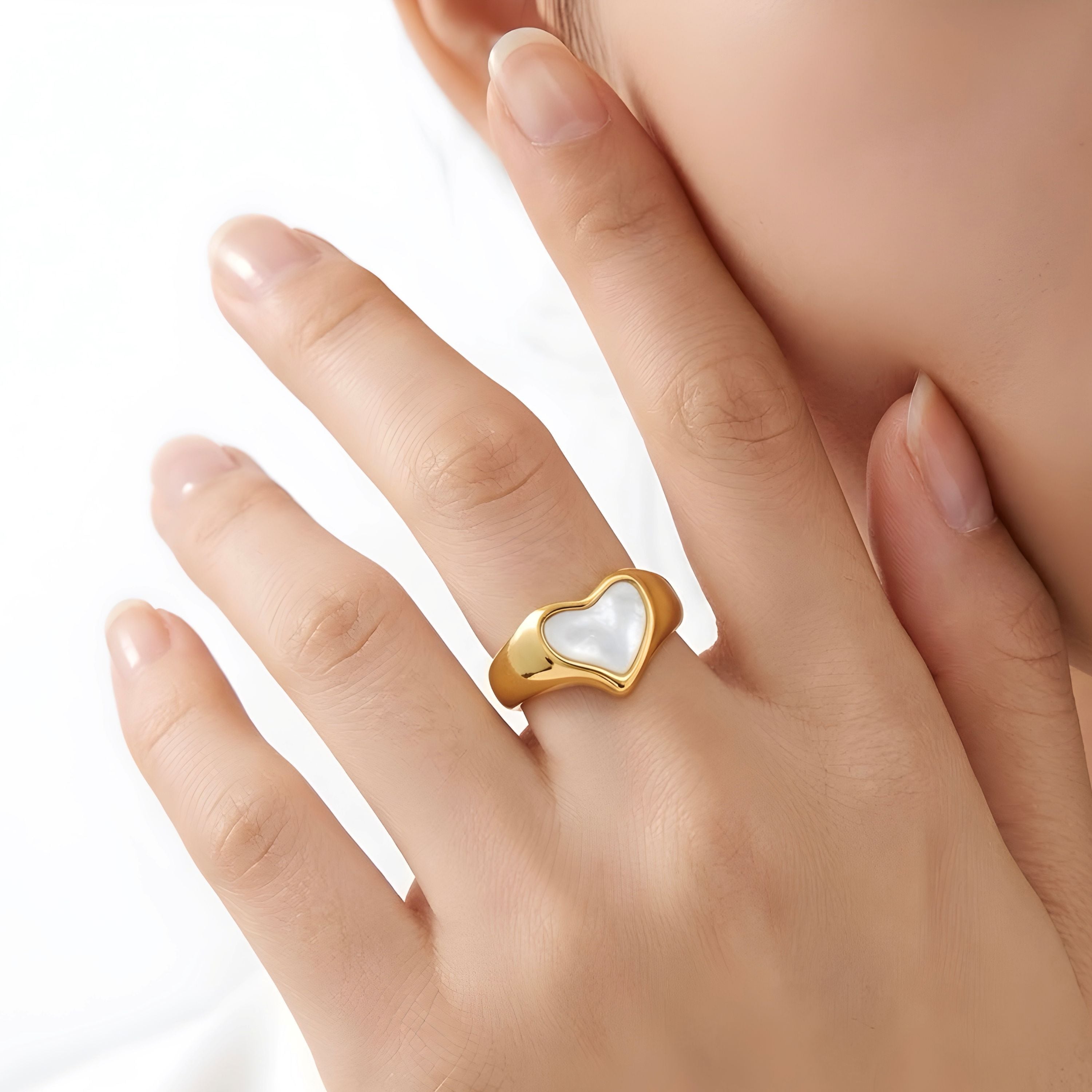 なめらかなフォルムのハートモチーフが指元にやさしく馴染む、サージカルステンレス316L製のオープンリング。程よい厚みのゴールドベースに、艶のある表情が特徴のデザインで、甘くなりすぎず大人のスタイリングに自然に溶け込みます。