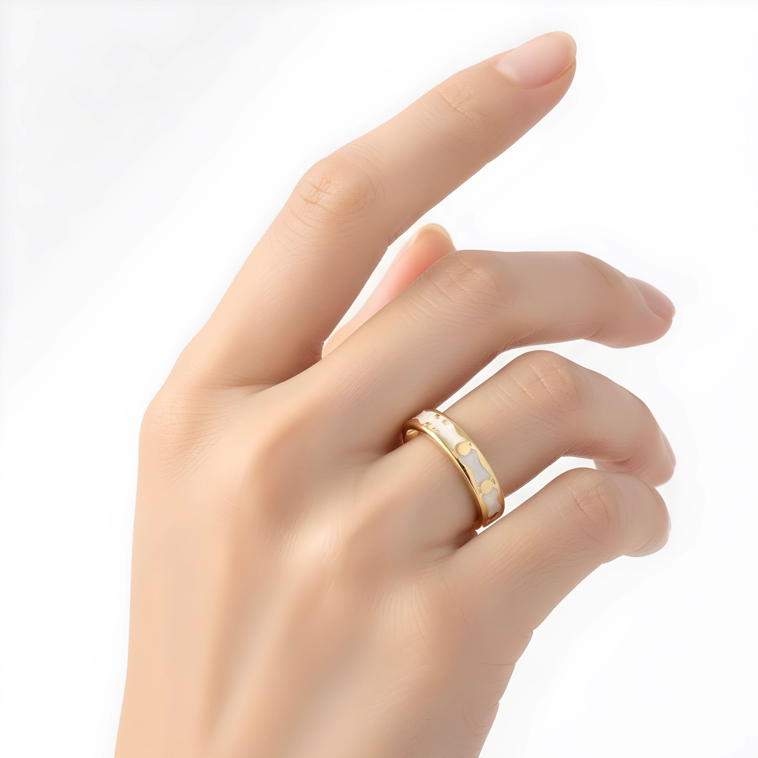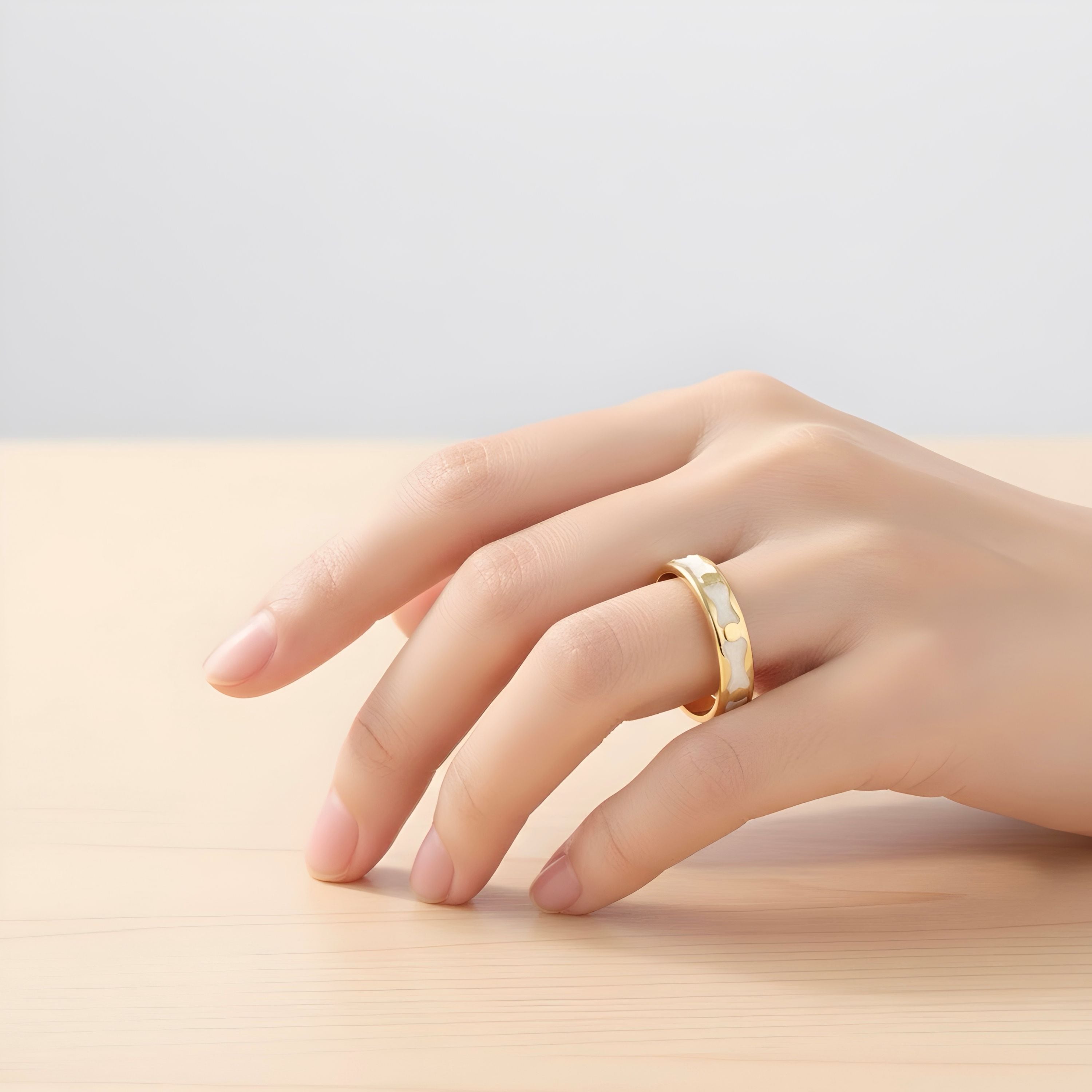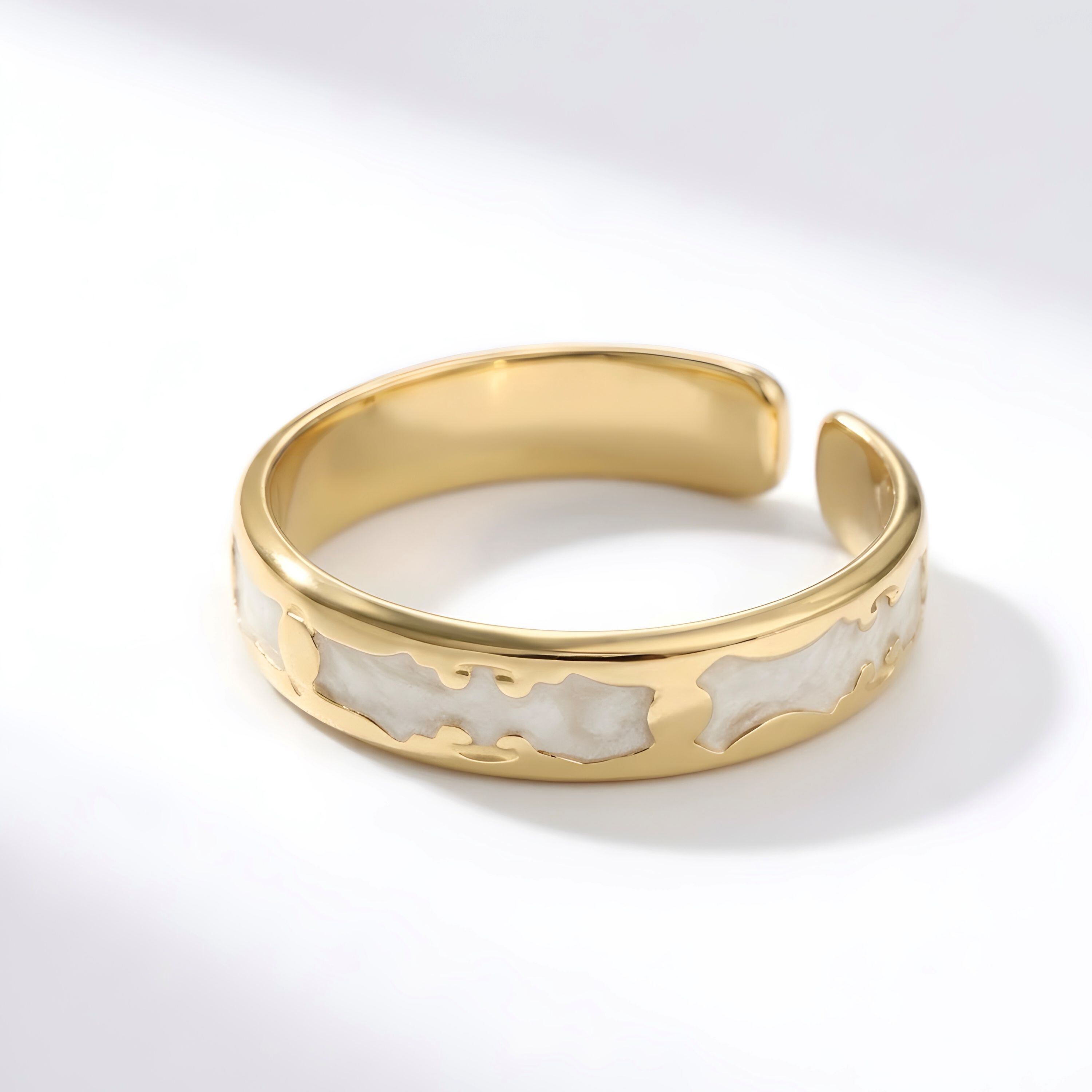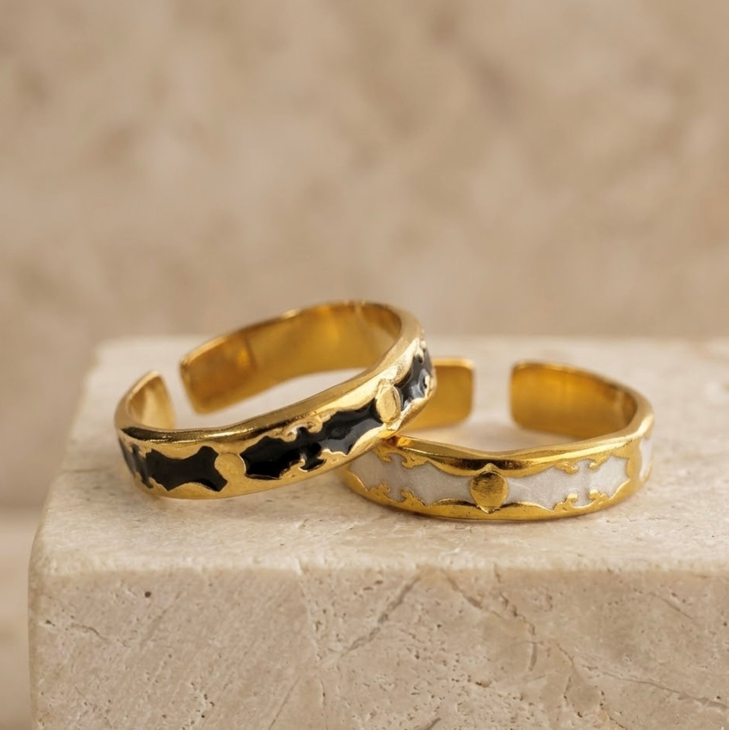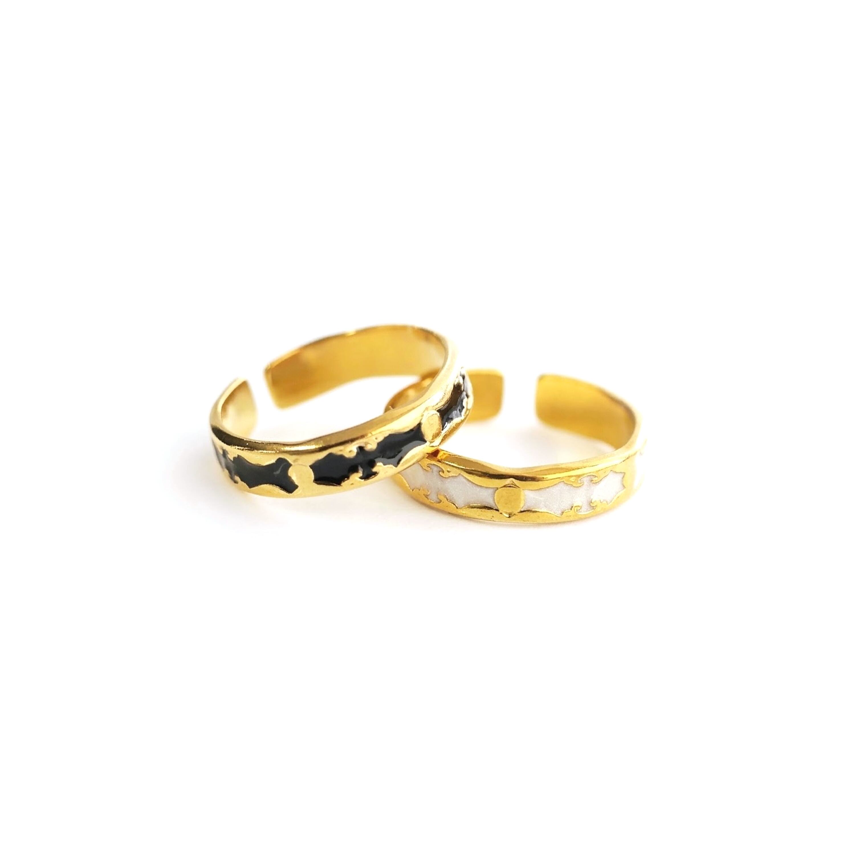 装飾的なラインを帯状にあしらった、洗練された佇まいのオープンリング。程よい艶感をもつブラックとホワイトの配色が、指元に落ち着いたアクセントを添えます。主張しすぎないデザインのため、デイリーからきれいめスタイルまで幅広く馴染む一品です。