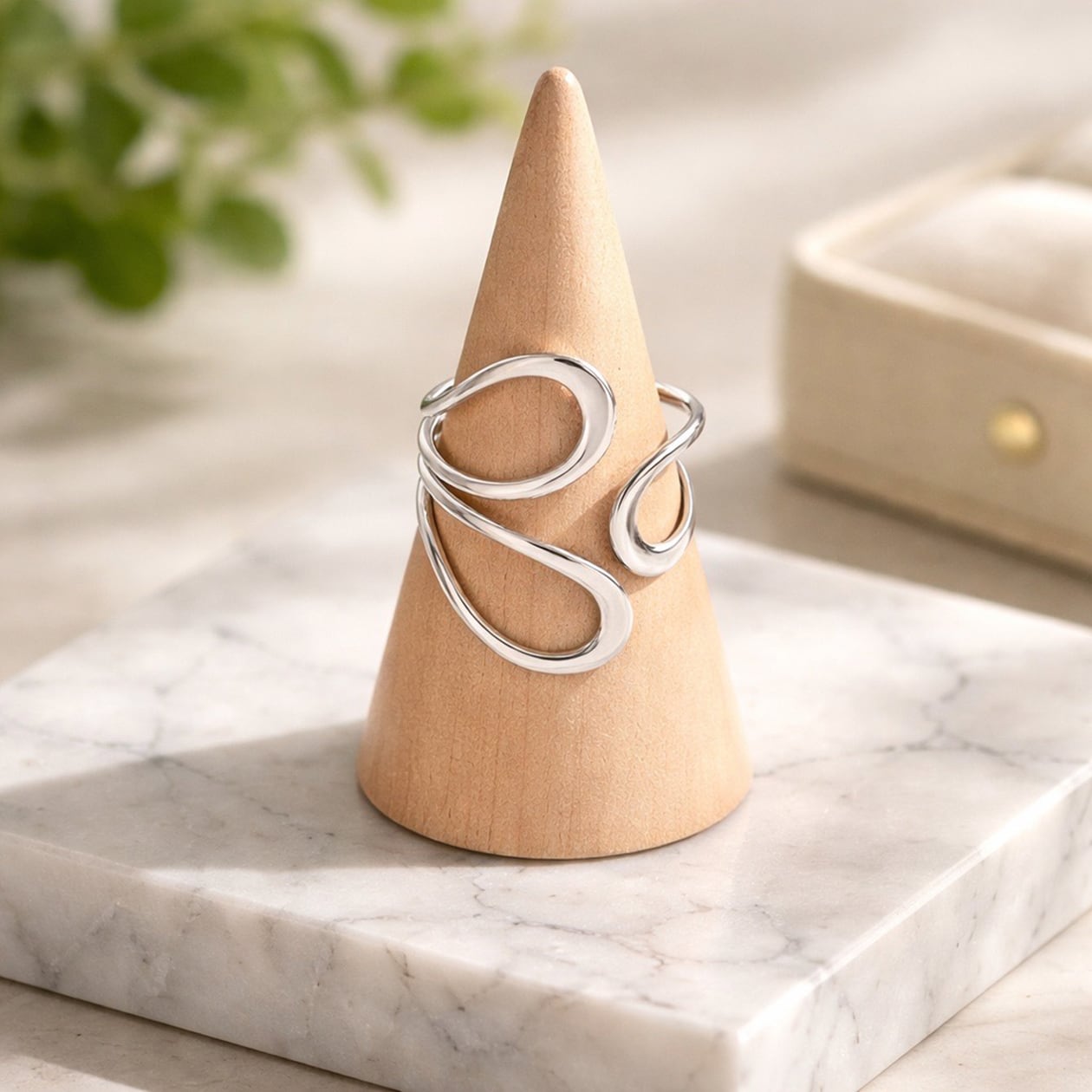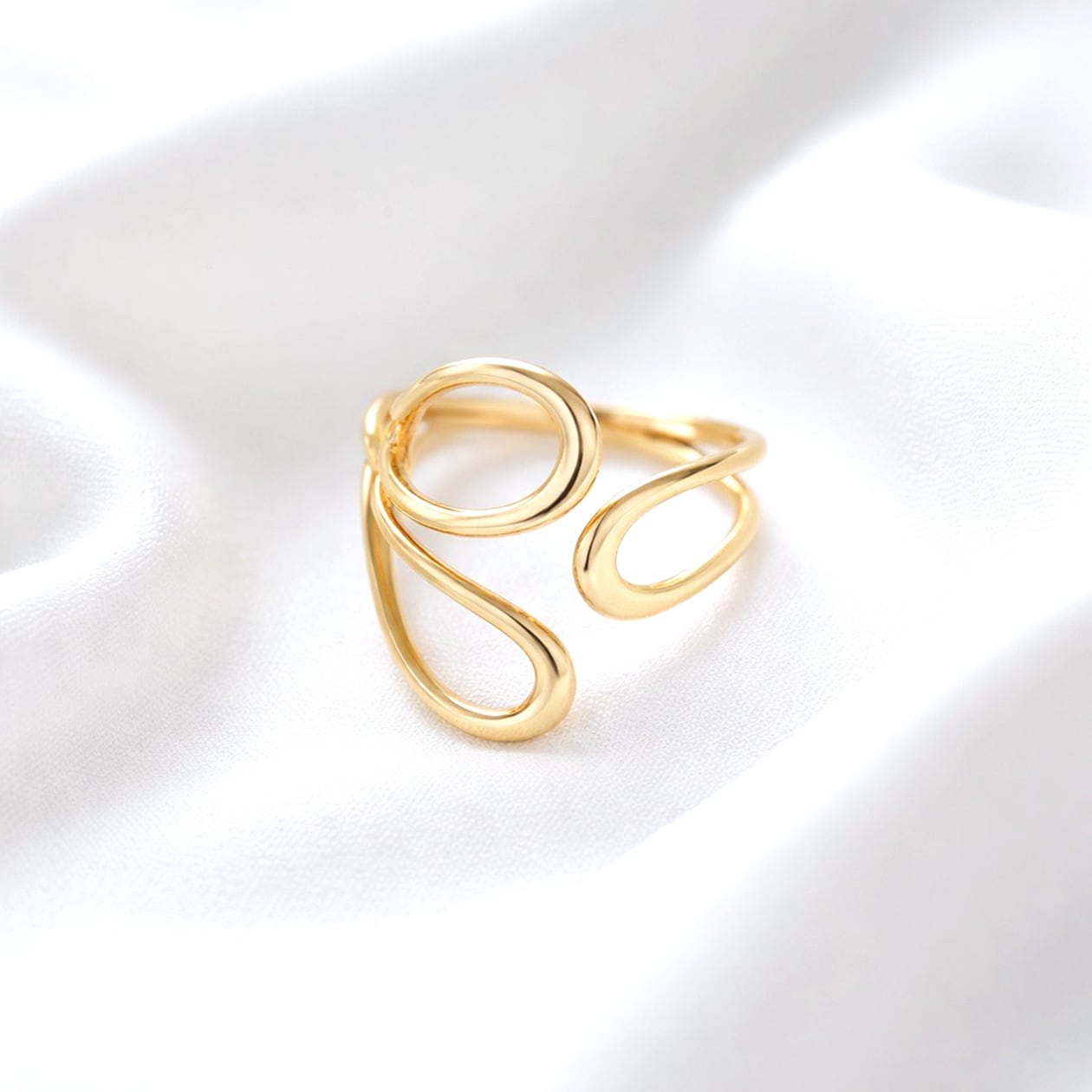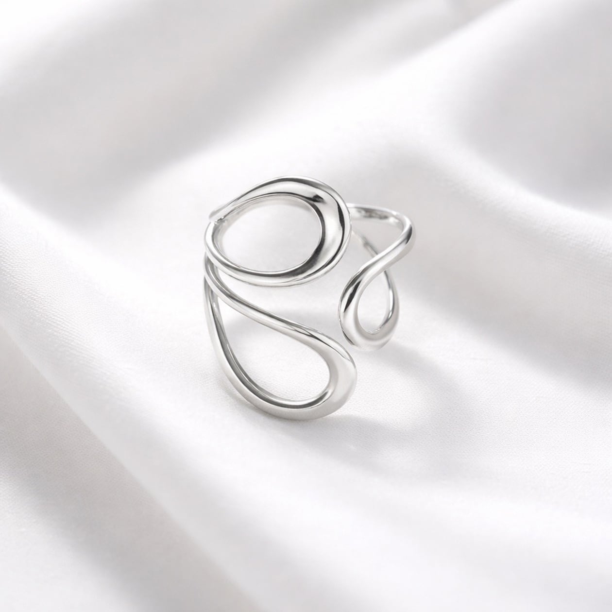 流れるようなラインが指元に立体的な表情を与える、ニュアンスデザインのオープンリング。