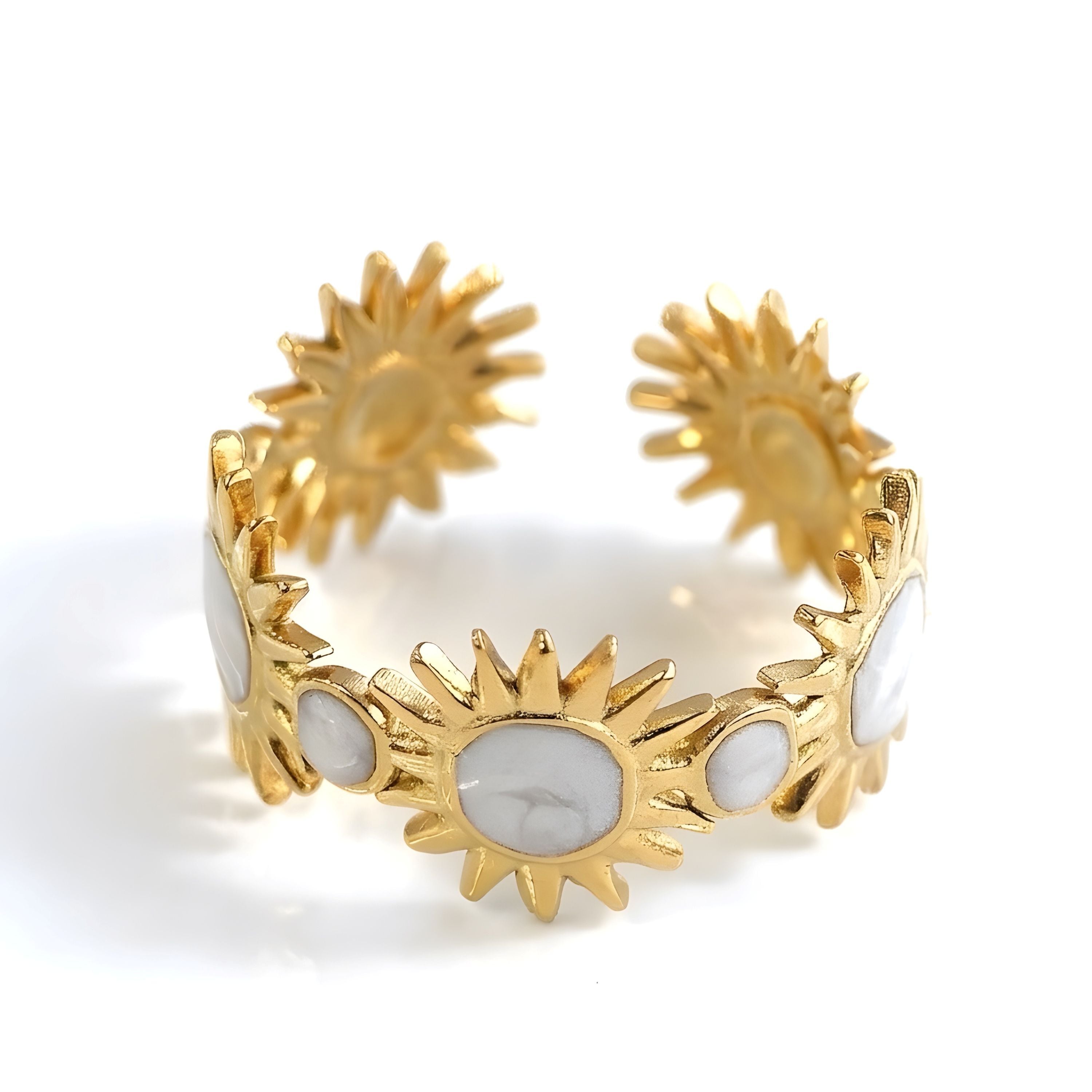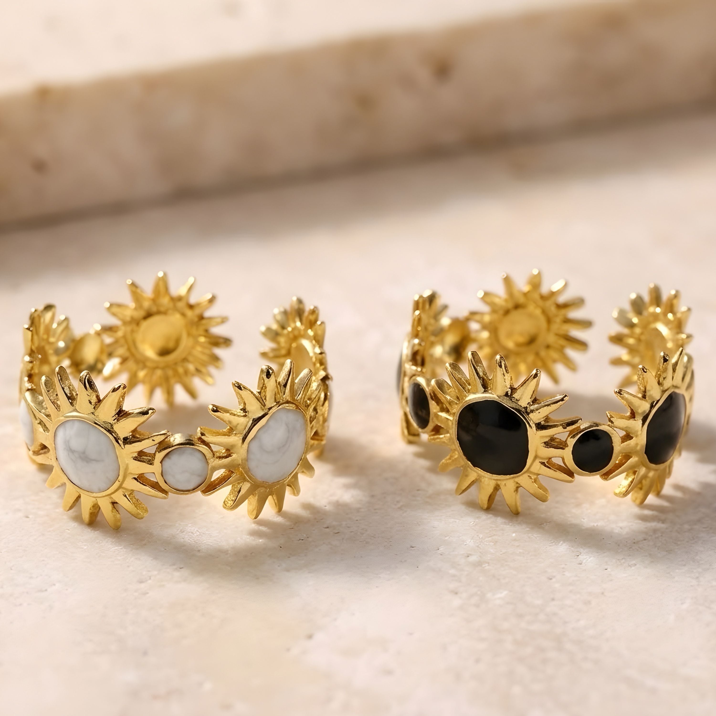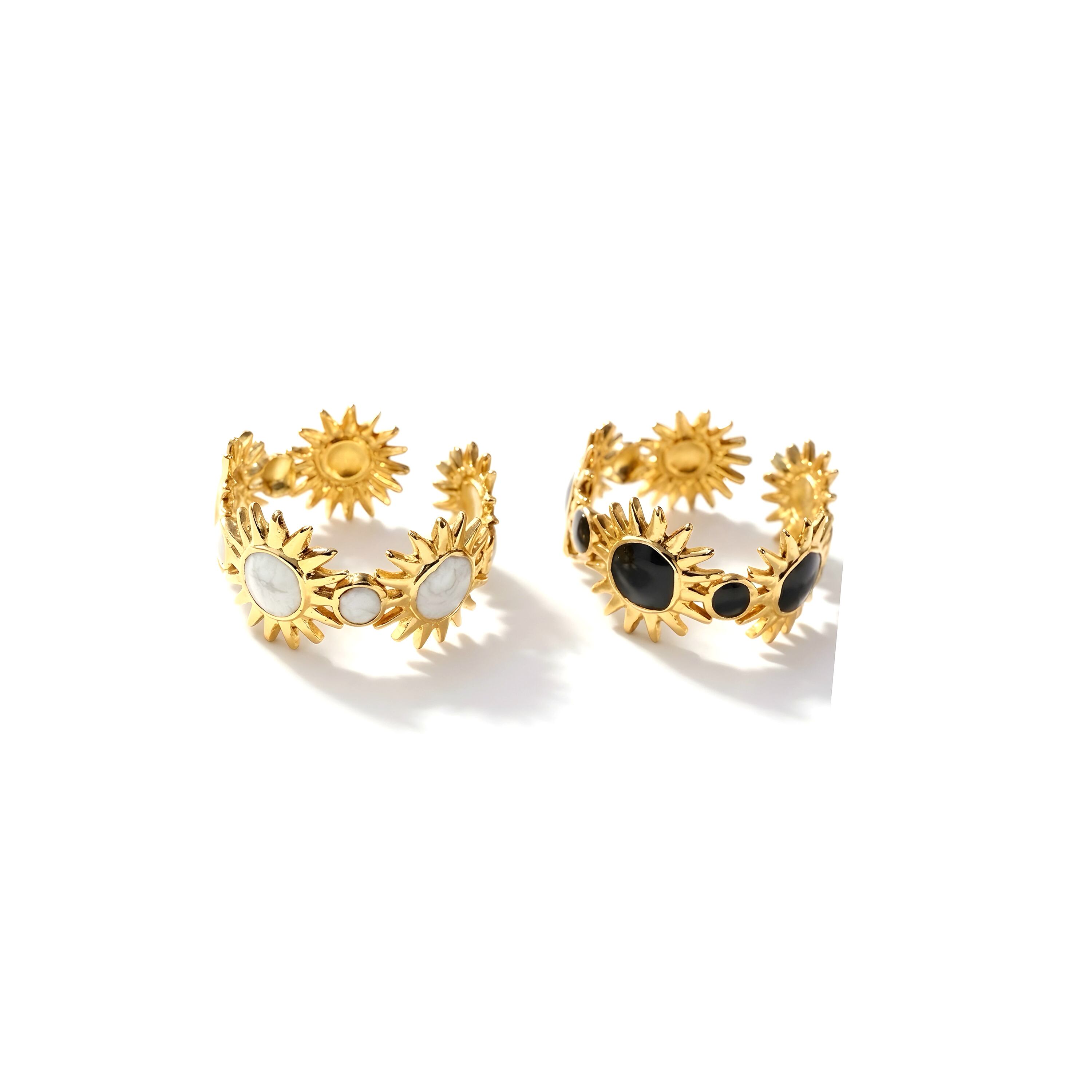 太陽をモチーフにしたサンデザインが印象的な、【NOIR BLANC】コレクションのオープンリング。ゴールドカラーのサージカルステンレス316Lに、ホワイト、ブラックのコントラストカラーを組み合わせ、華やかさの中にモードな表情を添えました。存在感のあるデザインながら、抜け感のあるフォルムで指元をすっきりと演出します。