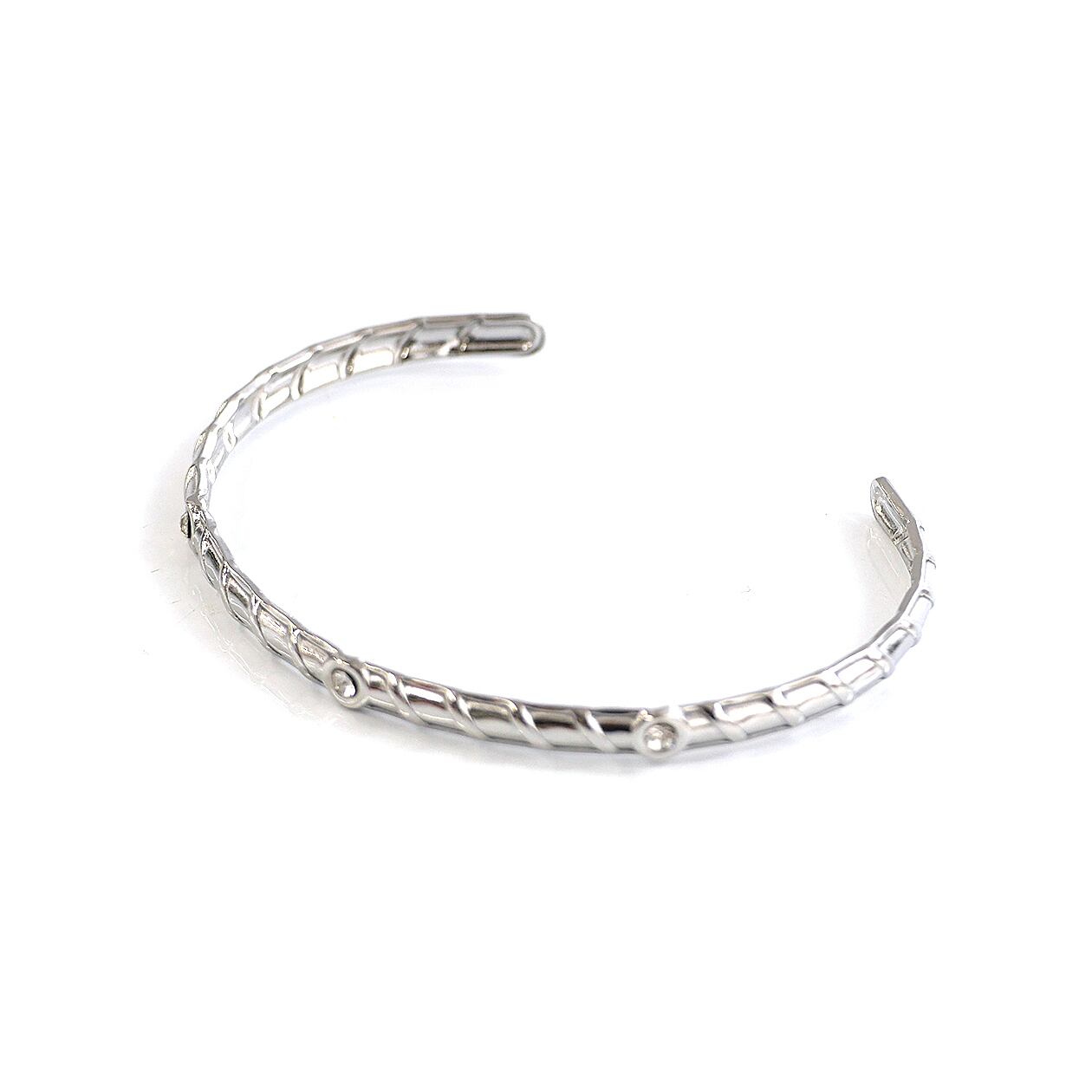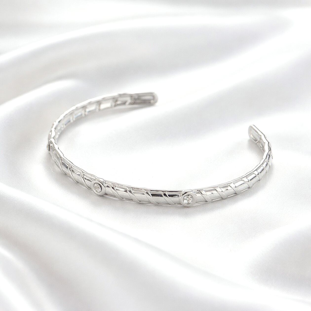 緩やかにひねりを加えたツイストラインに、3粒のキュービックジルコニアをバランスよくあしらった、サージカルステンレス316L製バングル。直線と曲線が交差する立体的なフォルムが、手元に自然な動きと上品な輝きを添えます。