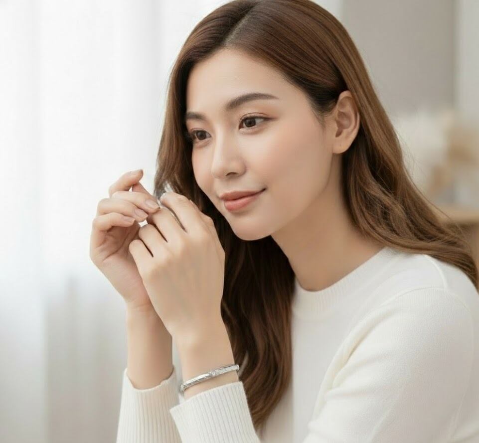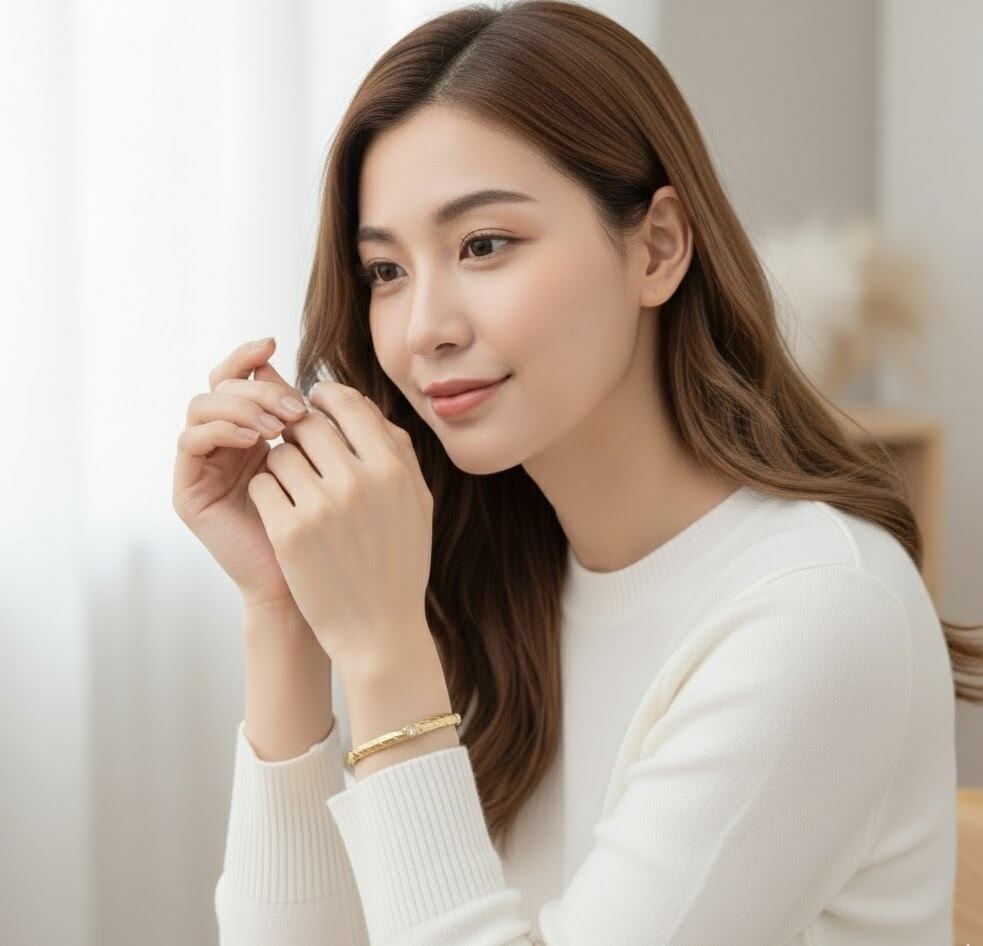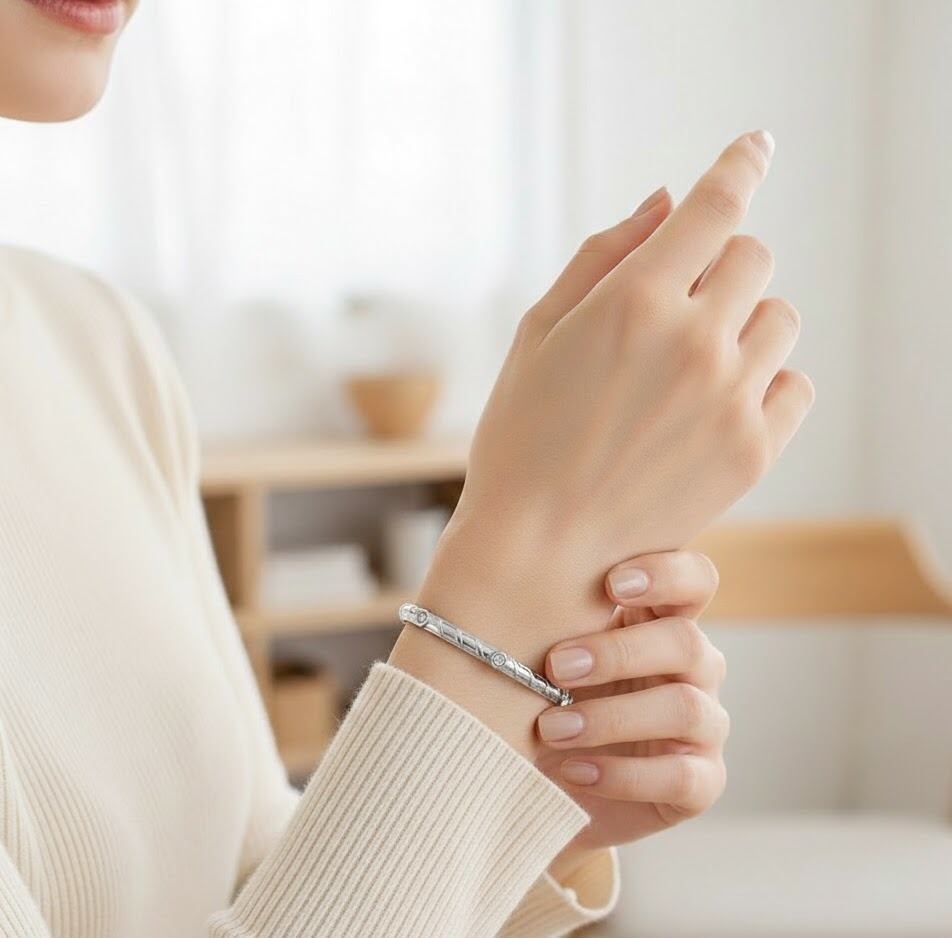 程よい艶感をもつメタル仕上げと、控えめにきらめくストーンの組み合わせは、シンプルながらも洗練された印象。カジュアルな装いにはもちろん、きれいめスタイルやオフィスシーンにも取り入れやすいデザインです。