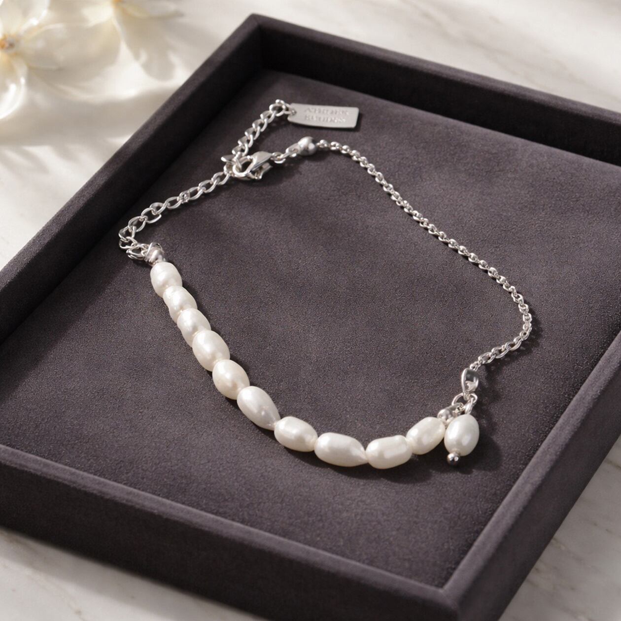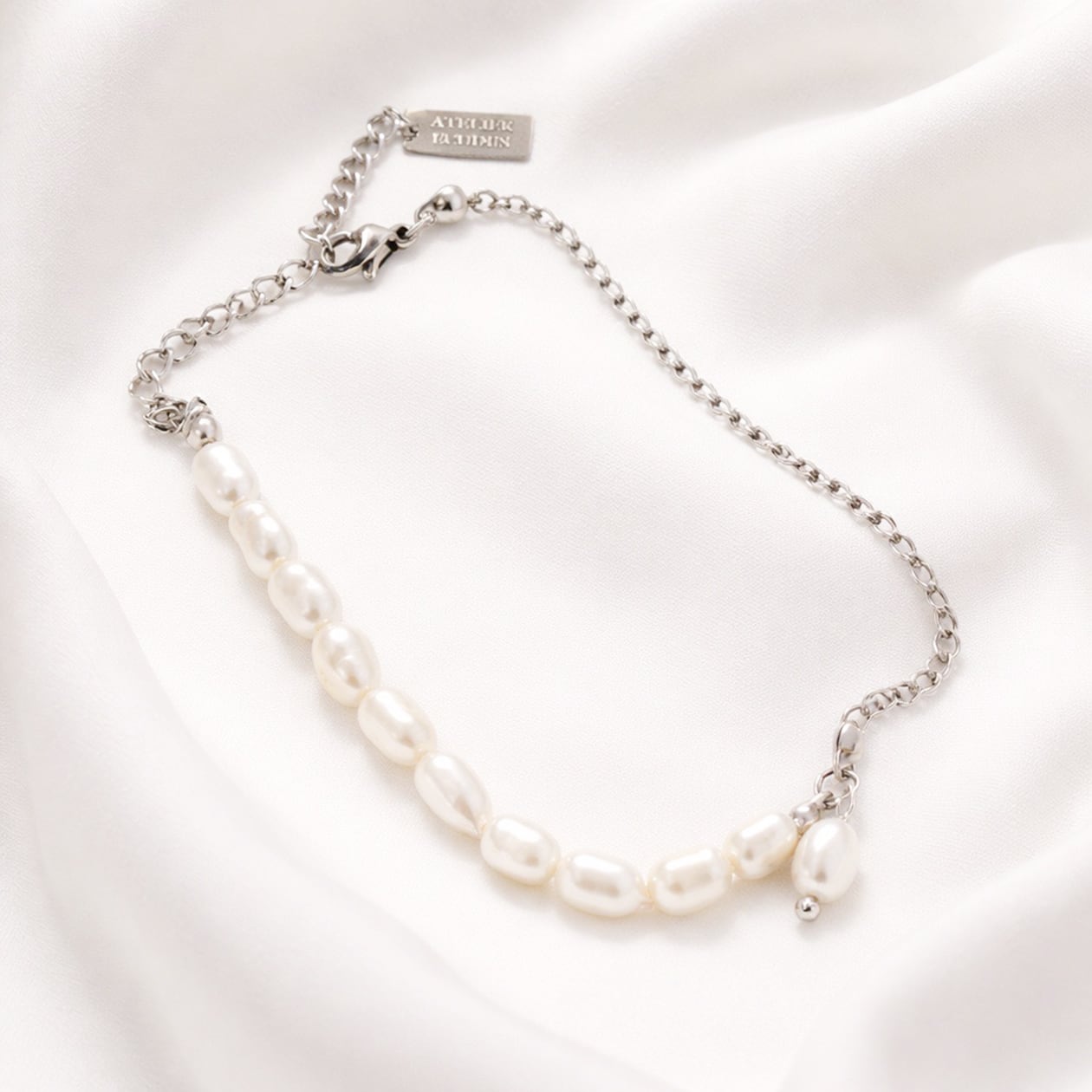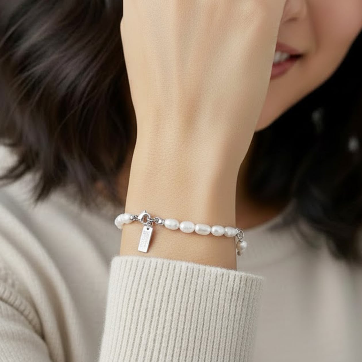 やわらかな艶を持つ淡水パールと、繊細なボールチェーンを組み合わせた上品なブレスレット。異なる質感が引き立て合い、手元にさりげない華やかさを添えてくれます。