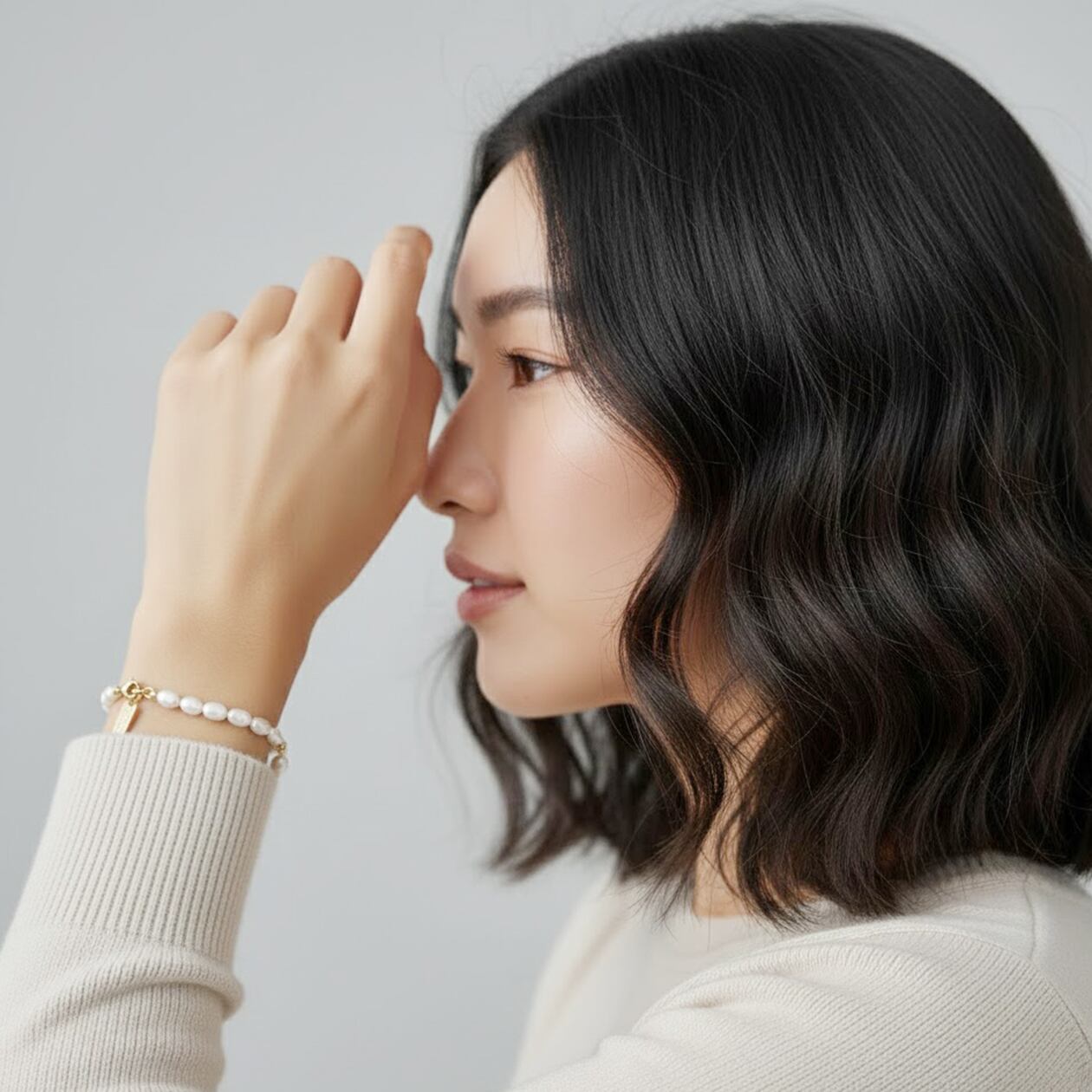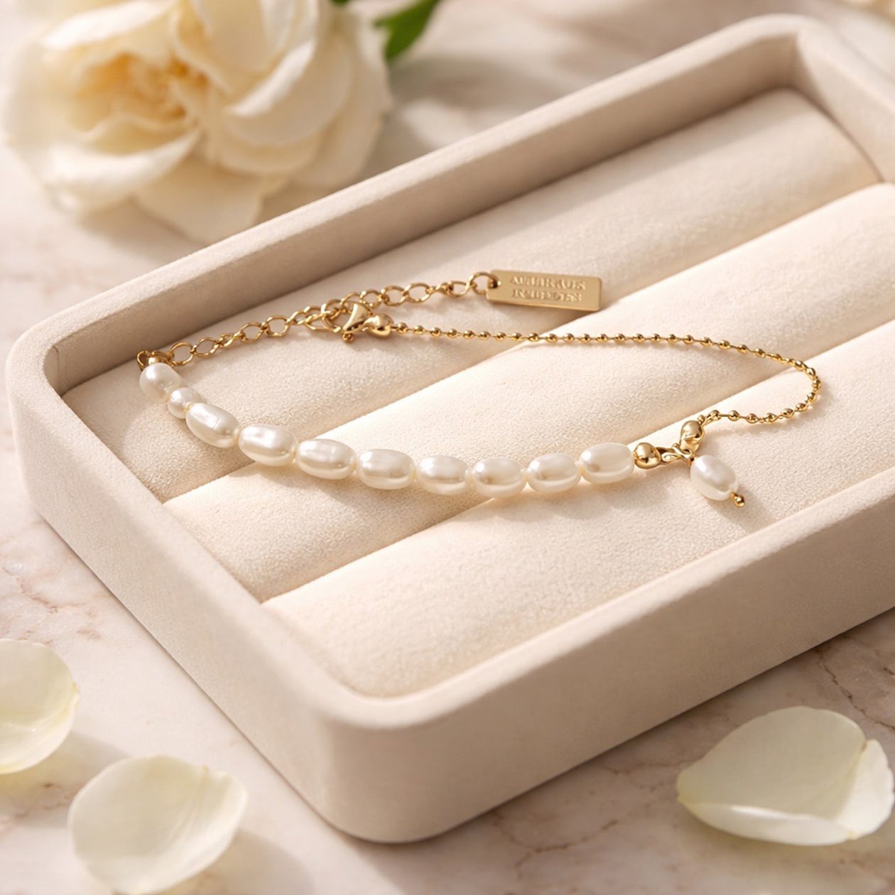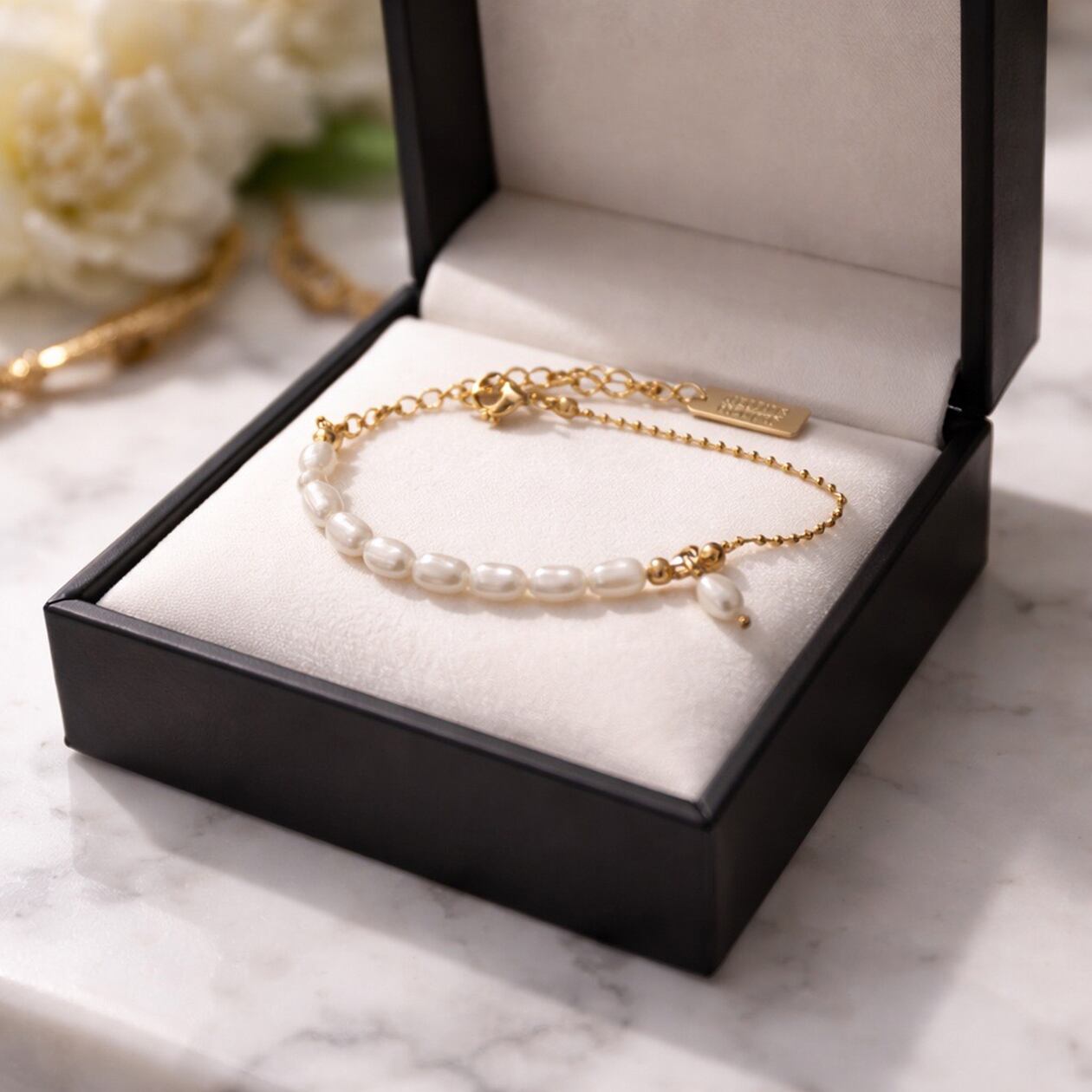 やわらかな艶を持つ淡水パールと、繊細なボールチェーンを組み合わせた上品なブレスレット。異なる質感が引き立て合い、手元にさりげない華やかさを添えてくれます。