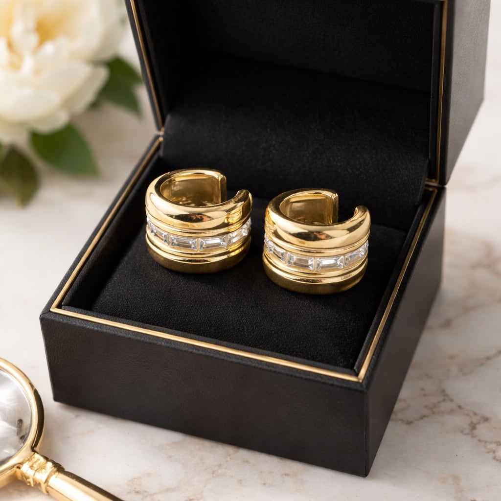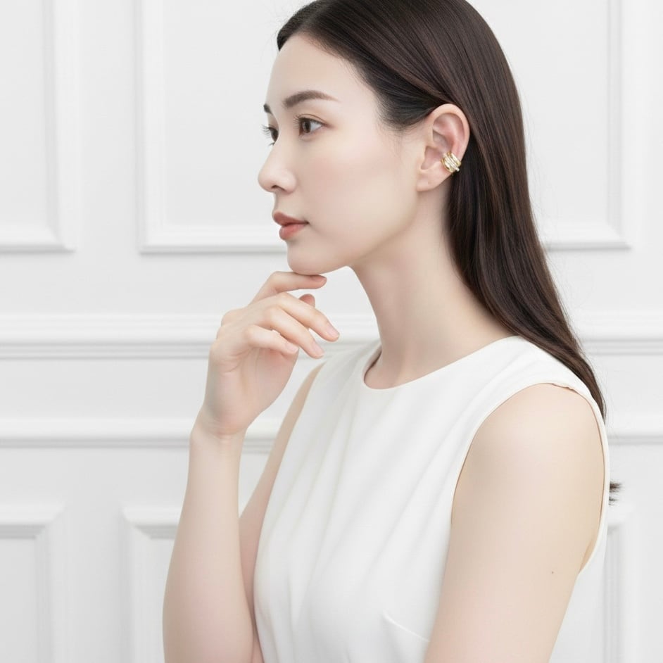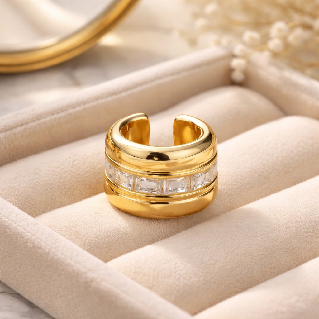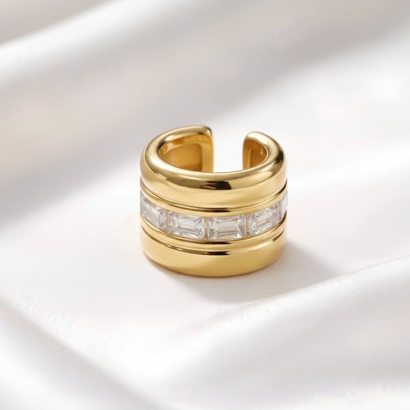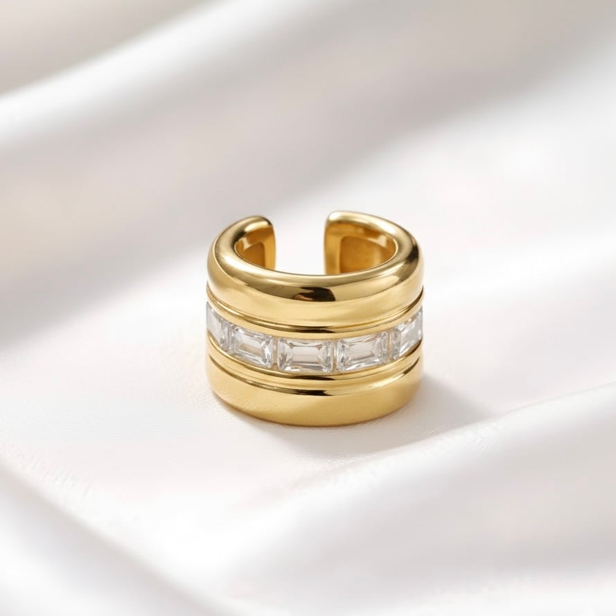 存在感のあるワイドフォルムに、バゲットカットストーンを贅沢にあしらったイヤーカフ。センターに並ぶクリアストーンが上品に輝き、モードで洗練された印象を演出します。片耳用デザインで、ひとつ着けるだけで耳元にアクセントをプラス。きれいめコーデから大人のカジュアルスタイルまで幅広く活躍するアイテムです。