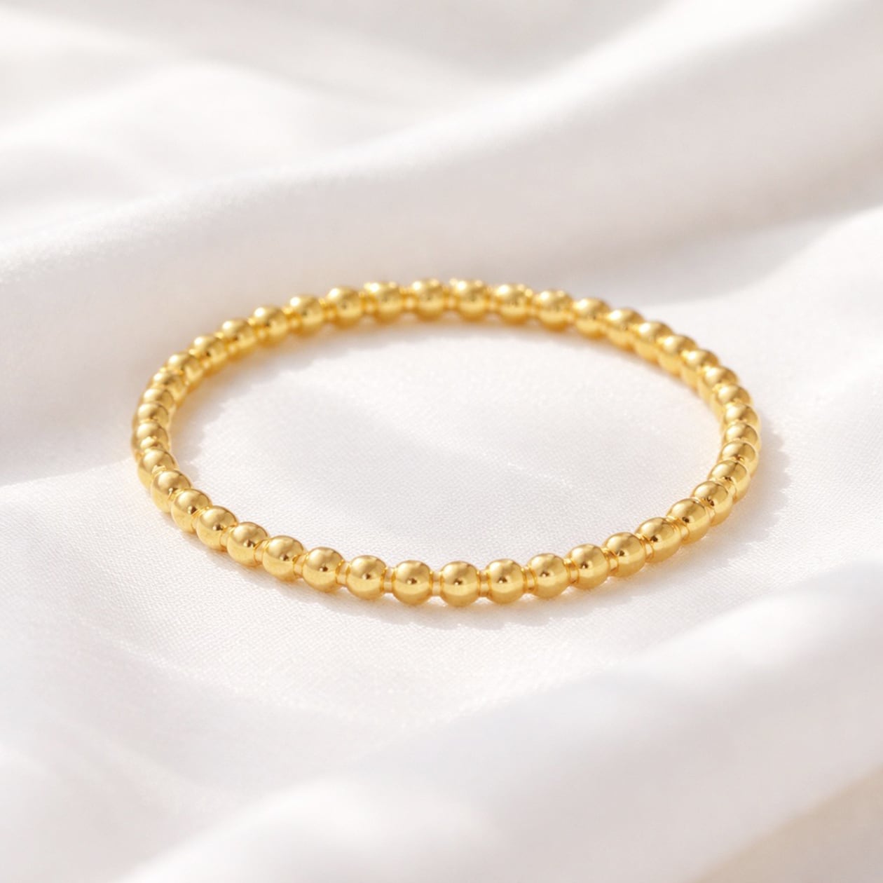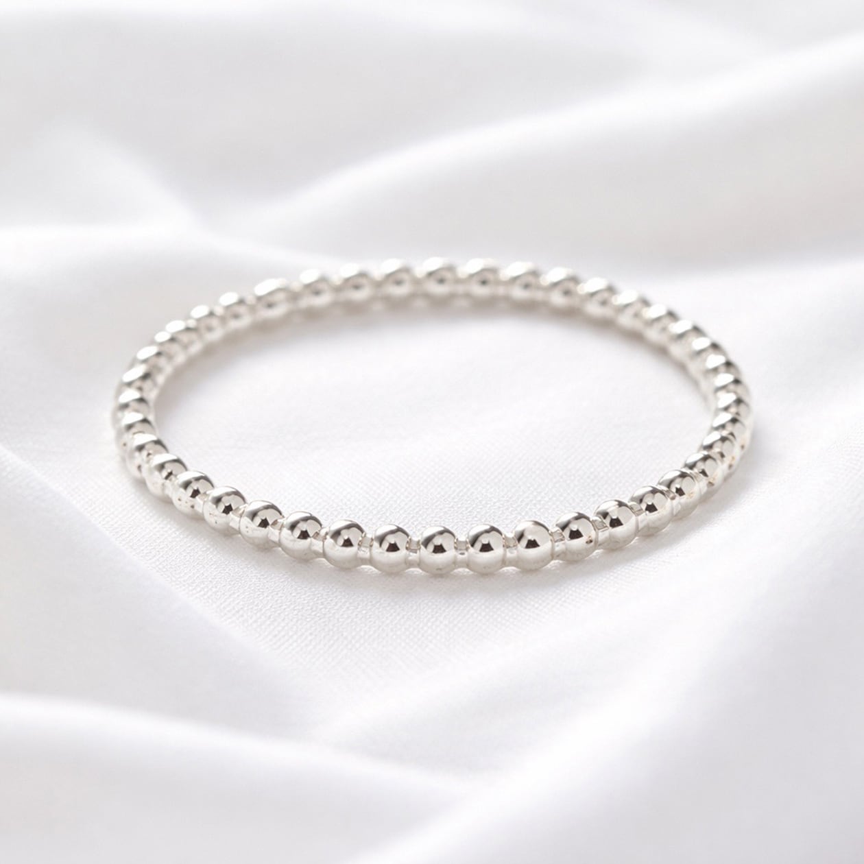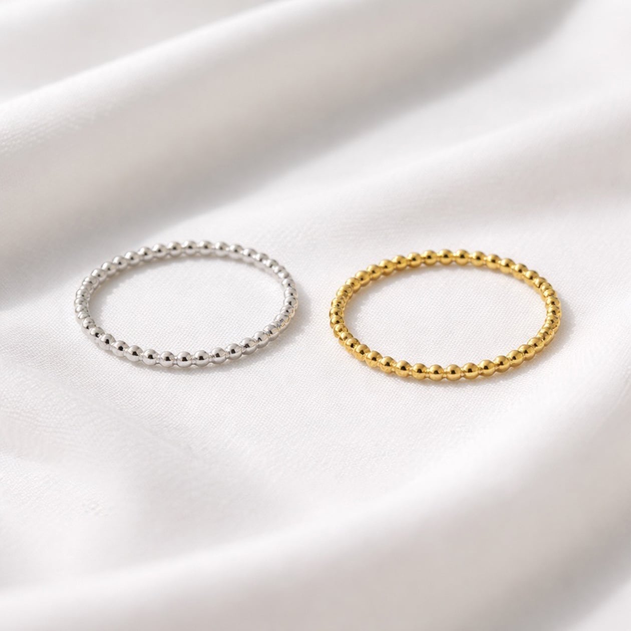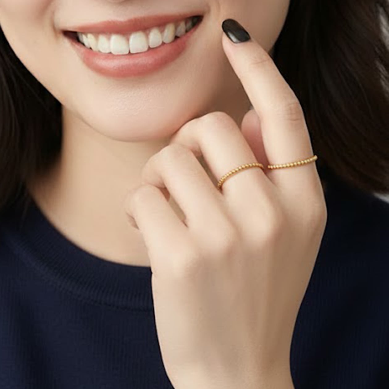 小さなボールを連ねた、繊細で上品なデザインリング。ミニマルながらも光を受けてさりげなく輝き、指先をすっきりと美しく見せてくれます。