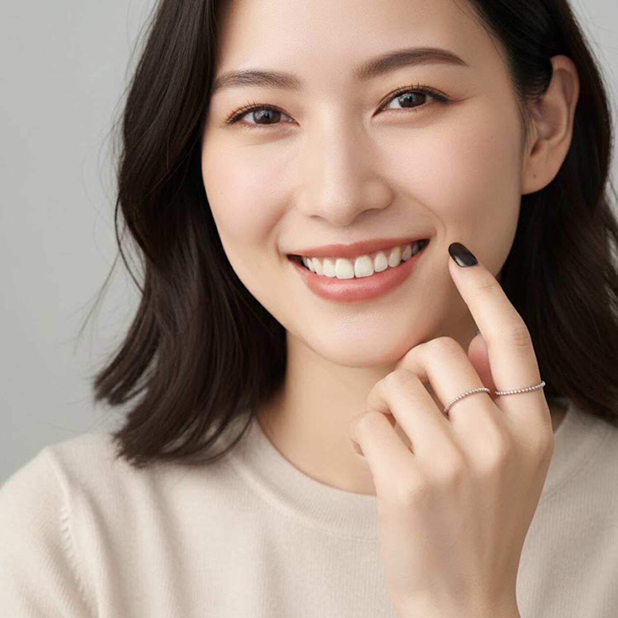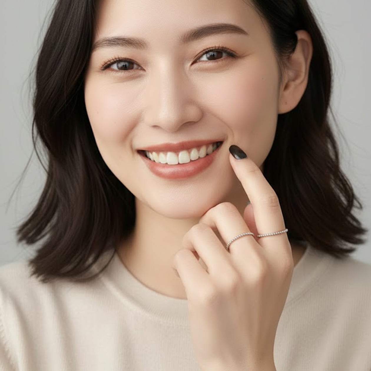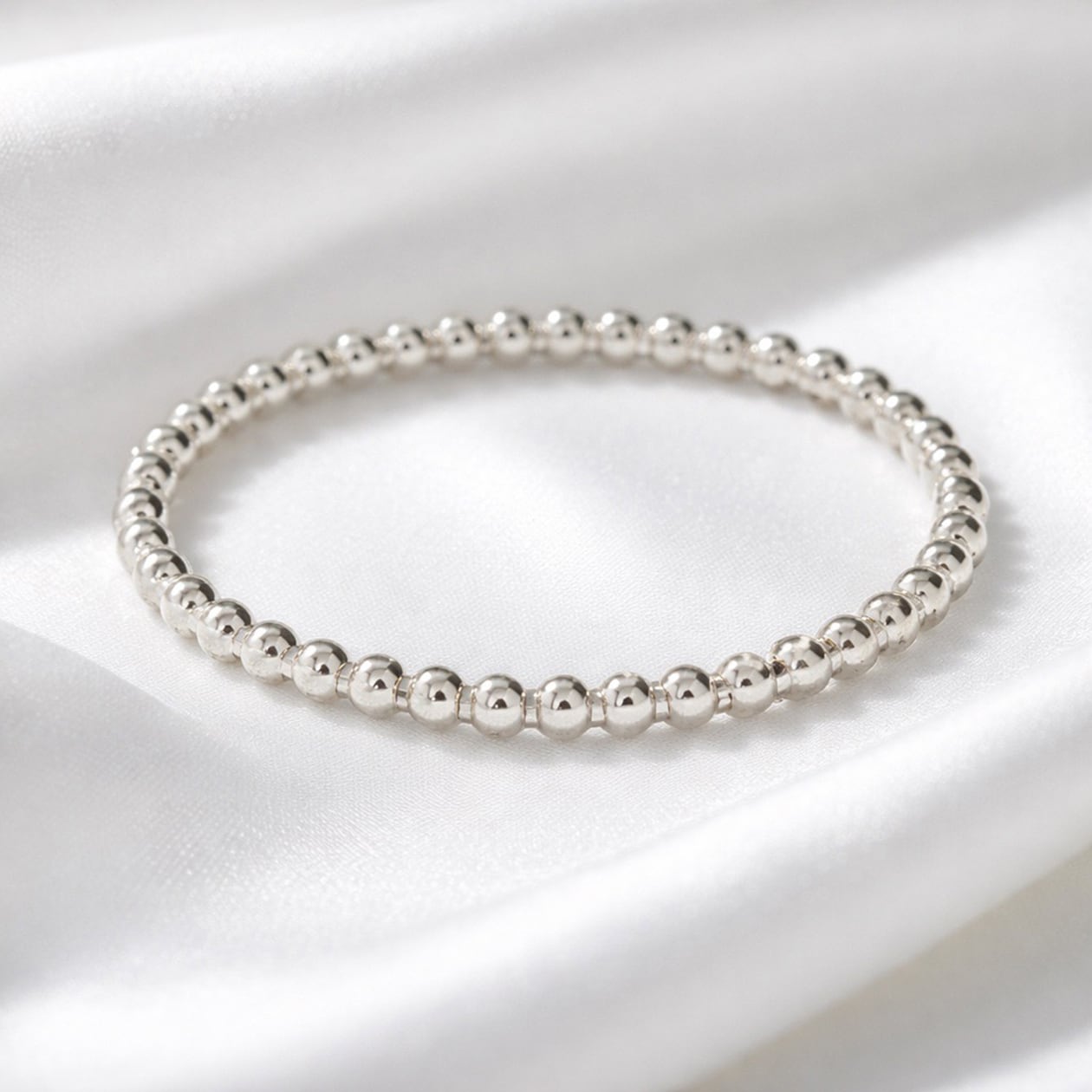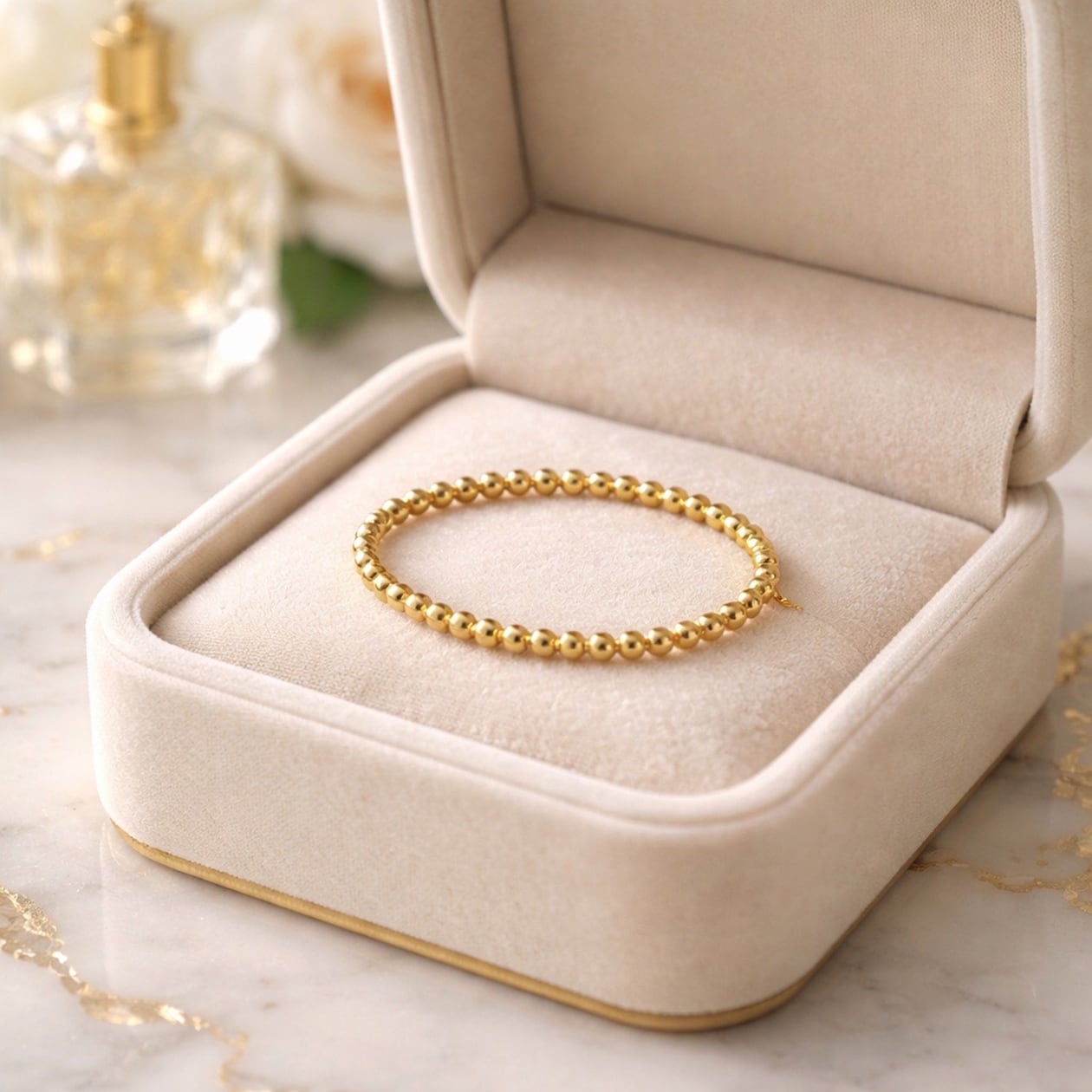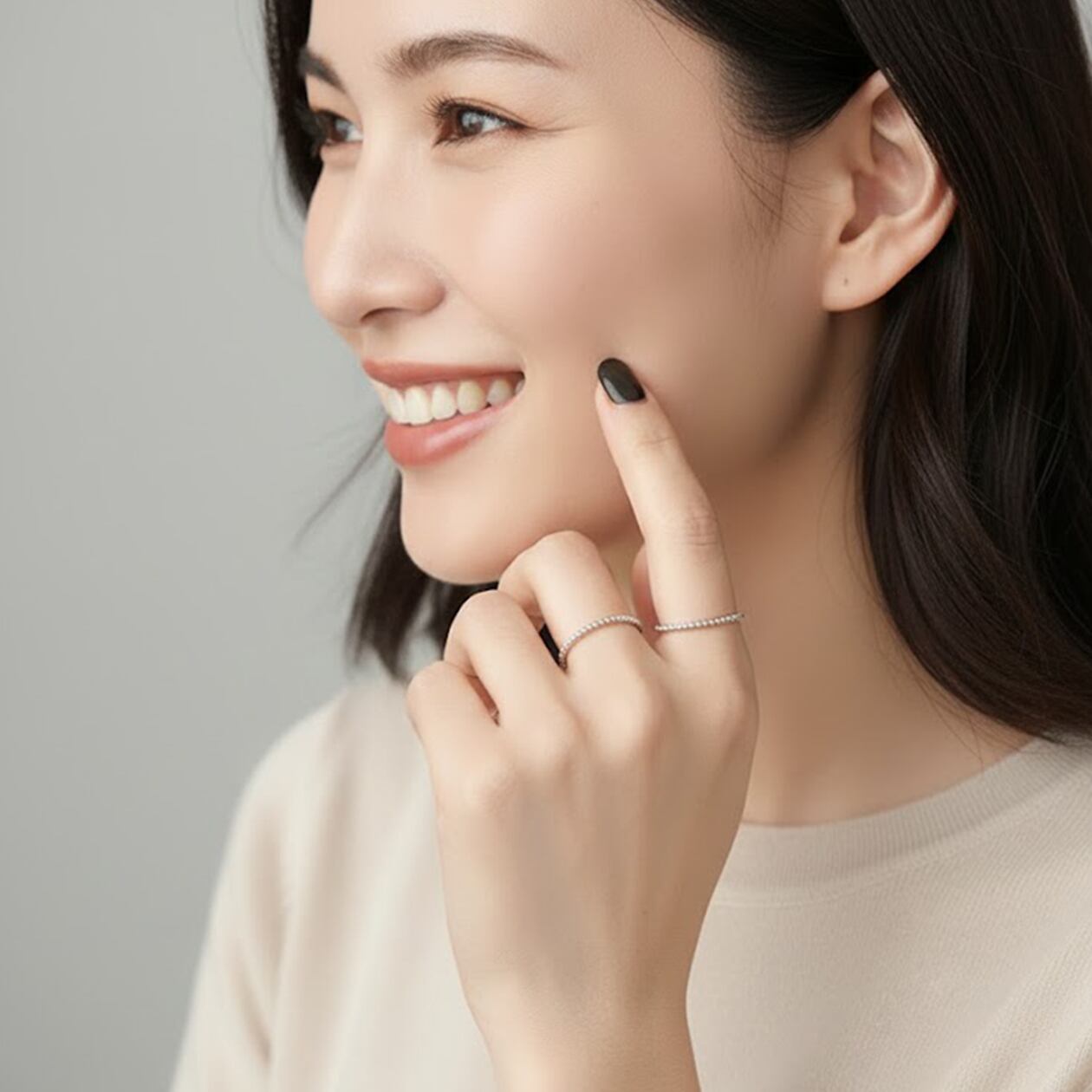 小さなボールを連ねた、繊細で上品なデザインリング。ミニマルながらも光を受けてさりげなく輝き、指先をすっきりと美しく見せてくれます。