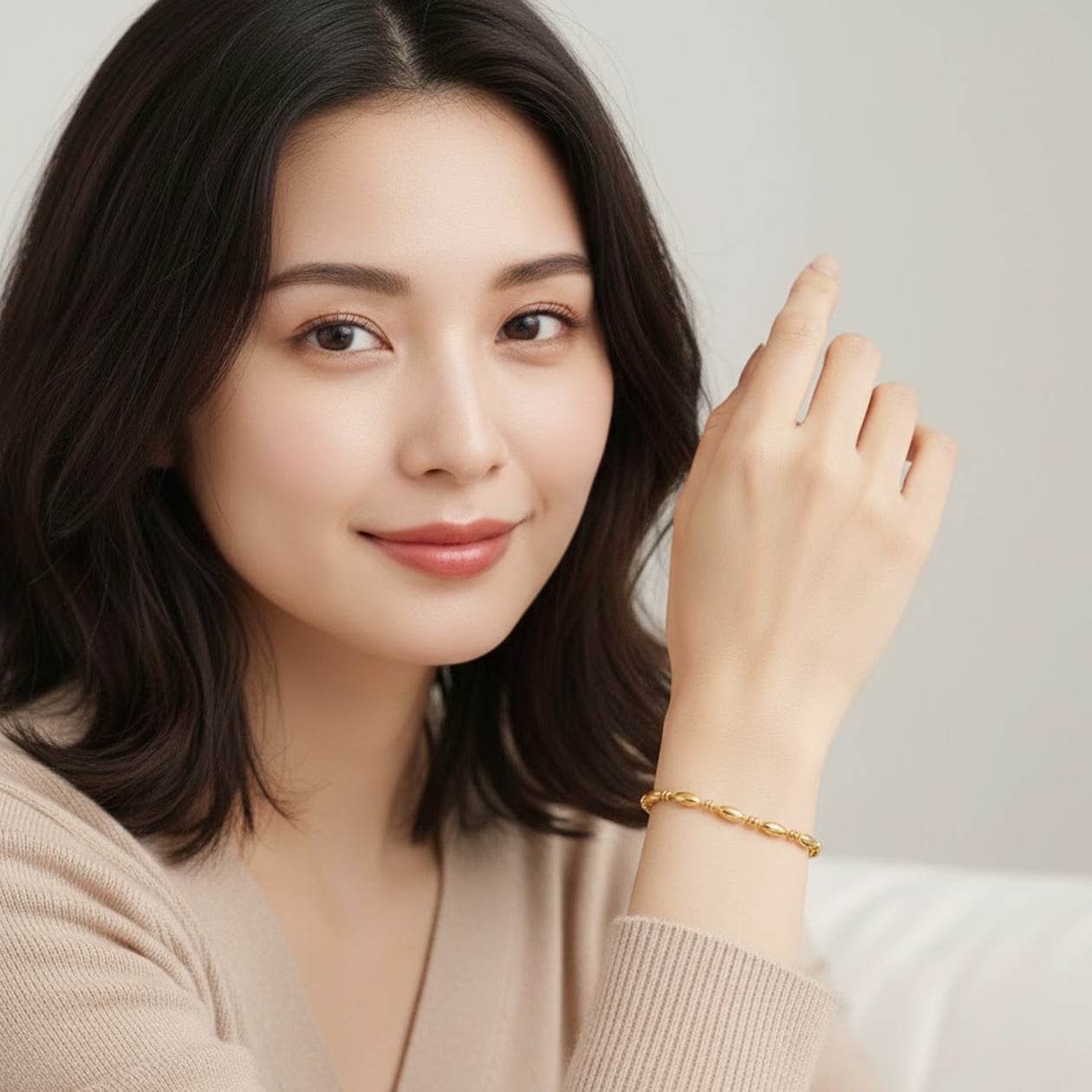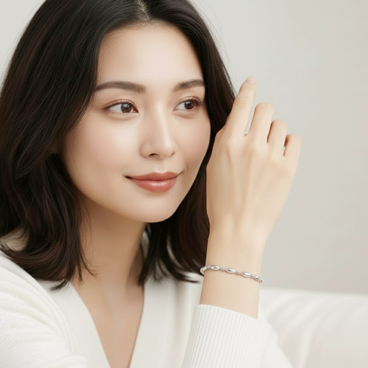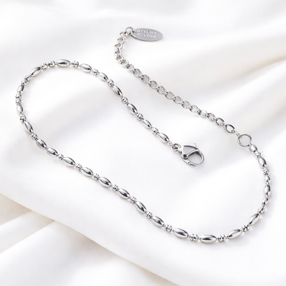 なめらかなオーバルビーズを連ねた、上品な印象のブレスレット。細身ながらも程よい存在感があり、手元をさりげなく華やかに彩ります。