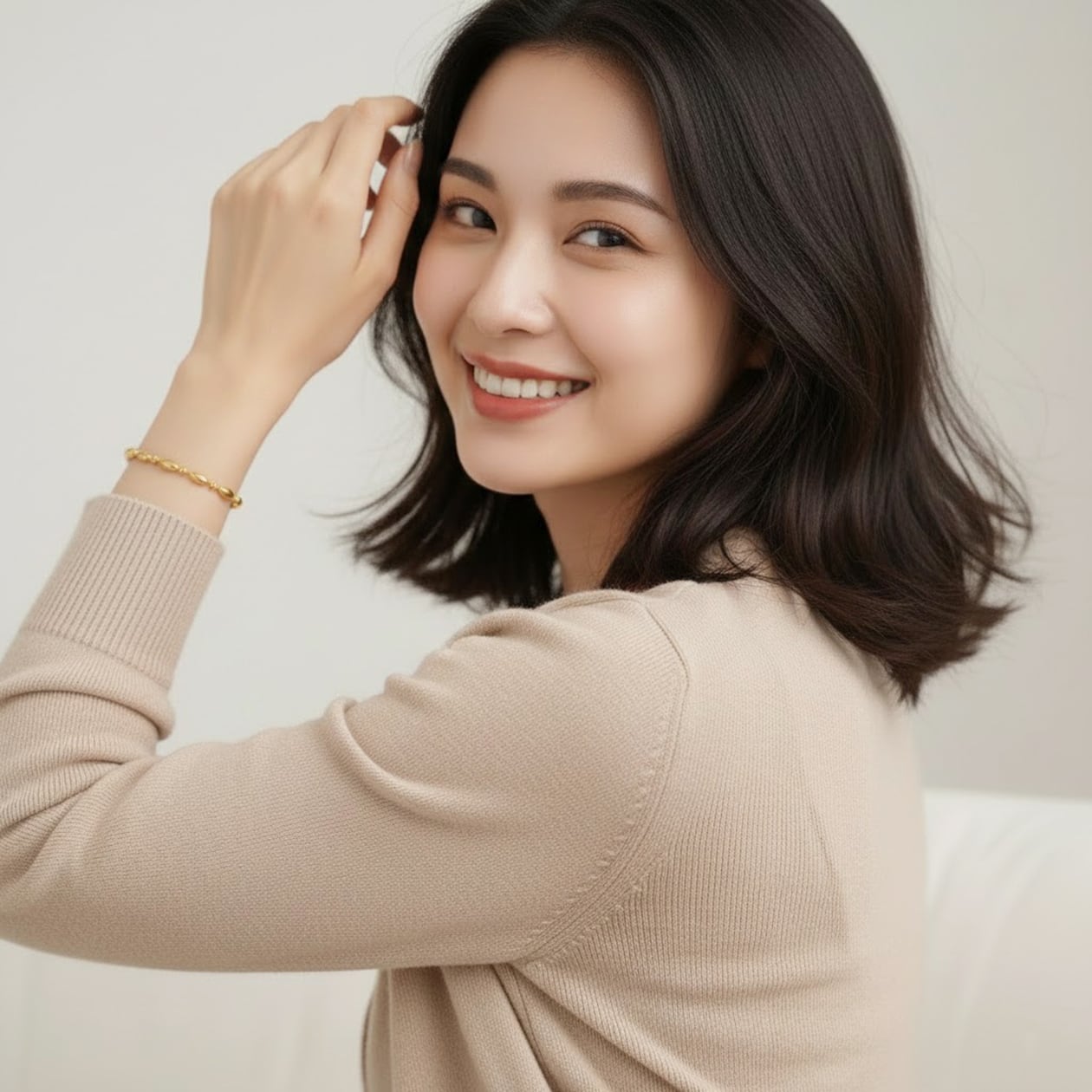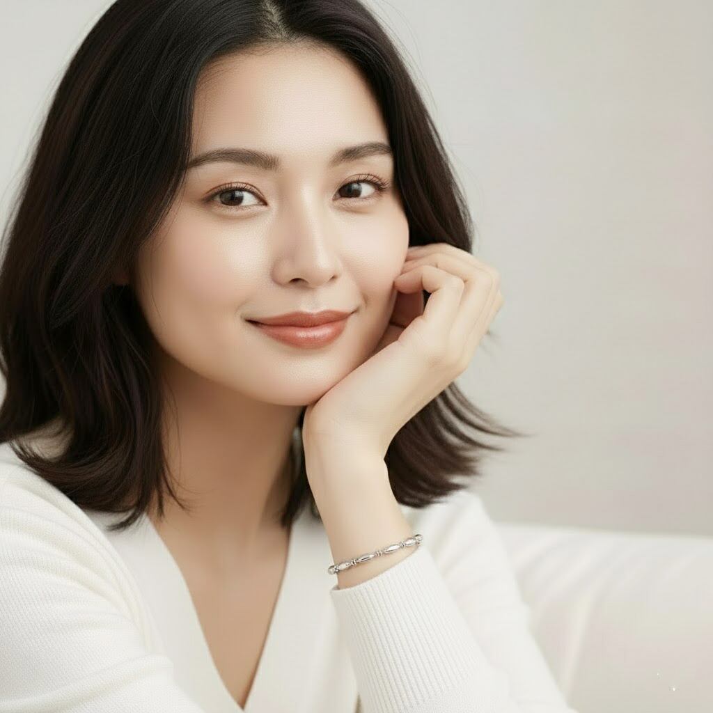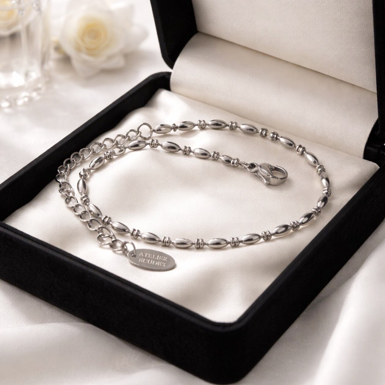 楕円ビーズと小さなパーツのリズムが美しく、動くたびに柔らかな光を反射。ニットやシャツ、フォーマルスタイルにも自然に馴染むデザインです。