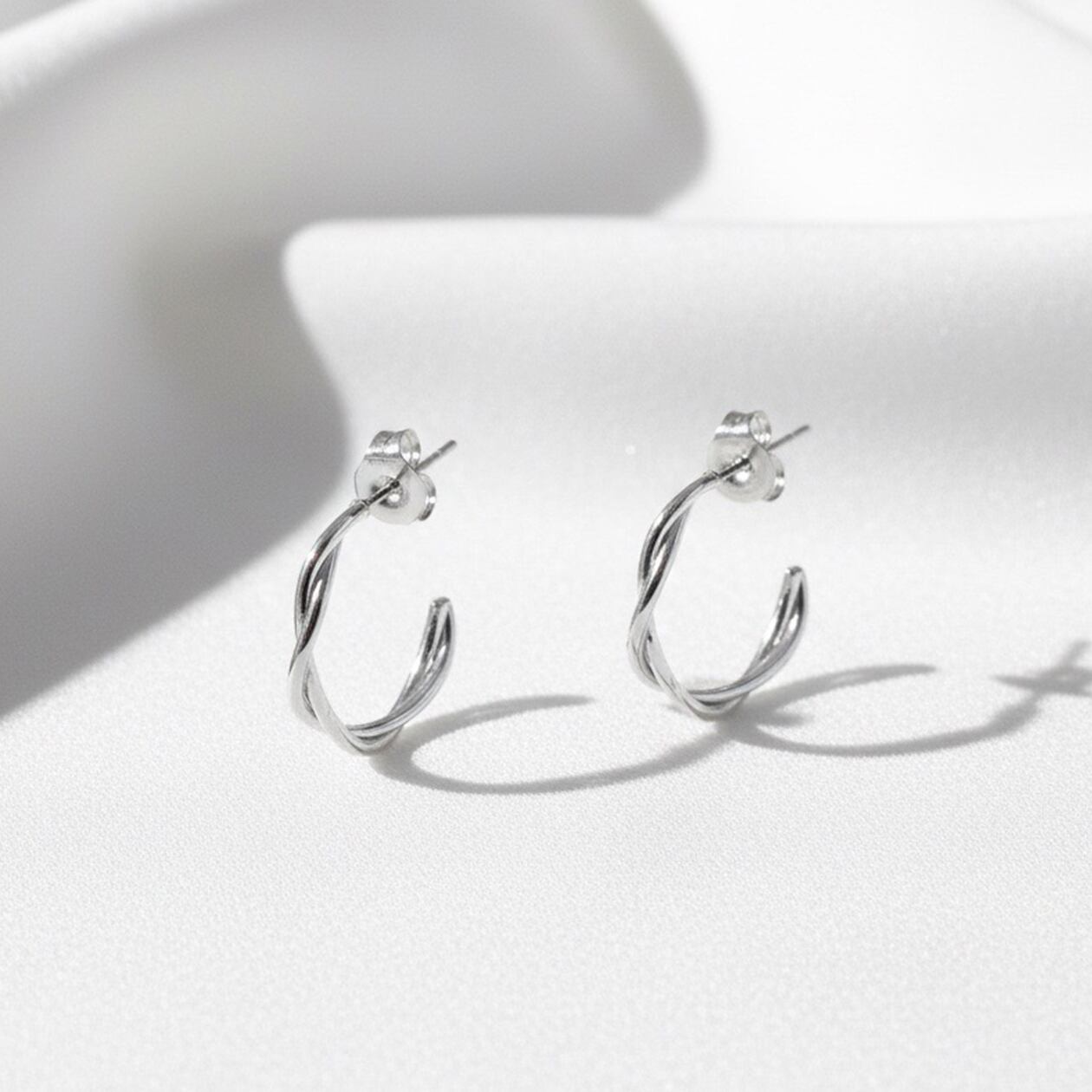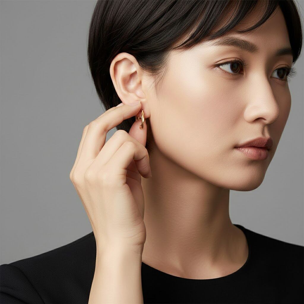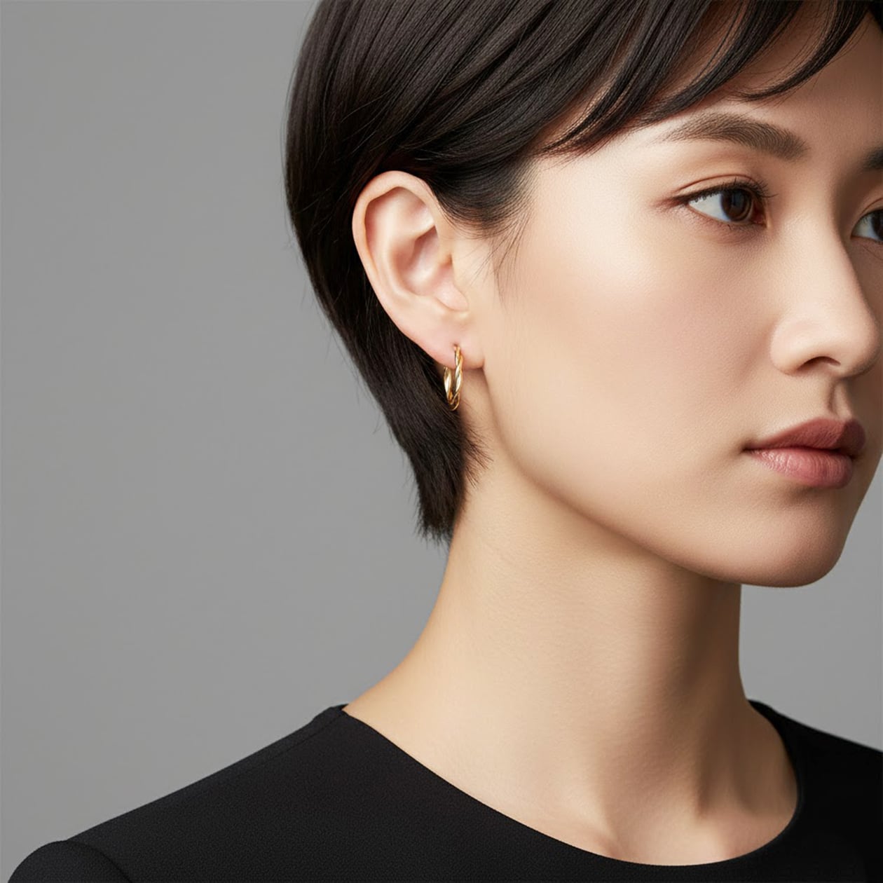 立体的に交差するツイストラインが印象的なフープピアス。シンプルな中に程よい存在感を持たせたデザインで、耳元に上品な立体感と艶をプラスします。小ぶりすぎず大きすぎない絶妙なサイズ感で、デイリーからきれいめスタイルまで幅広く活躍。流れるような曲線が女性らしい柔らかさを演出し、ひとつ着けるだけでコーディネートが洗練された印象に。カジュアル・オフィス・セレモニーシーンにも取り入れやすい万能フープピアスです。