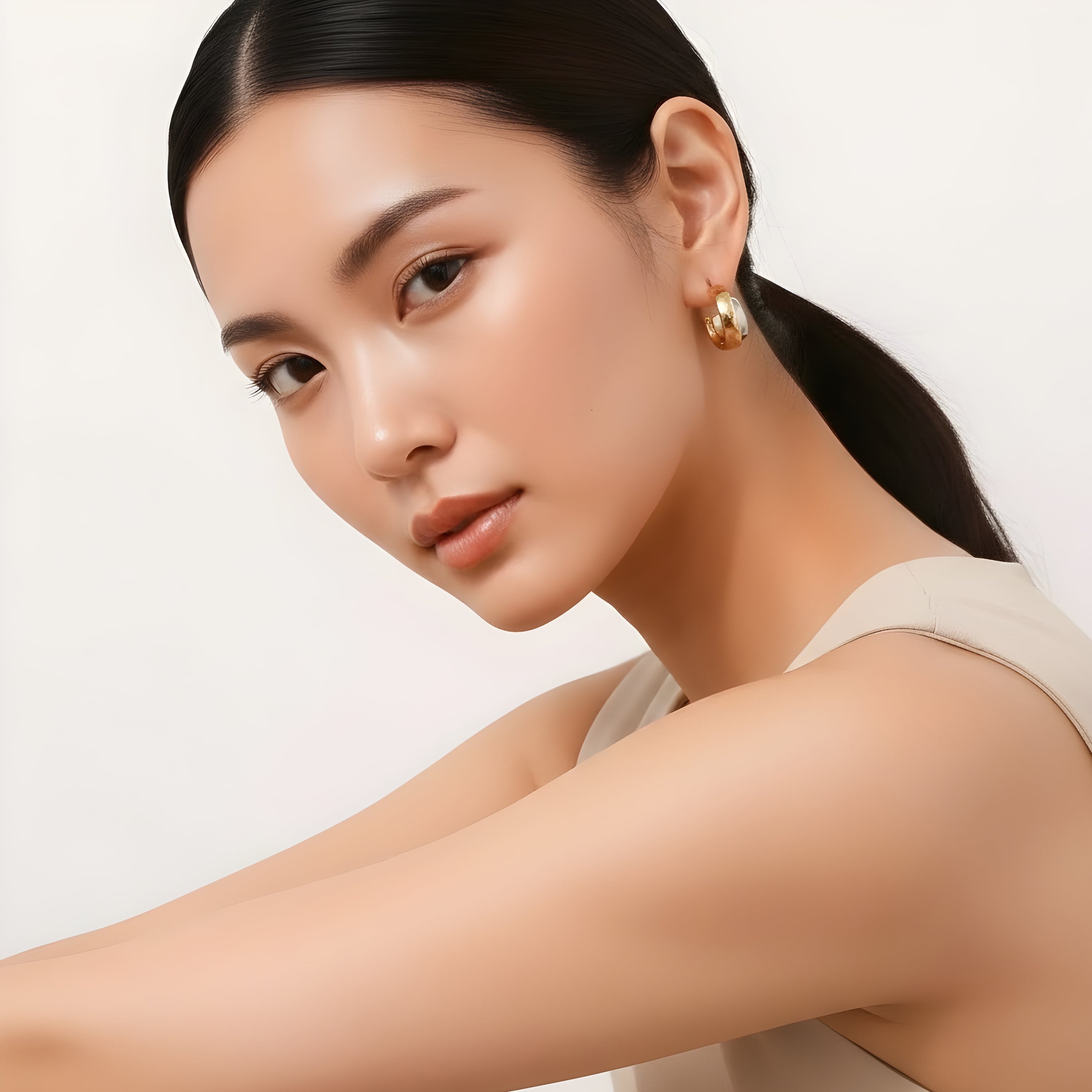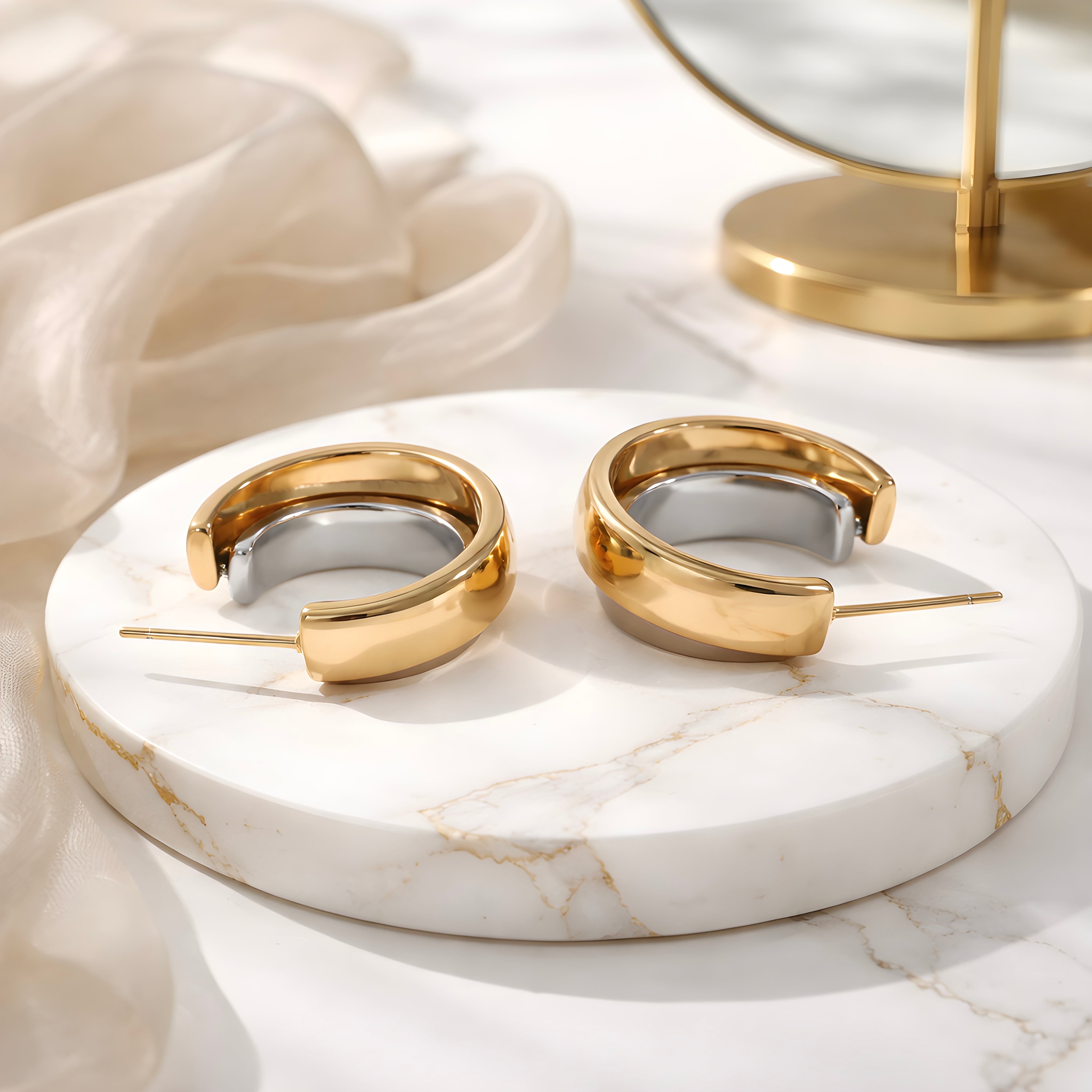 左右でゴールドとシルバーの配置が異なる、FUSIONシリーズのバイカラーフープピアス。程よい厚みと丸みを帯びた立体フォルムが耳元に上品な存在感を与え、シンプルな装いを洗練された印象へ導きます。コンビカラー仕様で他のアクセサリーとも合わせやすく、モードからきれいめスタイルまで幅広く活躍します。