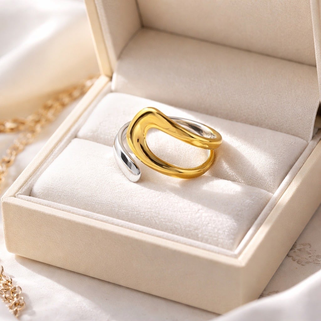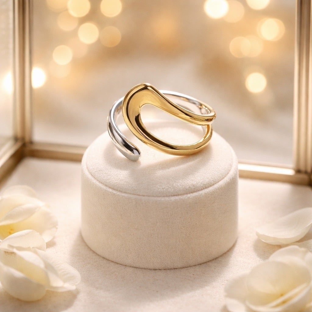 滑らかなカーブラインが指元を美しく見せる、FUSIONシリーズのバイカラーオープンカーブリング。ゴールドとシルバーのコンビカラーが重なり合う立体フォルムで、シンプルながら存在感のあるデザインに仕上げました。柔らかな曲線が指に自然に馴染み、ひとつでコーディネートのアクセントになるリングです。