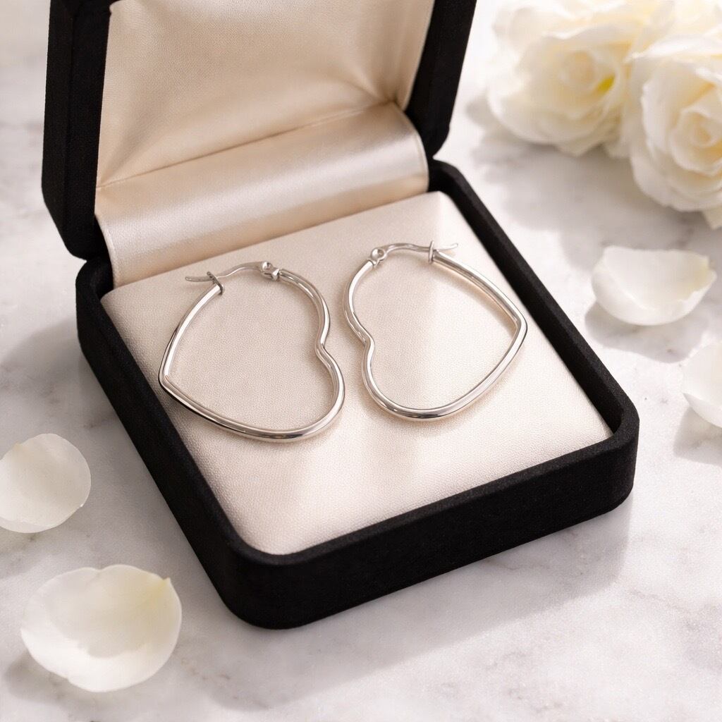 存在感のあるハートフォルムが印象的なハートフープピアス。大きめサイズのハートシルエットが耳元で美しく揺れ、コーディネートのアクセントになるデザインです。キャッチ不要のワンタッチタイプで着脱もスムーズ。シンプルな線のハートデザインなので甘くなりすぎず、大人のカジュアルスタイルにも合わせやすいアイテムです。