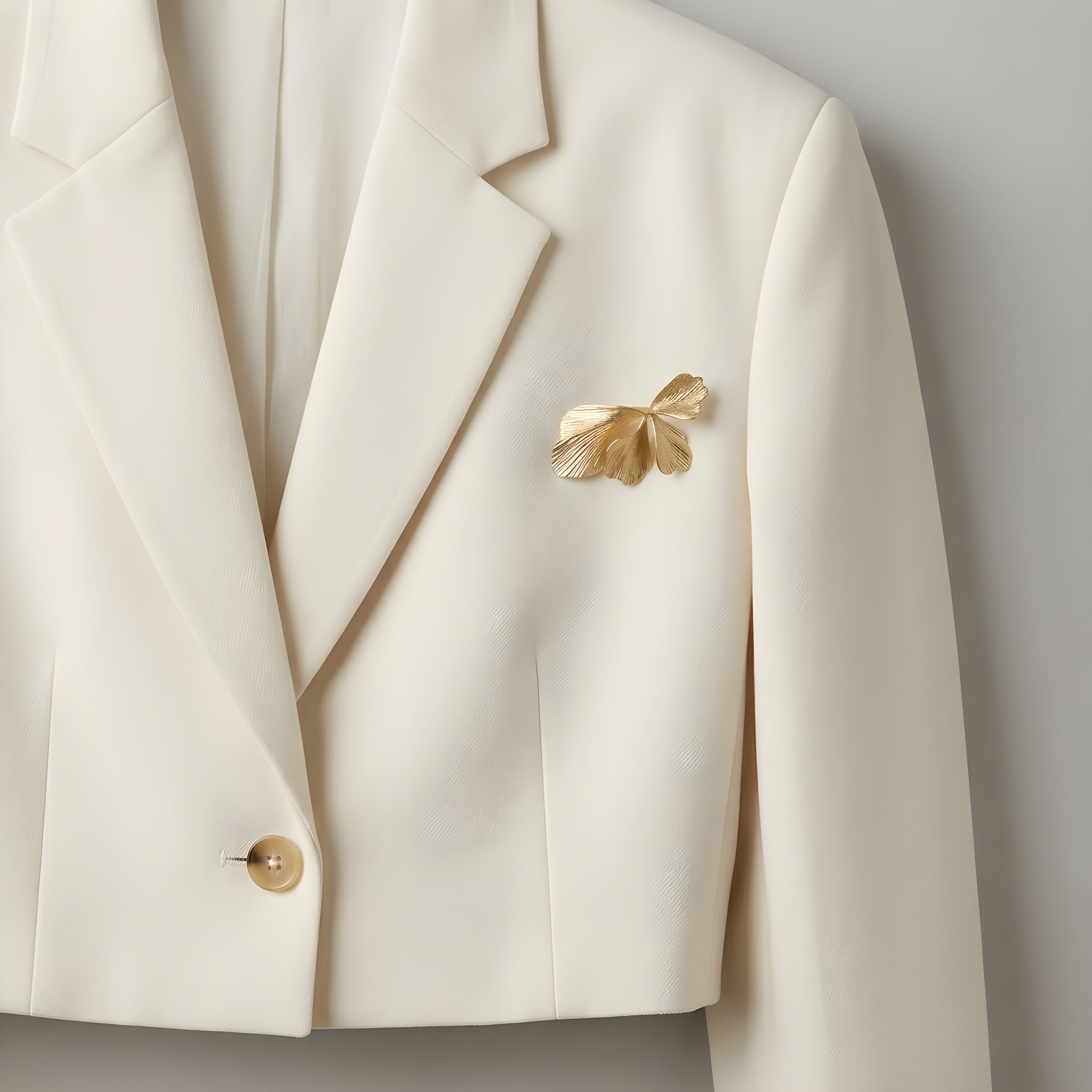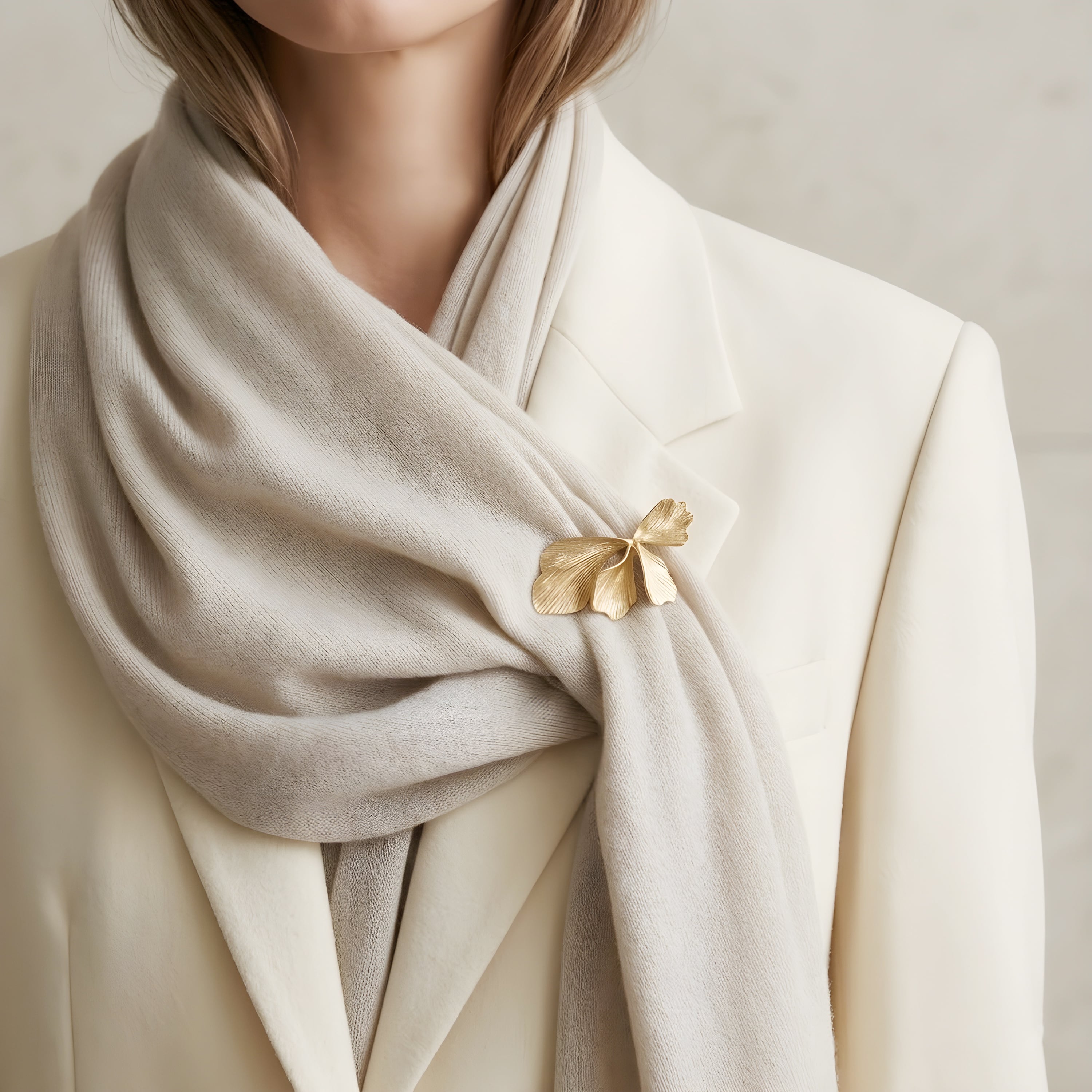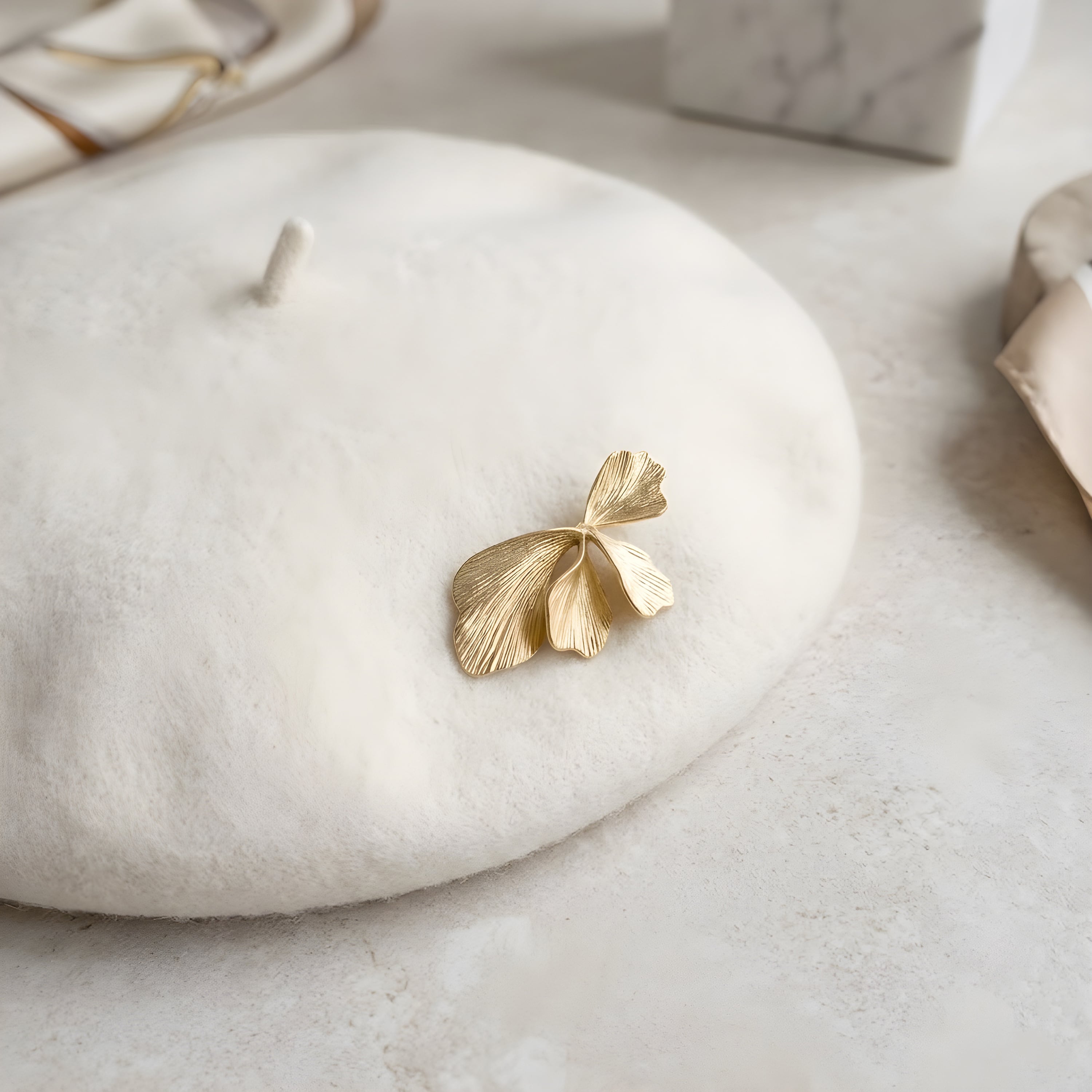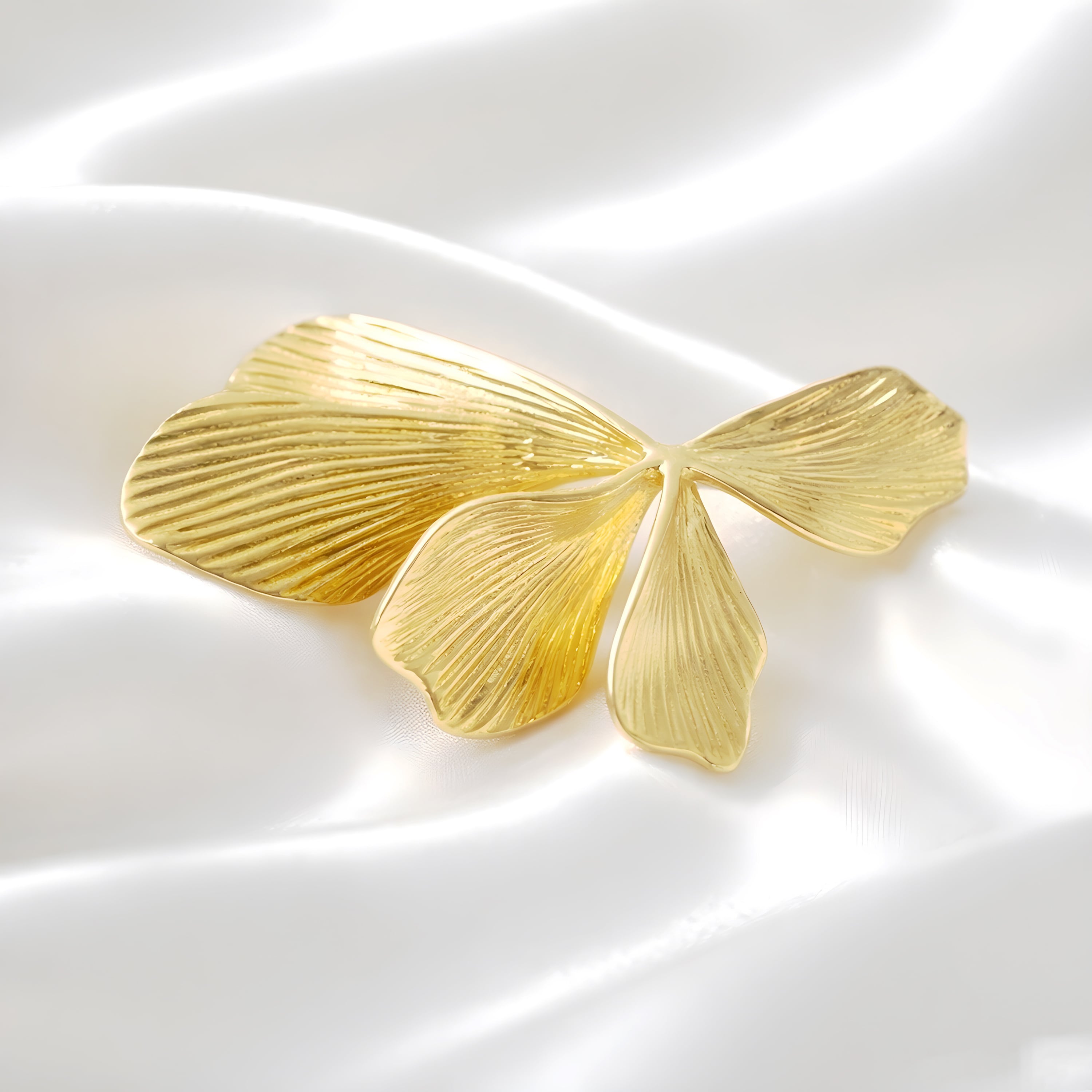 リボンのようにやわらかく広がるフォルムが印象的な、イチョウモチーフのブローチ。葉が重なり合うような立体的なデザインは、動きのある美しいシルエットを生み出し、さりげなく上品な存在感を演出します。繊細な葉脈のテクスチャーと、なめらかな曲線が光を受けてやさしく輝き、ミニマルながらも洗練された印象に。ジャケットやコート、ストールに添えるだけで、コーディネートに自然な華やかさをプラスします。