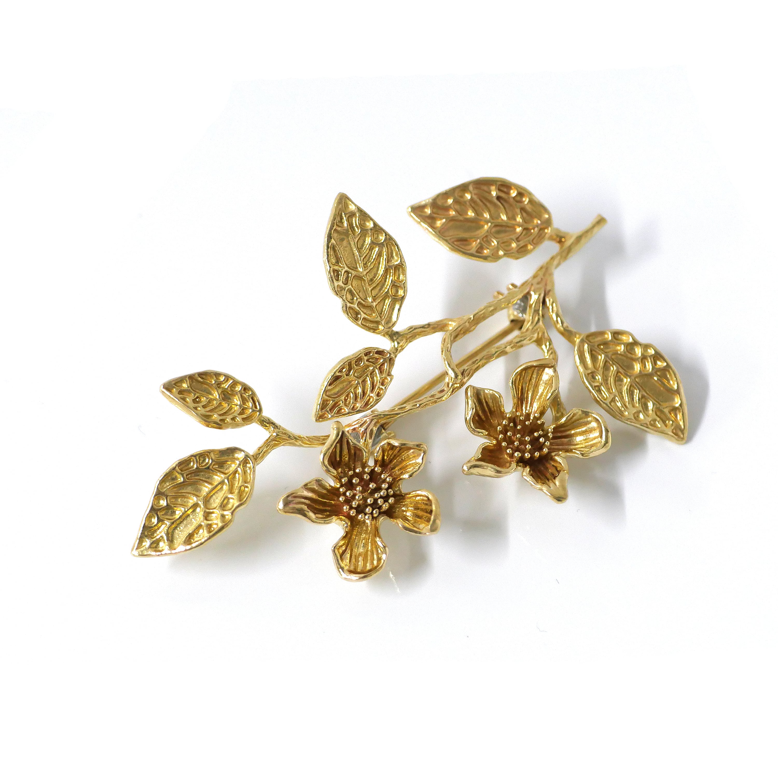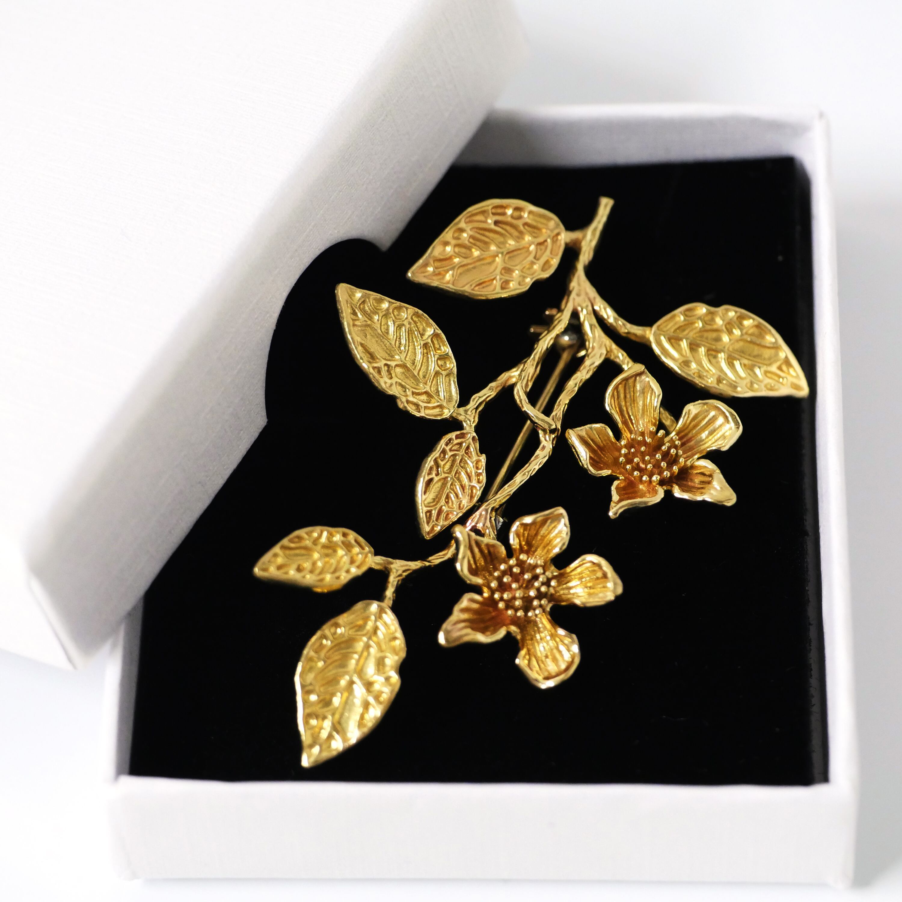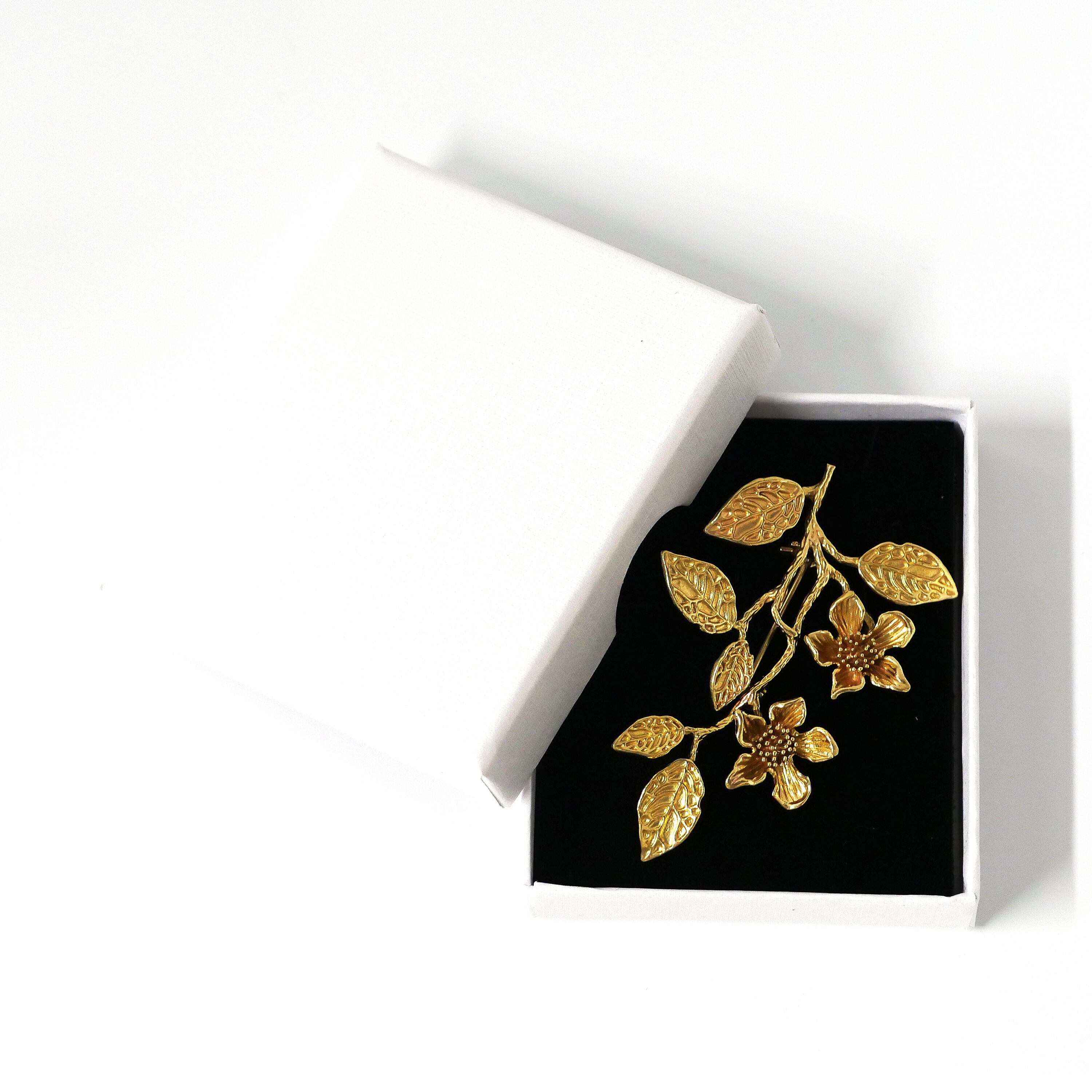 繊細な枝に咲く花と葉を組み合わせた、アンティーク調のボタニカルブローチ。立体的に広がるリーフとフラワーモチーフが自然な動きを生み出し、クラシカルで上品な印象に仕上げました。