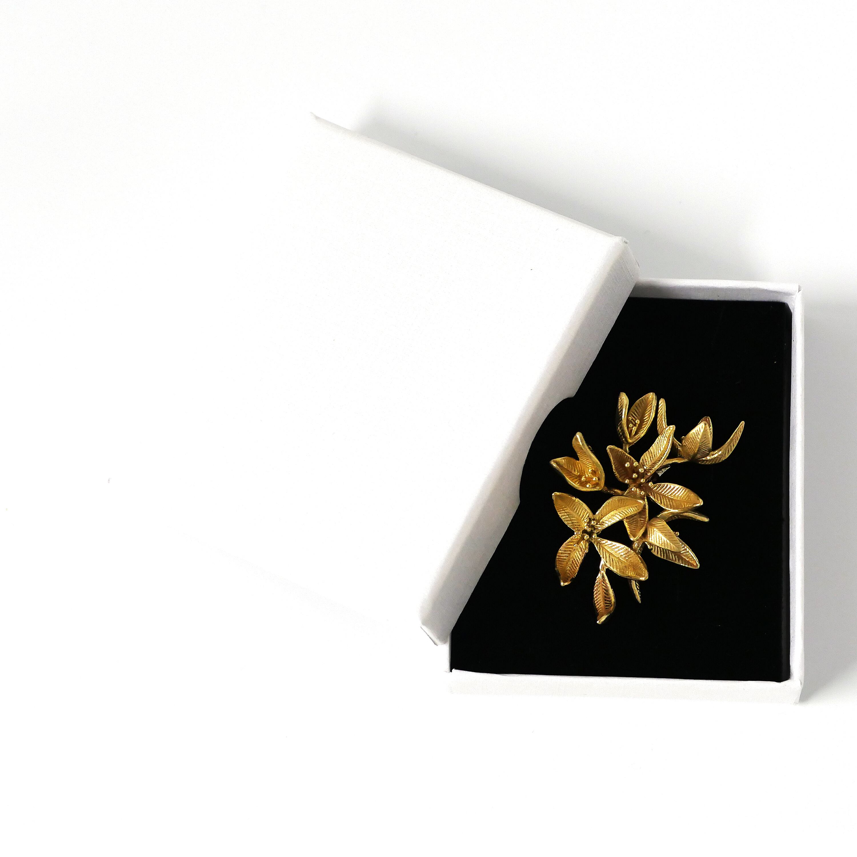繊細な花と葉を重ねたボタニカルデザインのゴールドブローチ。立体感のあるフラワーモチーフがやわらかな光を反射し、上品で華やかな印象を与えます。ナチュラルで軽やかなフォルムは、ジャケットやコート、ワンピースなど幅広いコーディネートに合わせやすく、日常使いからフォーマルシーンまで活躍。シンプルながら存在感のあるデザインで、大人の装いにさりげないアクセントを添えるアイテムです。ギフトにもおすすめのブローチです。