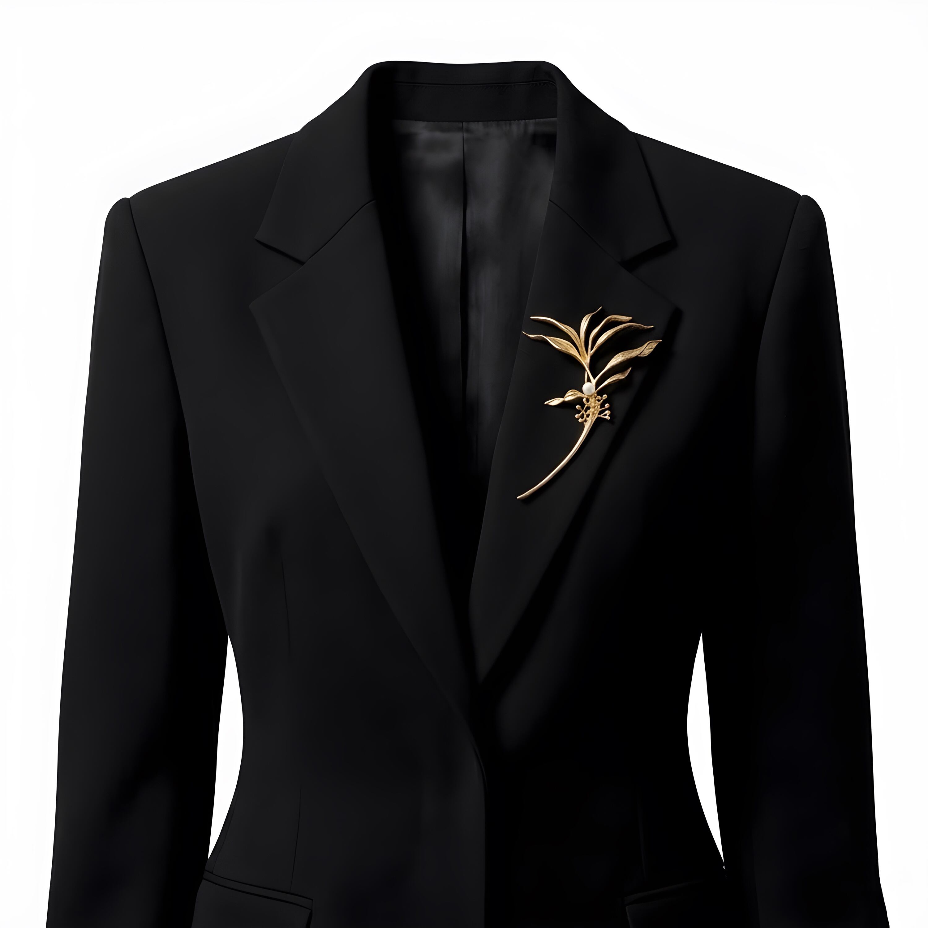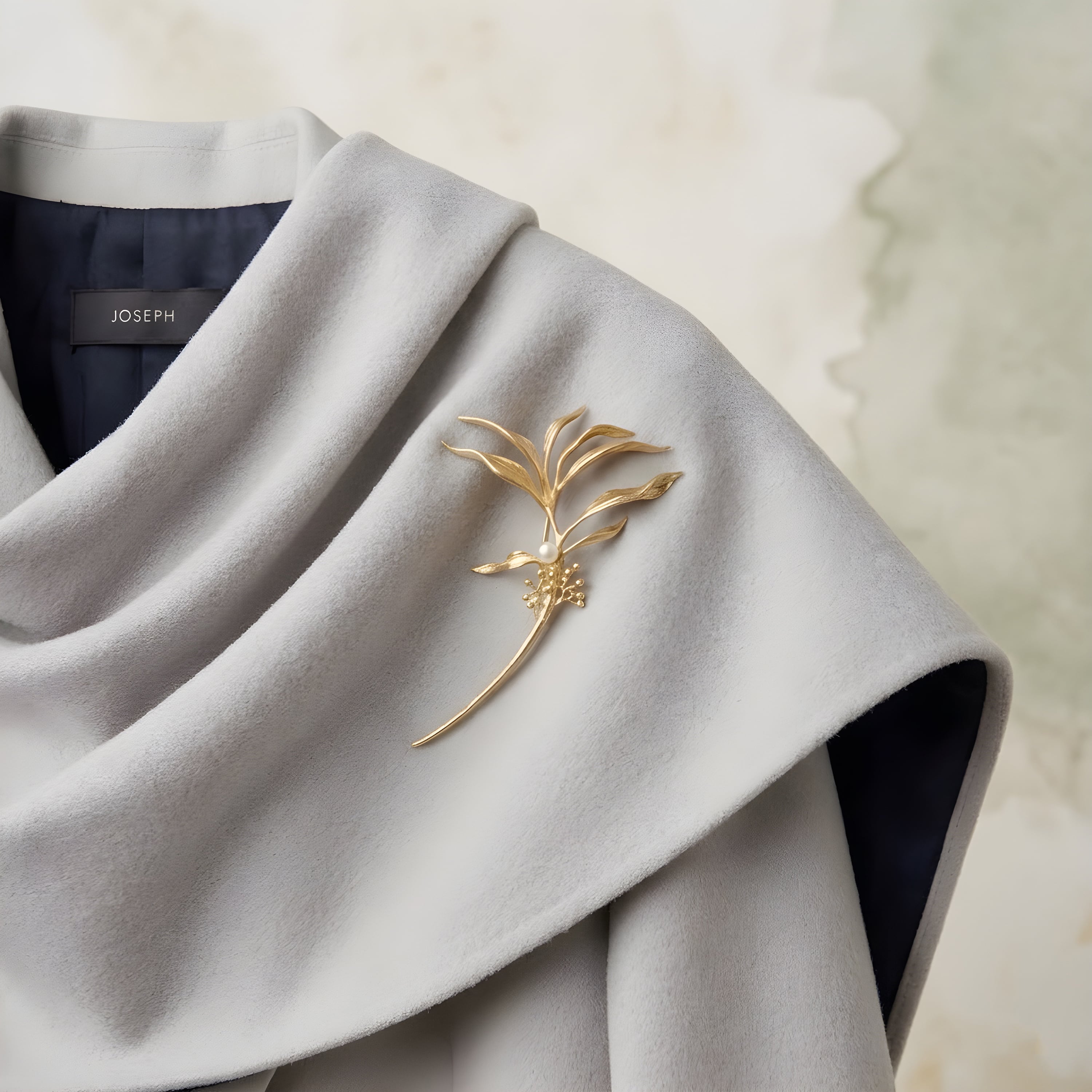 繊細に伸びるリーフラインにパールをあしらった、上品で洗練された印象のゴールドブローチ。縦に流れるシルエットが装いにすっきりとしたアクセントを添え、スタイルを美しく引き立てます。立体的な葉のデザインが光をやわらかく反射し、落ち着いた華やかさを演出。ジャケットやコート、ワンピースなど幅広いコーディネートに馴染み、フォーマルから日常使いまで活躍します。大人の装いに品格を添える、ボタニカルテイストのブローチです。