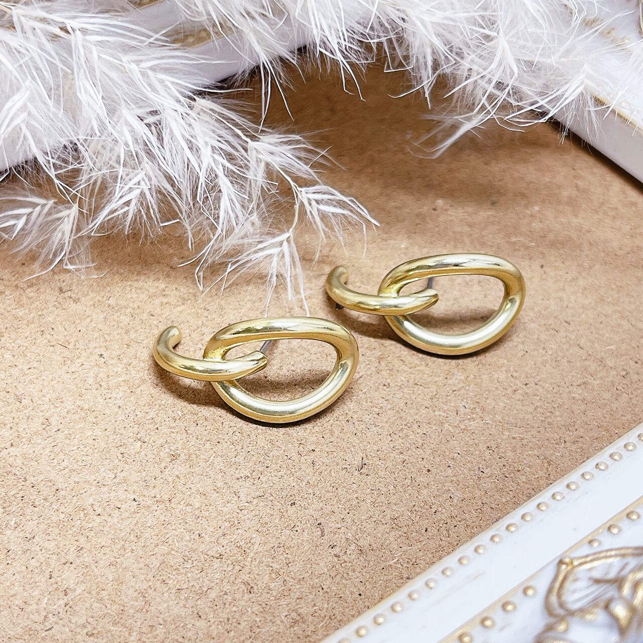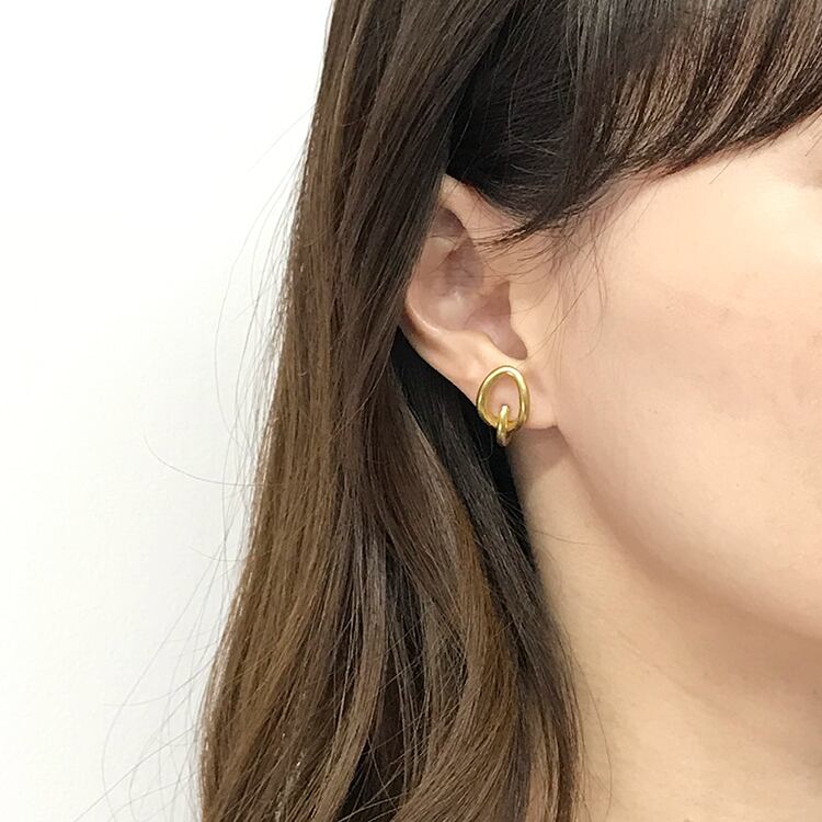 耳たぶを包み込むような柔らかな楕円フォルムが印象的な、真鍮製スタッドピアス。シンプルでありながらも立体感のあるデザインが、顔まわりに上品な陰影を添えます。楕円形と滑らかな曲線が繋がるフォルムは、どの角度から見ても美しく、デイリーにもフォーマルにも映えるシックな仕上がりです。