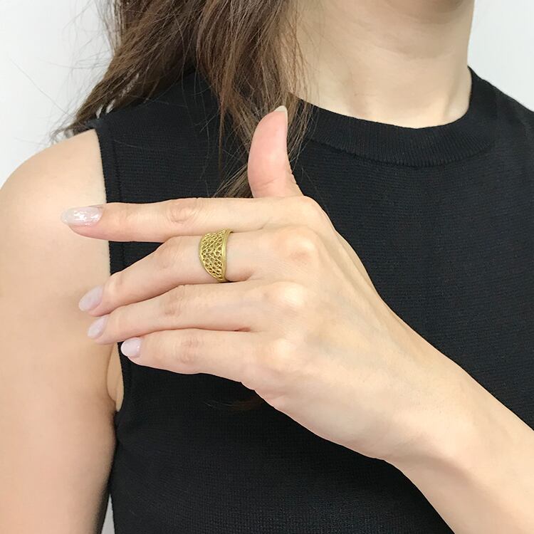 繊細なハートモチーフを全体にあしらった、優美でフェミニンな印象のオープンリング。指を包み込むように滑らかにカーブするデザインが、女性らしい手元を演出します。透かしのある軽やかなフォルムで、大ぶりながらも快適な着け心地。日常使いから特別なシーンまで、華やかに指先を彩るデザインリングです。