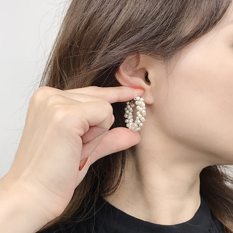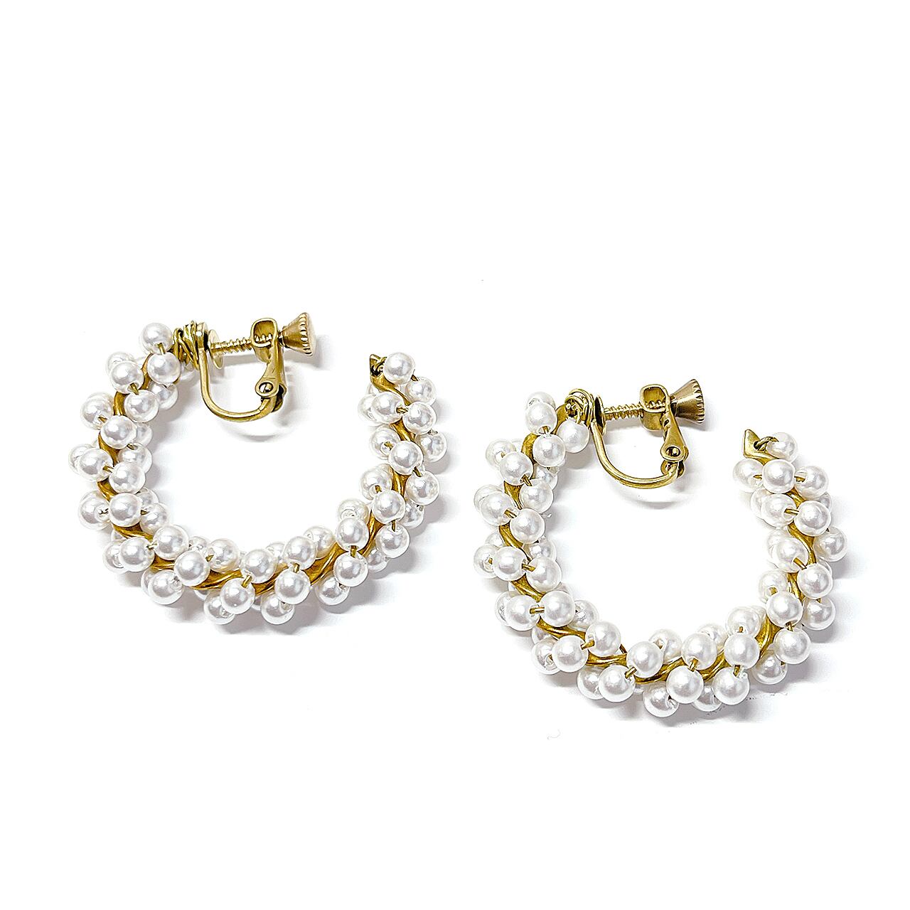 小粒のガラスパールを真鍮線にしっかりと巻きつけて豪華で華やかに仕上げたネジバネ式イヤリングです。お出かけやお呼ばれ、パーティーにぴったりな上品でエレガントなデザインイヤリングです。