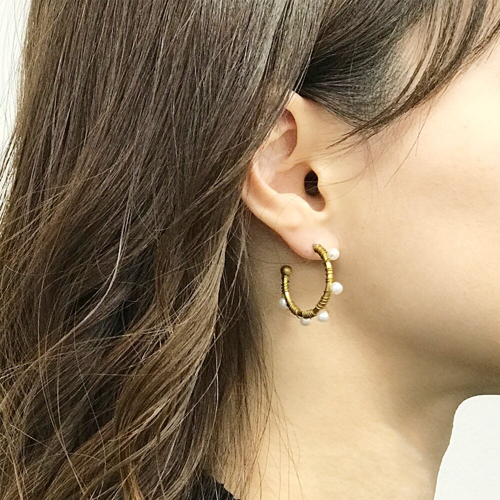 小粒のガラスパールを5粒、丁寧に真鍮フープへ手巻きで仕上げた上品なフープピアス。