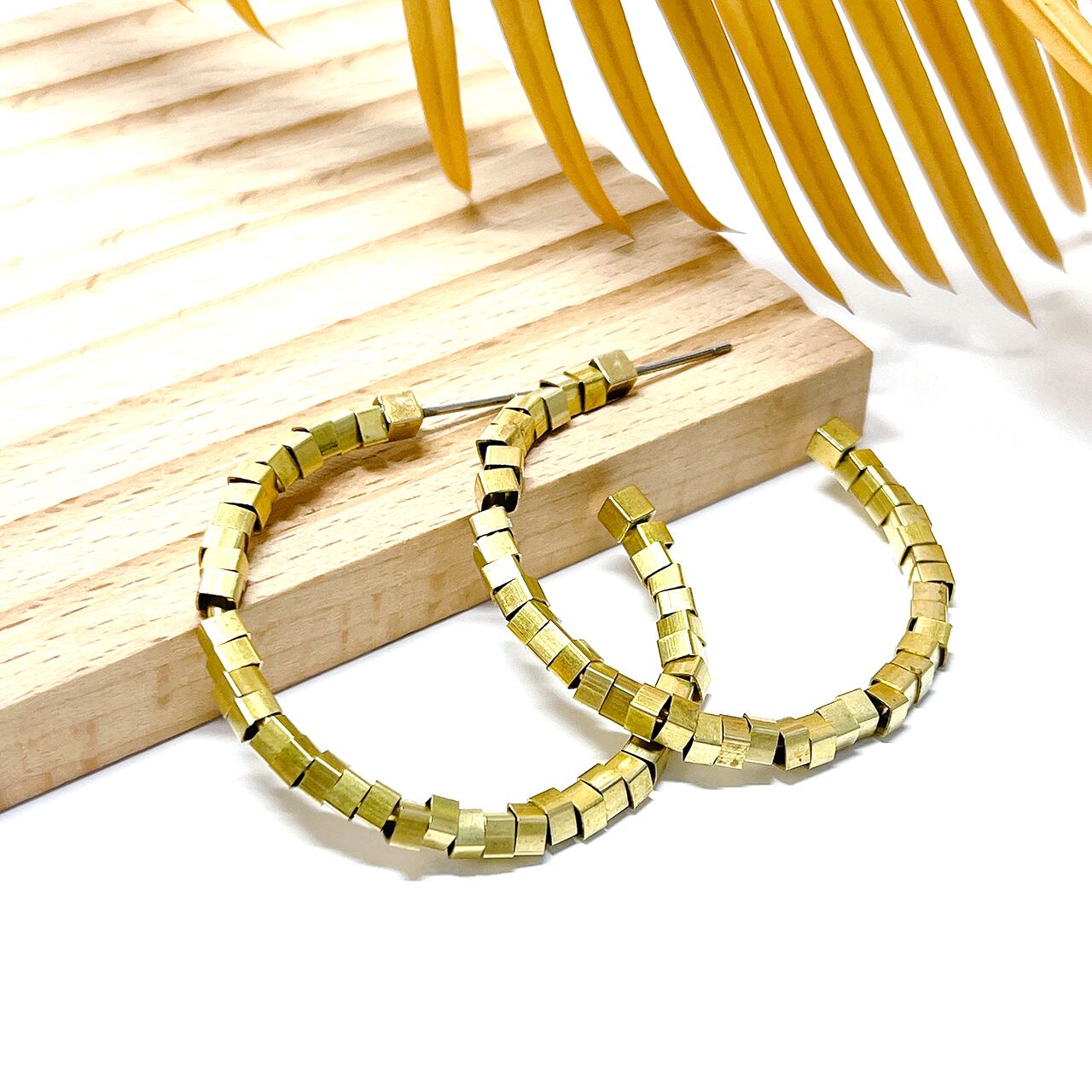 スクエア形の小さな真鍮キューブを一つひとつ丁寧に磨き上げ、フープラインに通して仕立てたアートピアス。