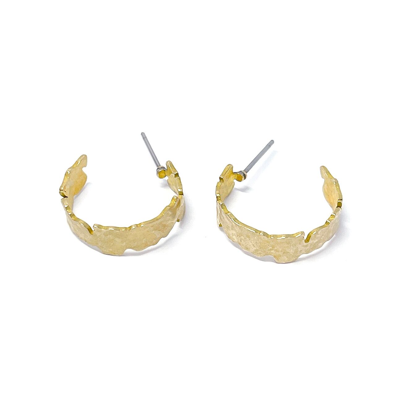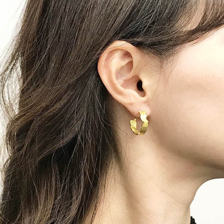 不規則なテクスチャーが光を柔らかく反射し、表情豊かに輝くフープピアス。