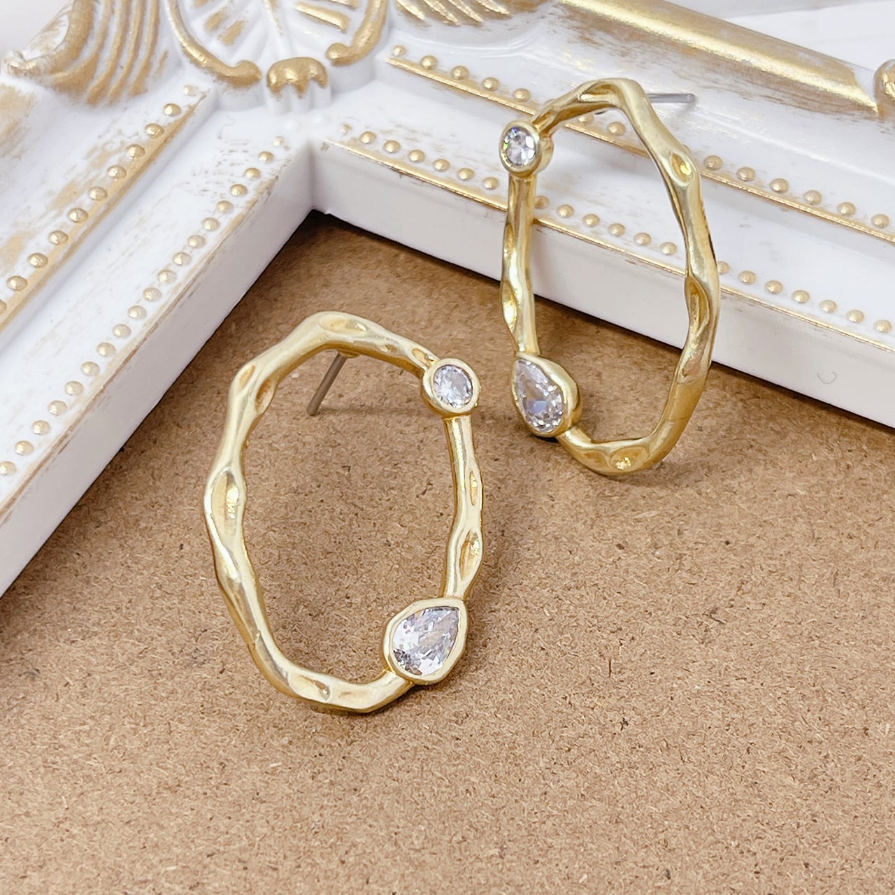 大ぶりでハンマー打ち楕円形デザインにゴージャスに輝くクリスタルカラーキュービックジルコニア!お出かけや上品な服装に。ディリーの服装を華やかに見せる存在感あるピアスです。