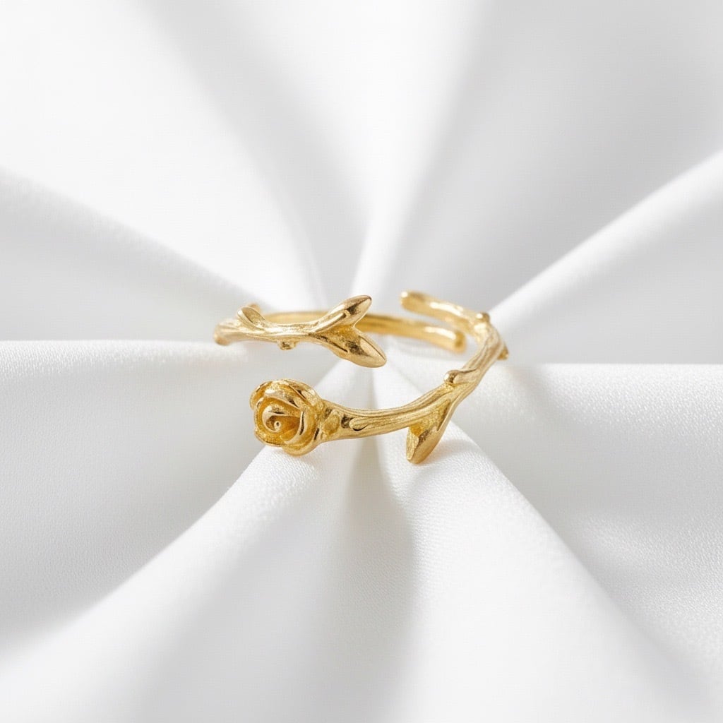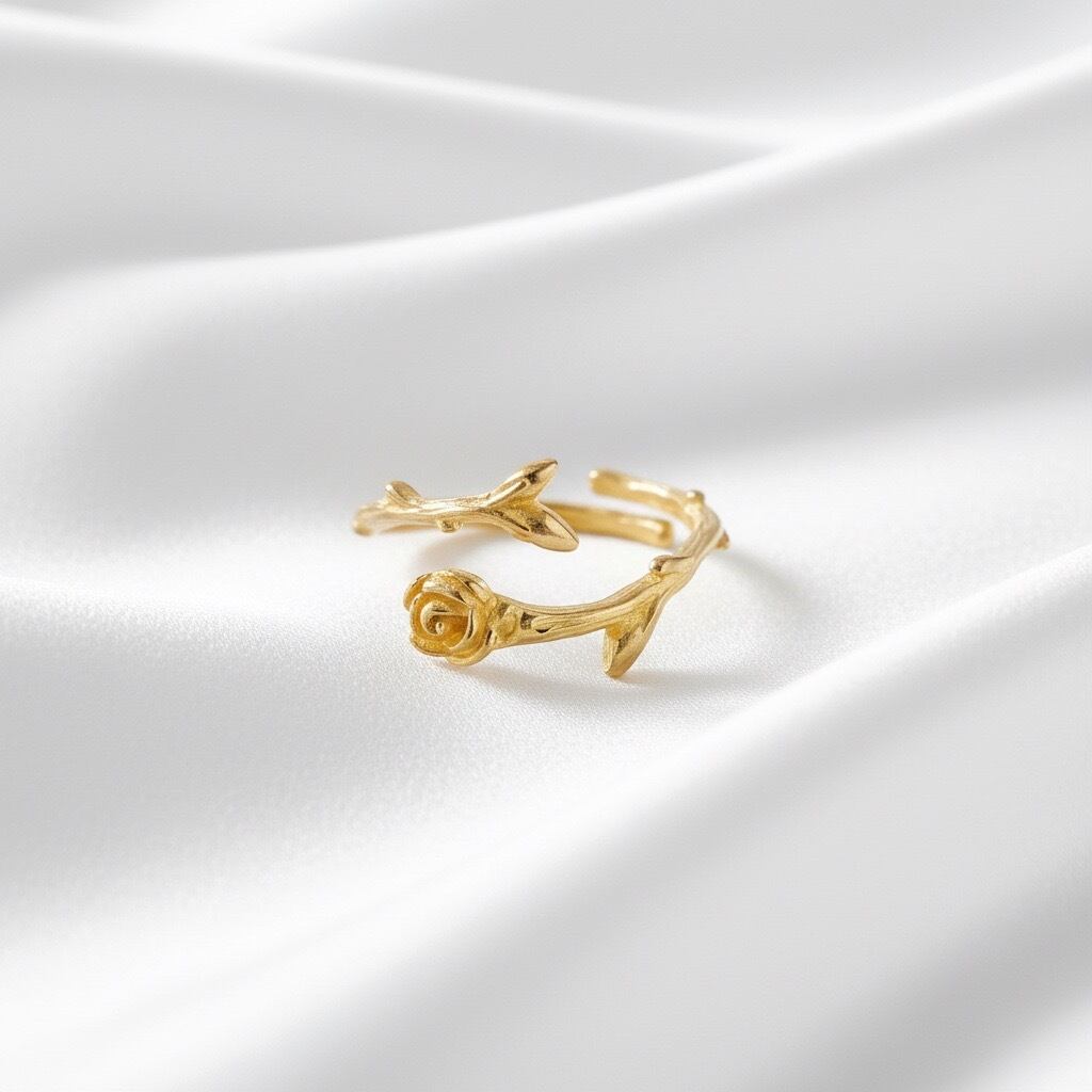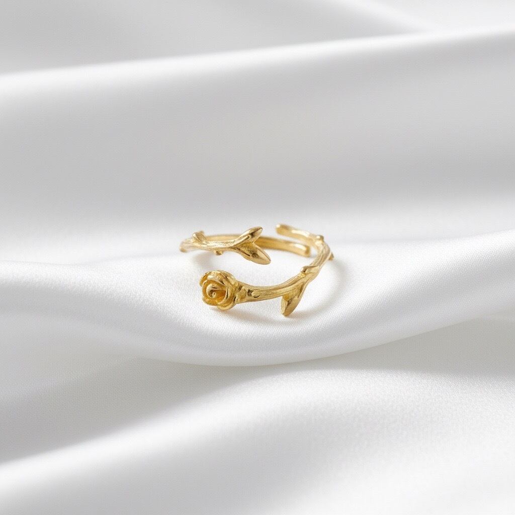 一本の薔薇を曲げて指輪の形にしたオープンリングです。繊細でエレガントなデザインリング。ディリー、カジュアルにご愛用いただけます。