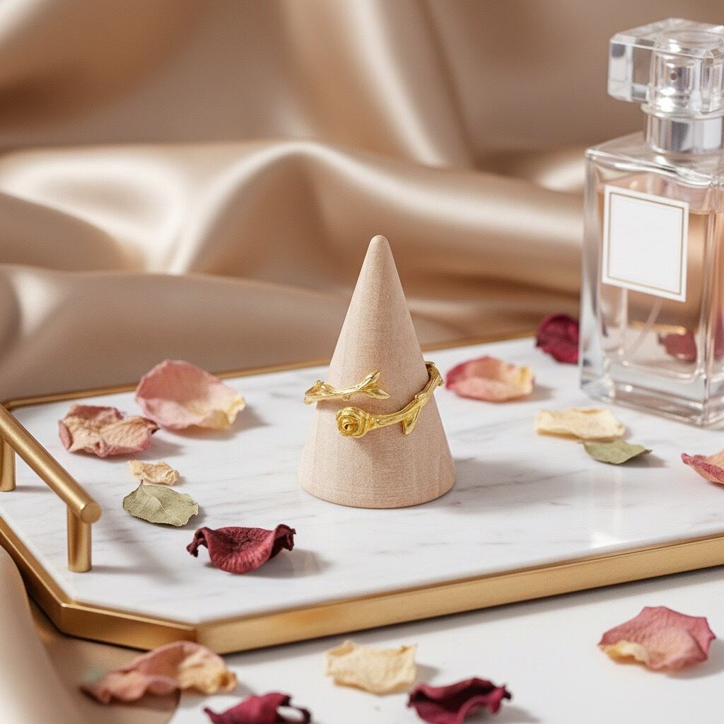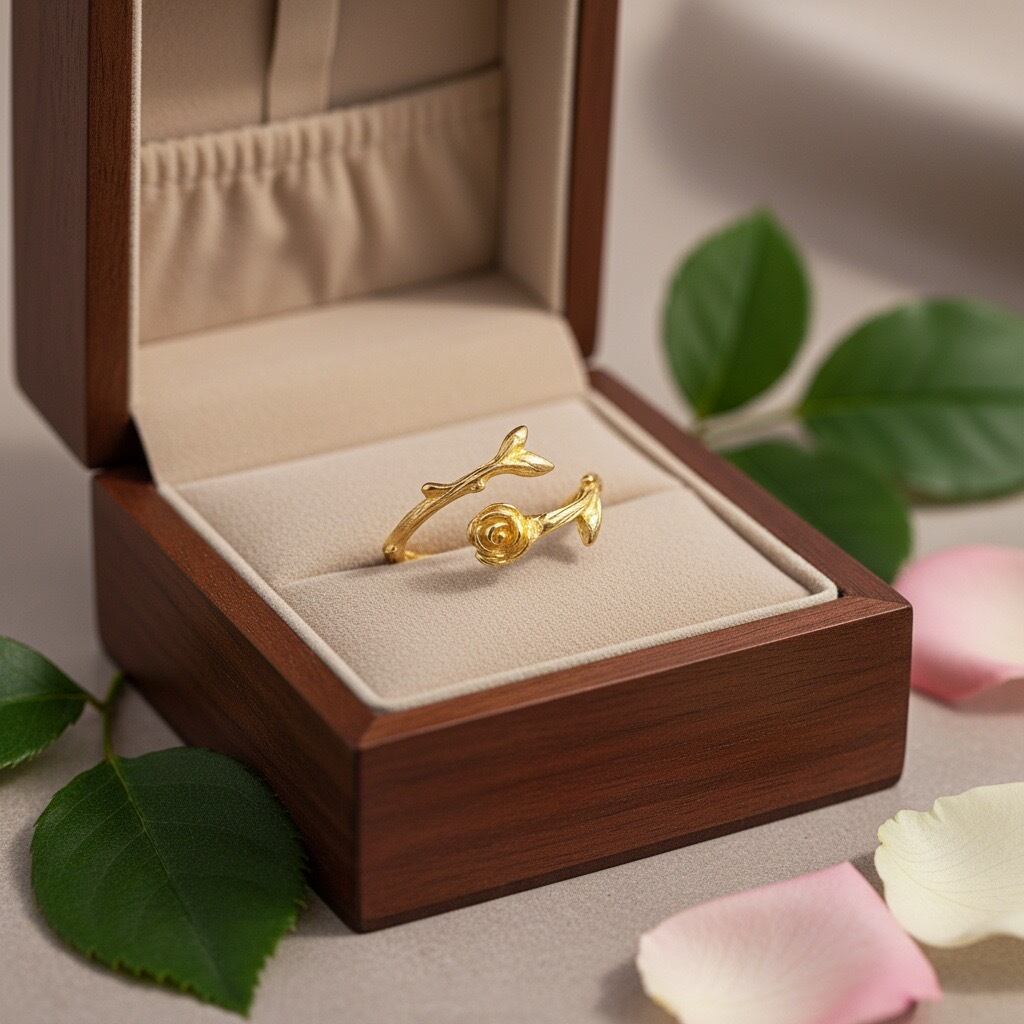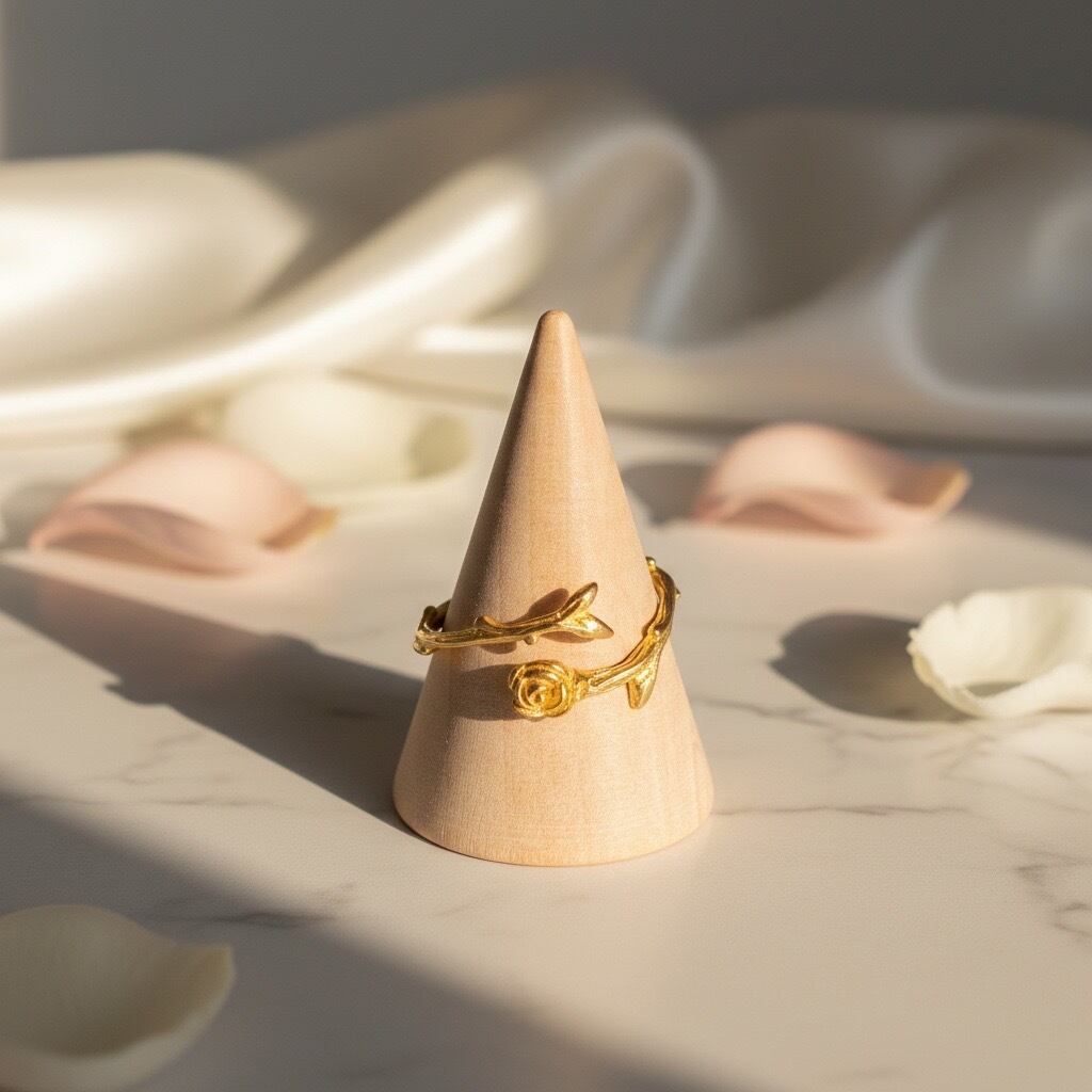 一本の薔薇を曲げて指輪の形にしたオープンリングです。繊細でエレガントなデザインリング。ディリー、カジュアルにご愛用いただけます。