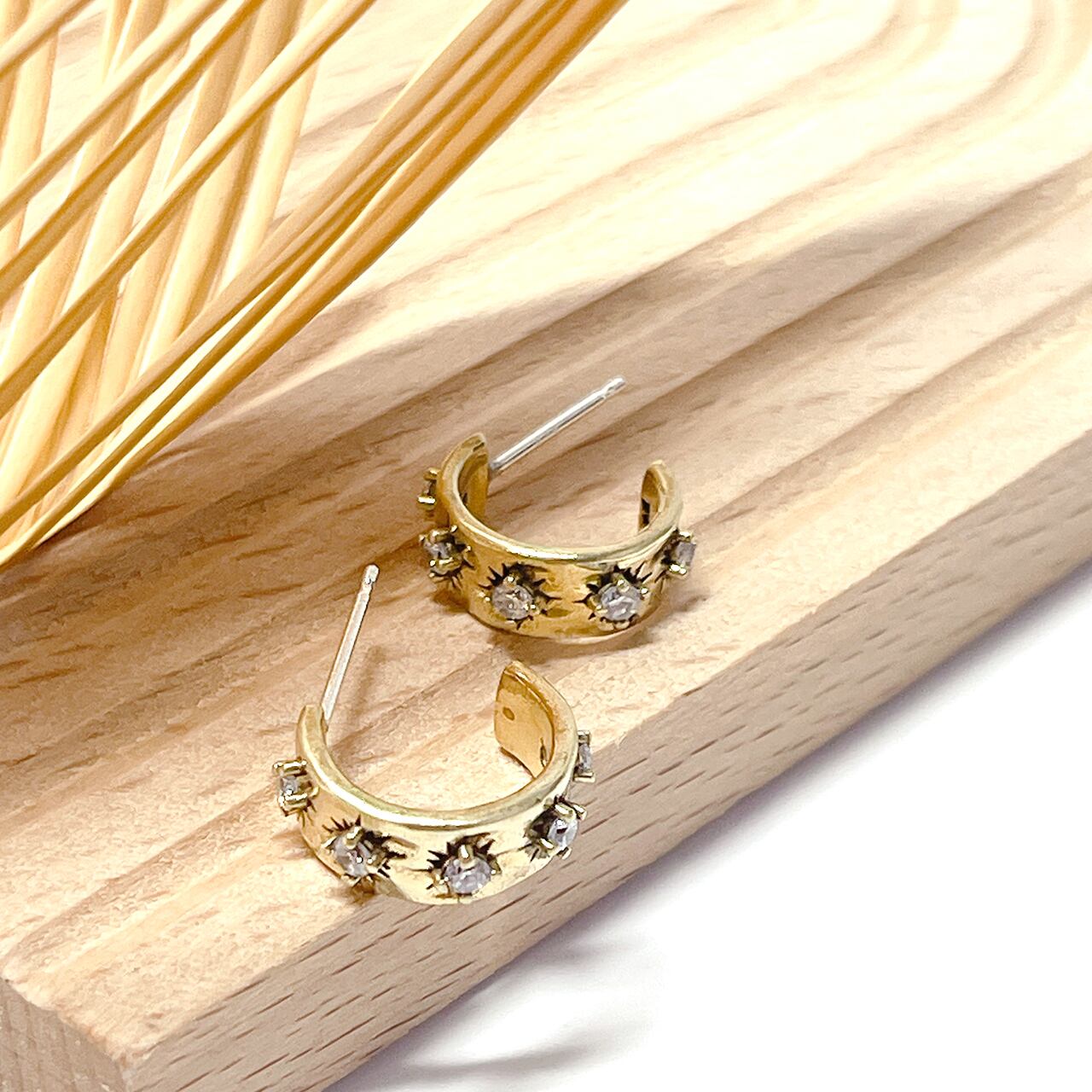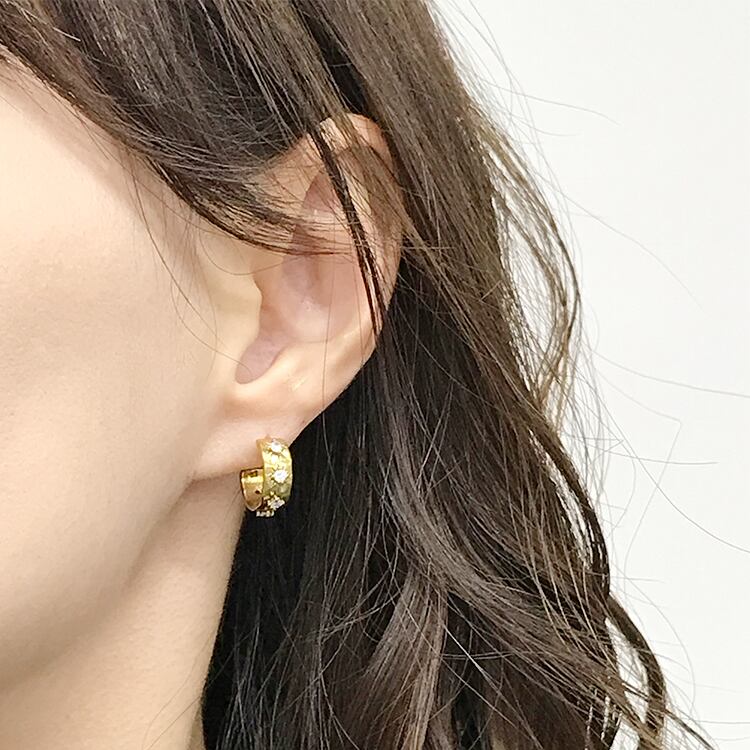 シンプルなフープ状にゴージャスに輝くキュービックジルコニアが上品なデザインピアスです。ディリー、カジュアル、おでかけやパーティーなどにもご愛用いただけるオールマイティーなピアスです。