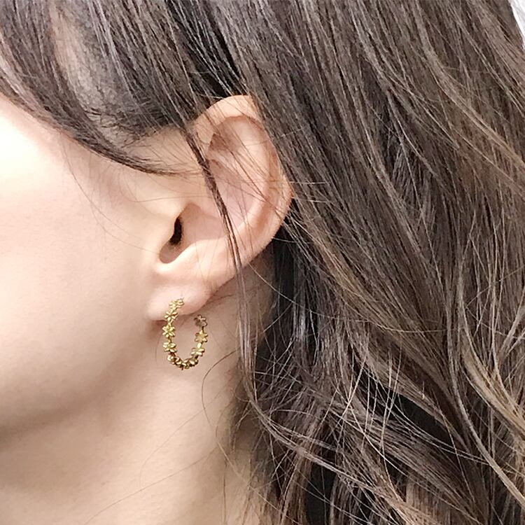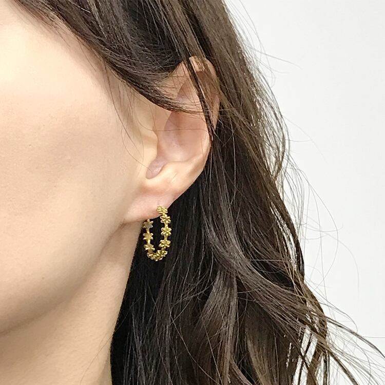 小さなお花モチーフが続く大人かわいいデザインのフープピアスです。ディリー、カジュアル、おでかけやパーティーなどにもご愛用いただけるオールマイティーなピアスです。