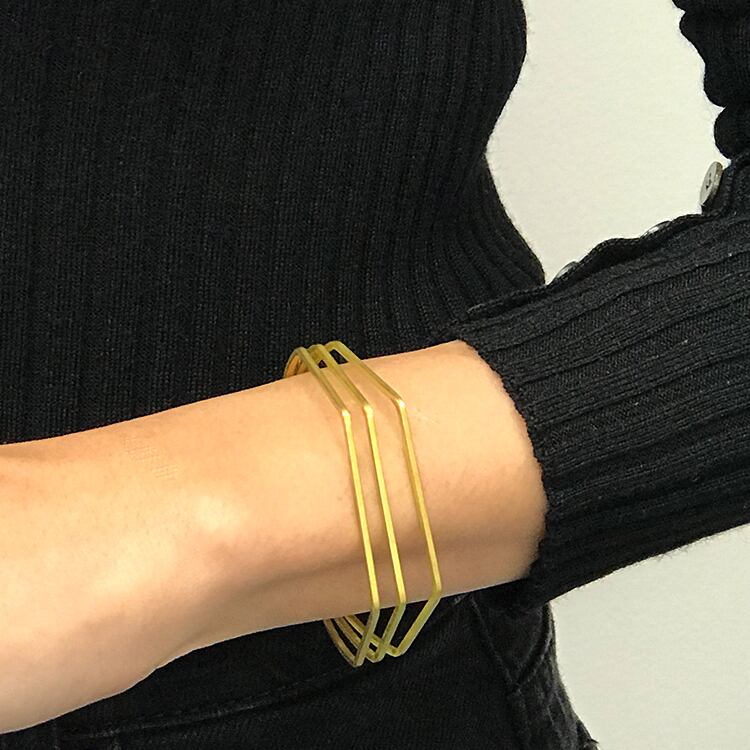 丸みある曲線、エッジがきいたシンプルな真鍮線を三つに合わせて大ぶりで存在感あるオープンバングルに仕上げました。重ねつけ、カジュアル、ディリーに気軽くご愛用いただけます。