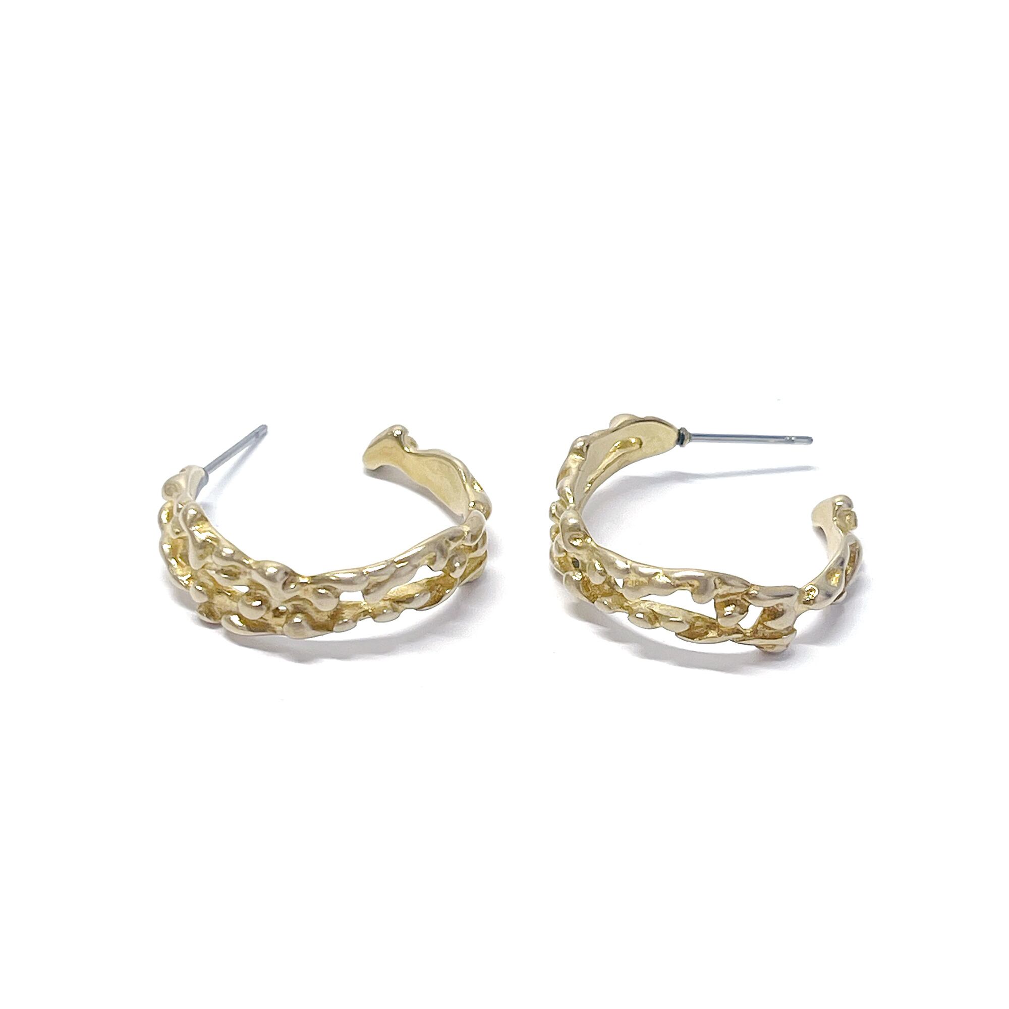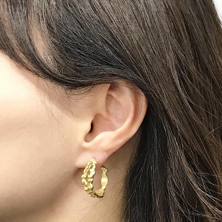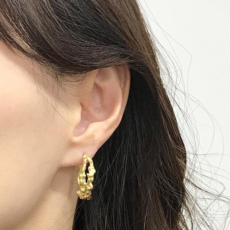 不規則な表面デザインと歪み、個性的なデザインのフープピアスです。ディリーからおでかけまで幅広いシーンでご愛用いただけます。