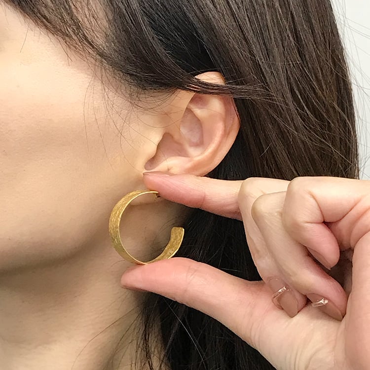 少しの凹凸感が上品な表面、幅の面積が大ぶりなフープデザインのピアスです。シンプルなフープピアスでも表面加工とボリューム感あるデザインが上品さを引き出します。ディリーからおでかけまで幅広いシーンでご愛用いただけます。