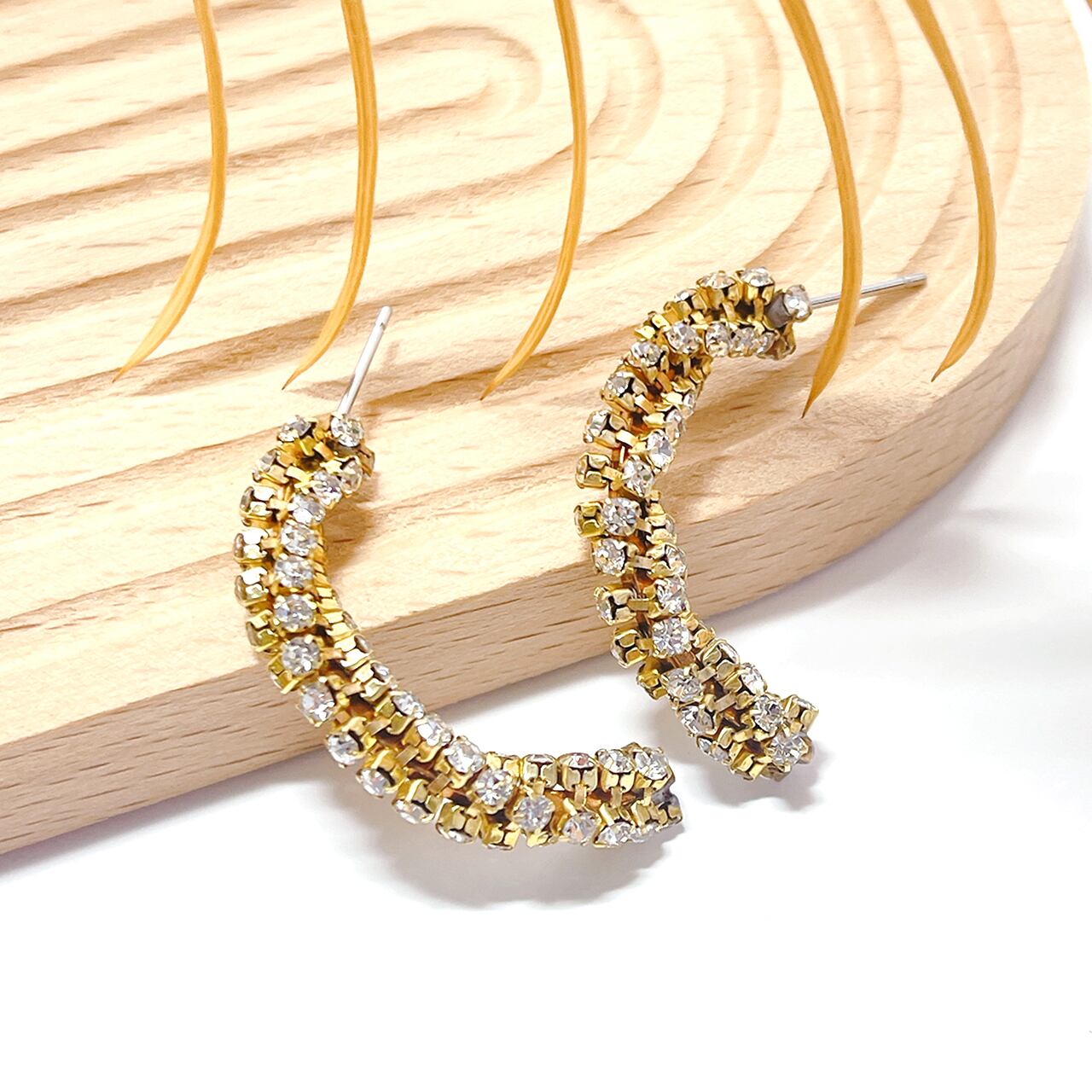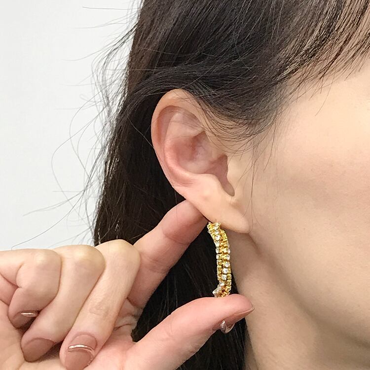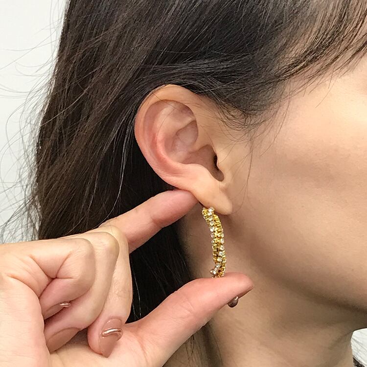 太め、優美な曲線の真鍮線を重ねてツイスト。全体に敷き詰められたストーンの輝きがゴーキャスなデザインのチタン芯ピアスに仕上げております。ディリーからおでかけまで幅広いシーンでご愛用いただけます。