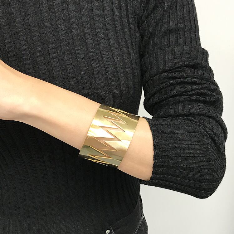 エッジーがきいたトライアングル刻みデザインが個性的な大ぶりバングルです。一つで個性的なカジュアルアクセサリーとして。ゴージャスなバングルをお手元で楽しんでいただけます。