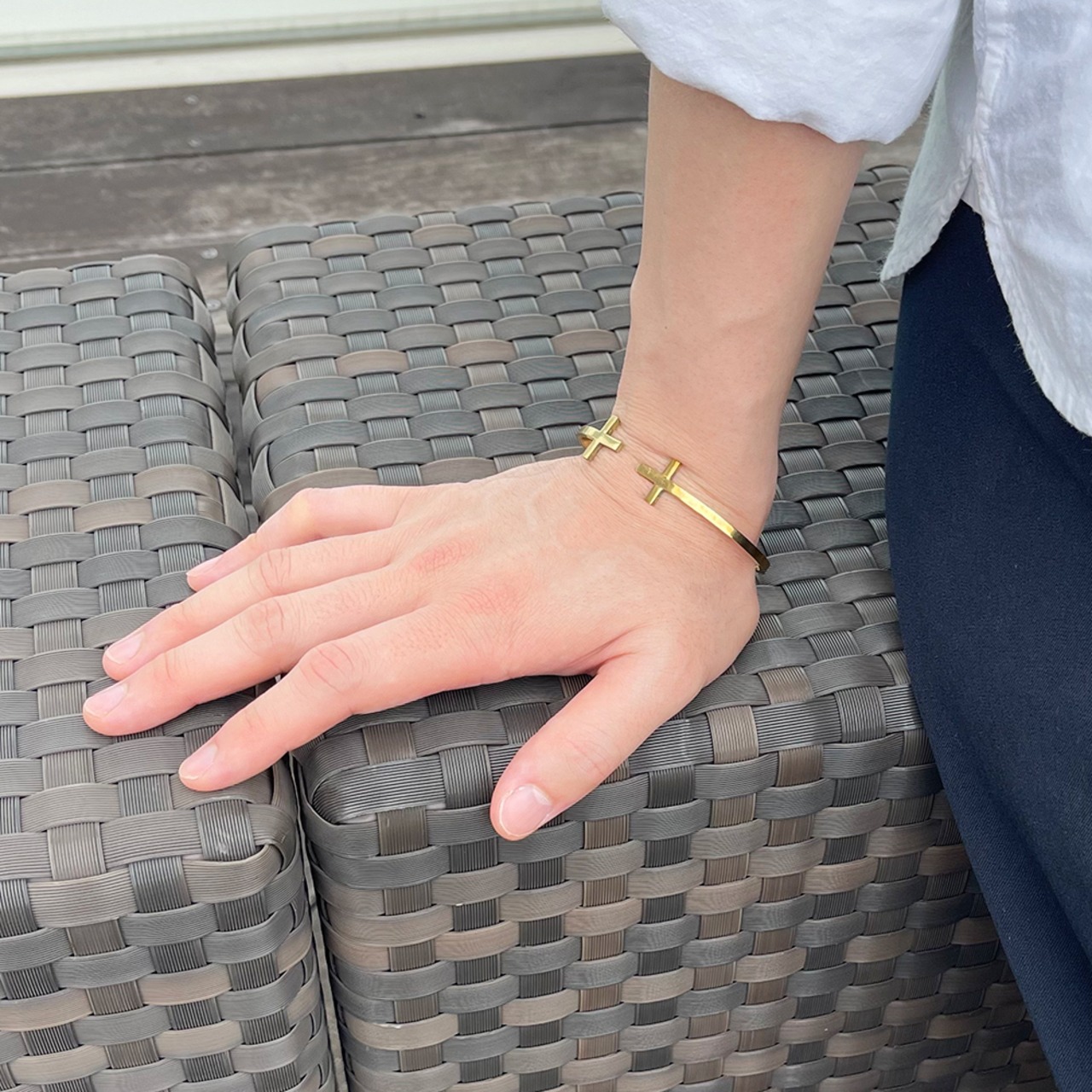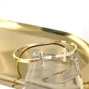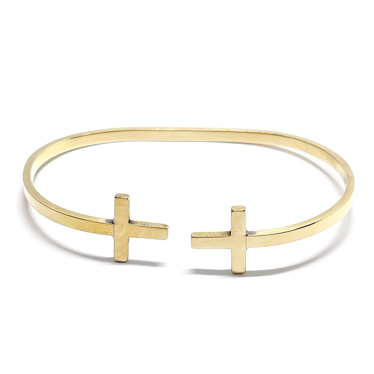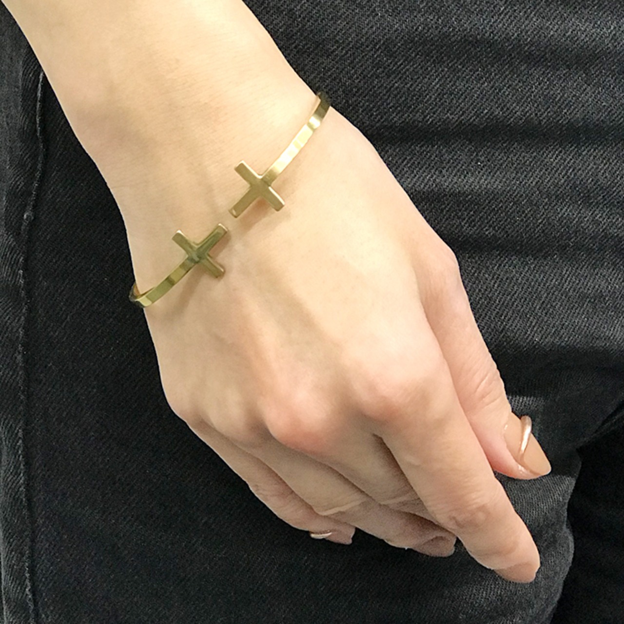 シンプルなクロスモチーフをメインにしたバングルです。シンプルで重量感あるアクセサリーとして。メインモチーフを表にすると個性的な腕元アクセサリーに。メインのサークルモチーフを腕の裏に動かすとシンプルバングルとしてご愛用いただけます。