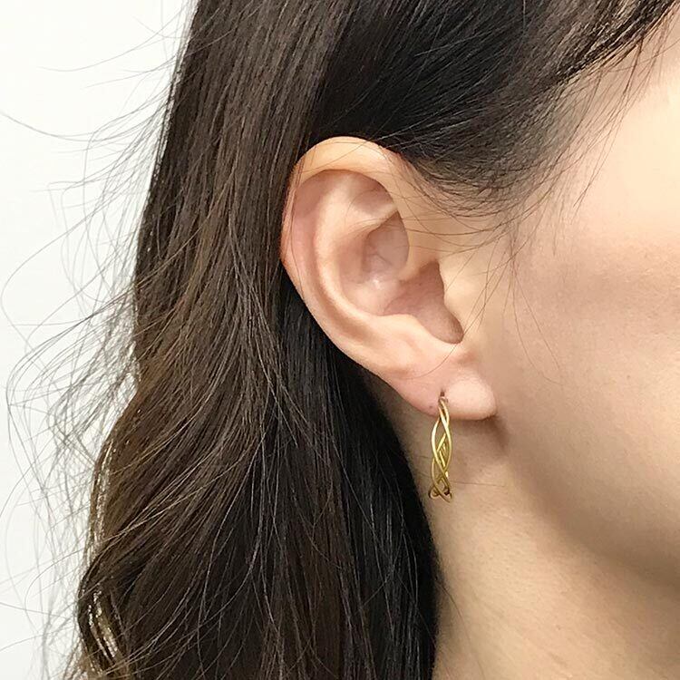 華奢な曲線が絡むシンプルデザインのフープピアスです。真鍮線を一つ一つ手曲げして絡ませたデザインです。ディリーからおでかけまで幅広いシーンでご愛用いただけます。ピアスと、クリップ式ピアスの2タイプをご用意しており、お好みに合わせてお選びいただけます。クリップ式ピアスはピアスキャッチ要らずの落ちにくい留め金具です。