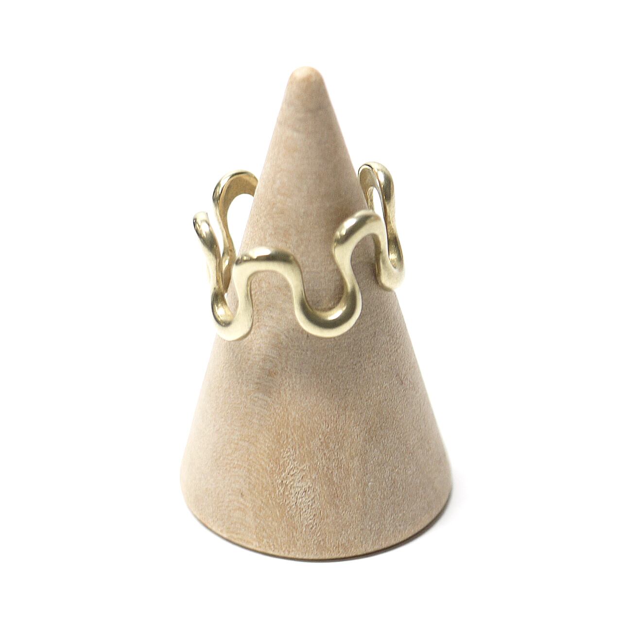 大ぶり。大きく揺れる波のような曲線が指を包むようなシックで個性的なデザインリングです。一つで存在感あるアクセサリーとして。ディリーやお出かけのスタイリングまで楽しんでいただけます。全て手作業で曲線を曲げておりますので商品によって波の間隔は少々異なる場合もございます。