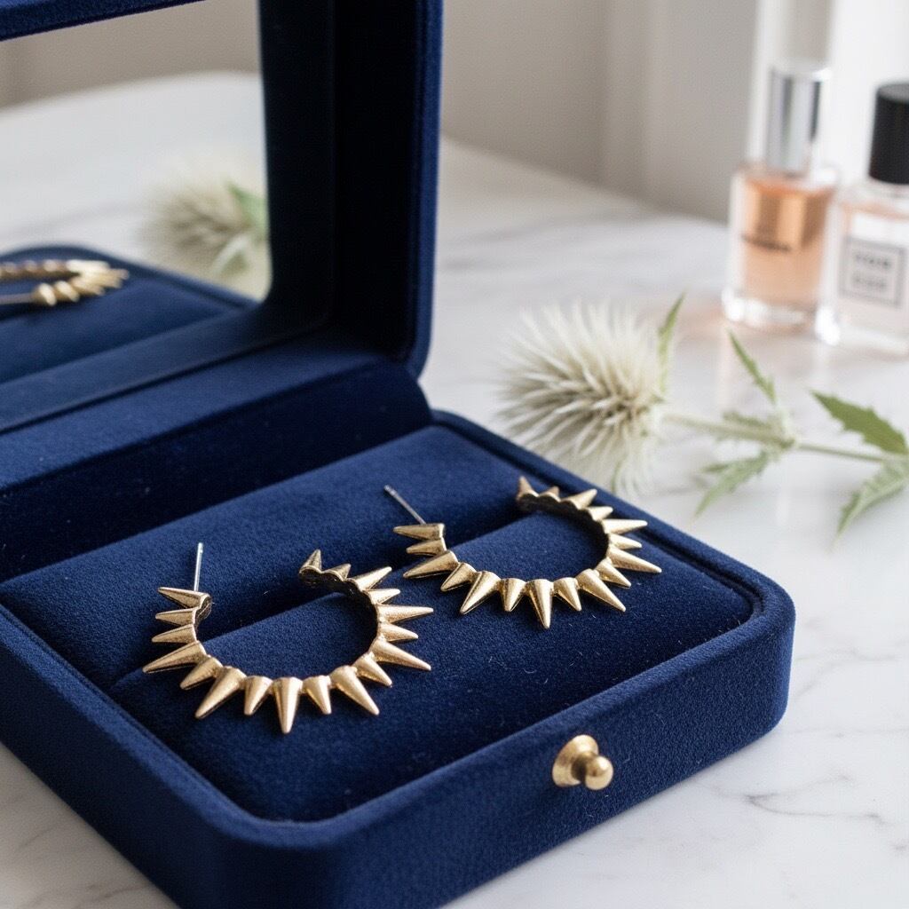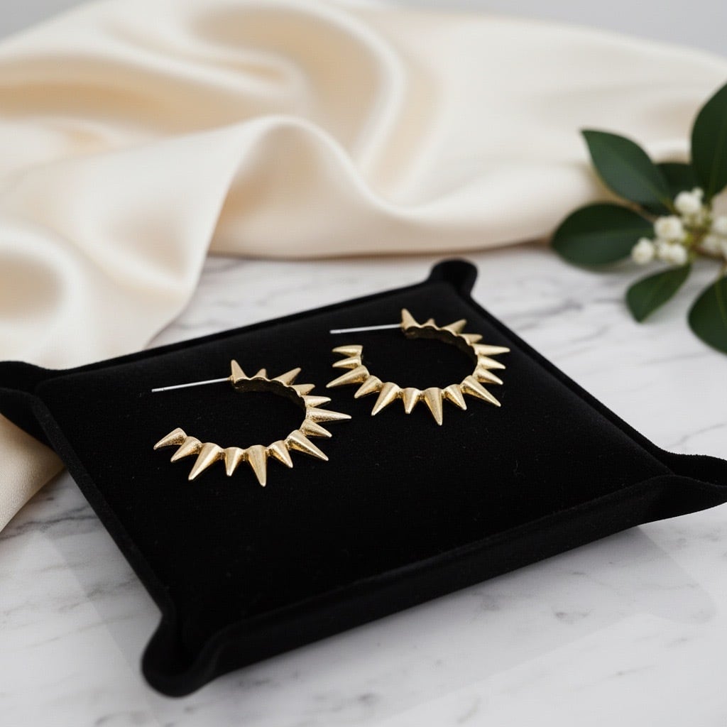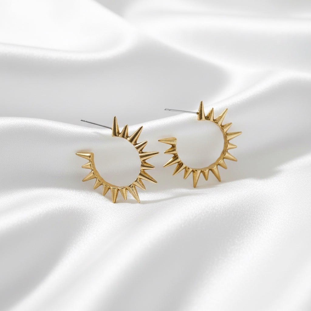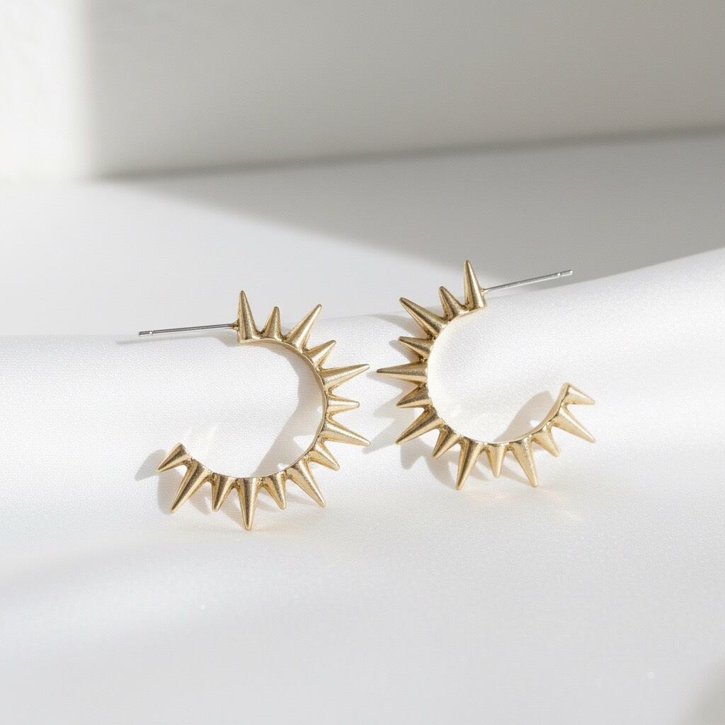 個性的な太陽の光を反射するイメージを再現した、ミディアムサイズのフープスタイルのピアスです。個性的なデザインがシンプルな服装をおしゃれに演出。カジュアルシーンからお出かけシーンにもご愛用いただけます。