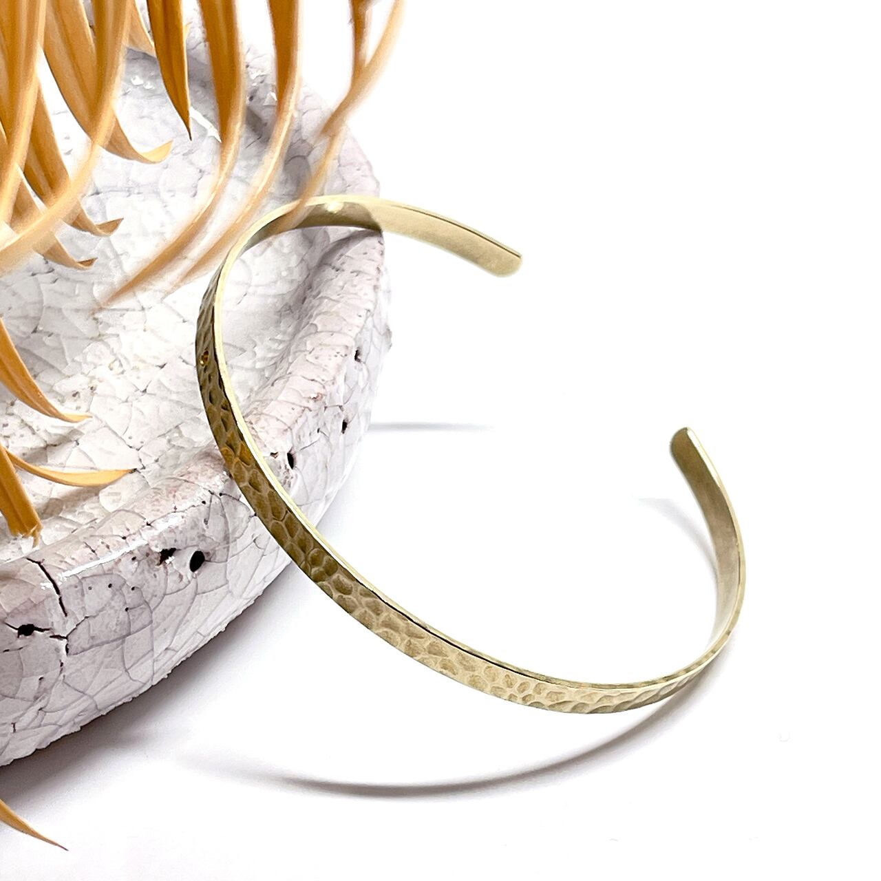 本体の手打ち感が個性的なシンプルフレームのオープンバングルです。重ねつけ、ディリーからカジュアルにご愛用いただけます。