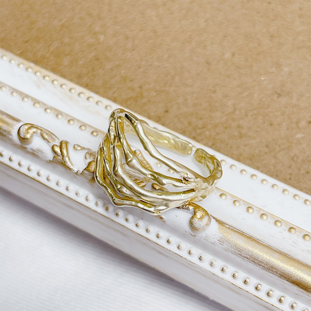 不規則な歪み五連の曲線デザインの大ぶりオープンリングです。大ぶりデザインでも曲線の隙間が指先を細くおしゃれに見せます。レイヤードリングとしても一つでボリューム感あるリングとしてもご愛用いただけます。