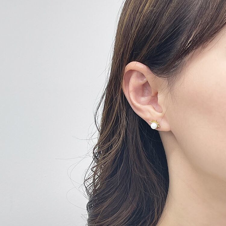 太陽を思わせるラウンドフォルムの真鍮モチーフの中央に、小粒のガラスパールをセット。繊細なデザインが耳元を上品に彩り、シンプルながらも印象的な存在感を放ちます。デイリーにもおでかけにも使いやすく、カジュアルからフォーマルまで幅広いスタイルにマッチ。軽やかな着け心地で、長時間の着用にも快適です。