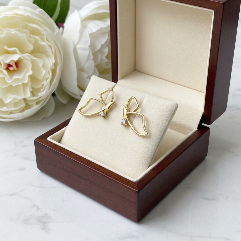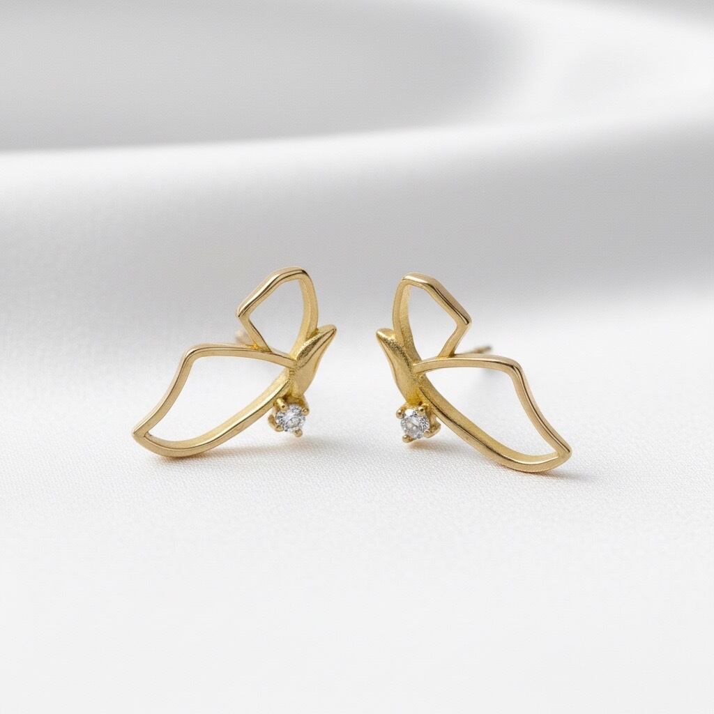 蝶が舞うようなエレガントなデザインに一粒のキュービックジルコニアを加える事で豪華な上品をプラスしたデザインピアスです。