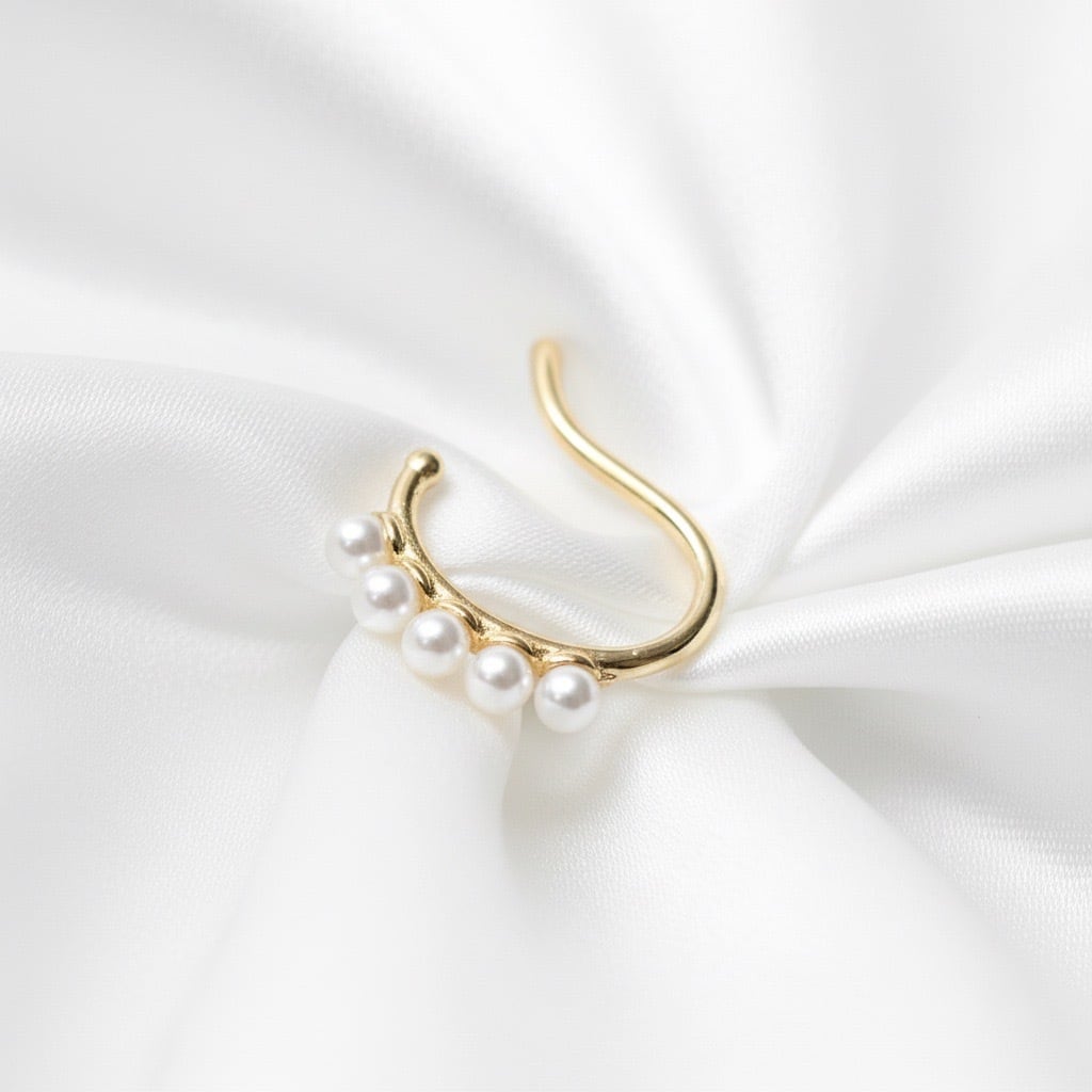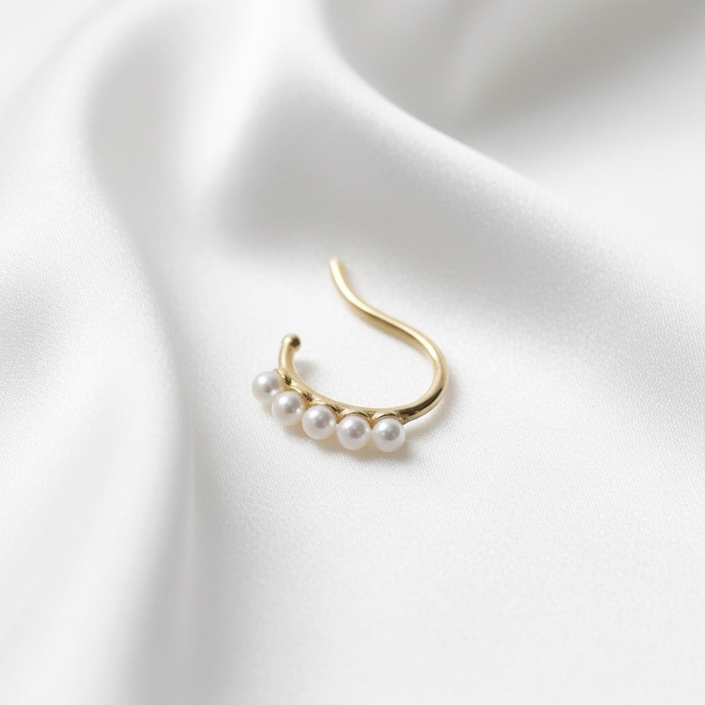 大人の洗練されたオシャレ感に一味違うアイテムとしての小粒ガラスパール付き曲線のイヤーカフ、軟骨ピアスです。