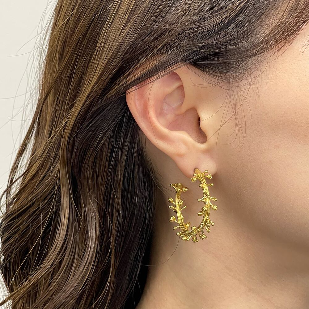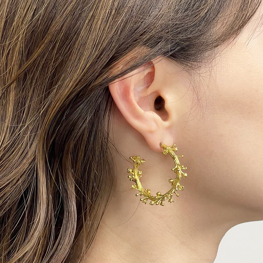 迫力ある大きさ。繊細でリアルなリーフ、花等のボタニカルモチーフを一つの曲線の上に。美しい手曲げでフープ状に仕上げております。美しさと独自性を活かし、個性とスタイルを際立されるデザインピアスです。
