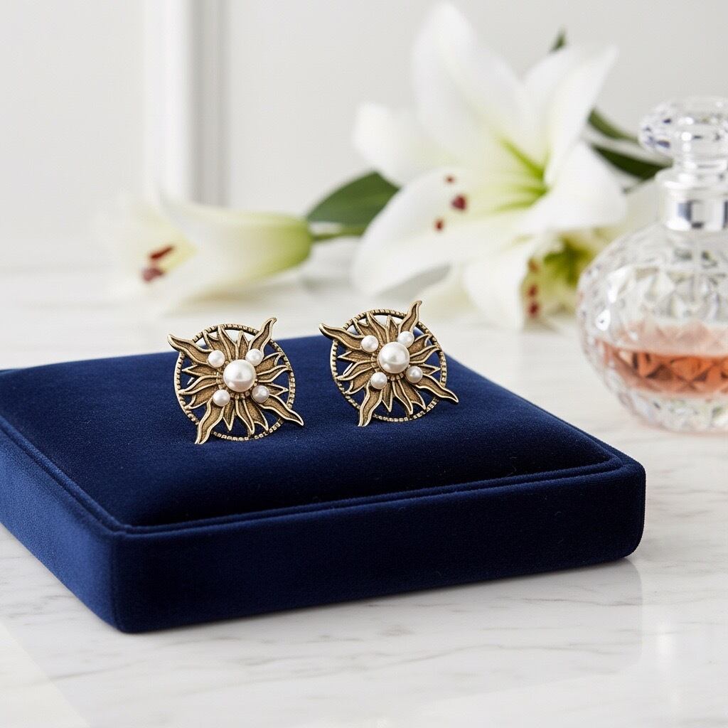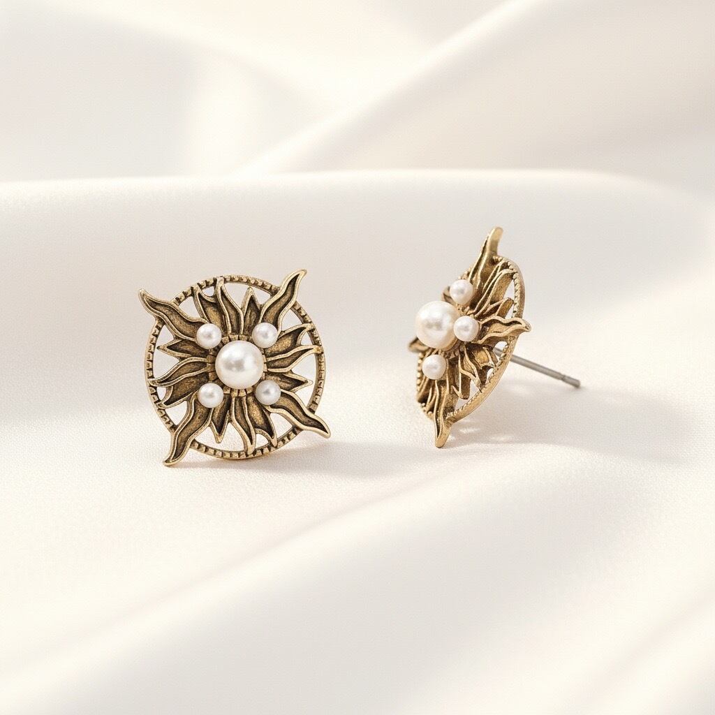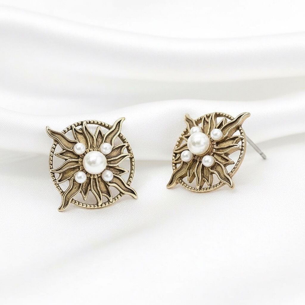 繊細でユニーク、特別感な印象づけのガラスパール付きのサンバーストモチーフのスタッドピアスです。