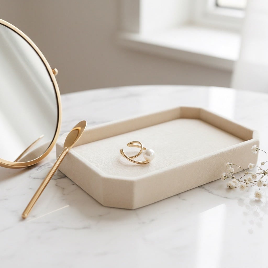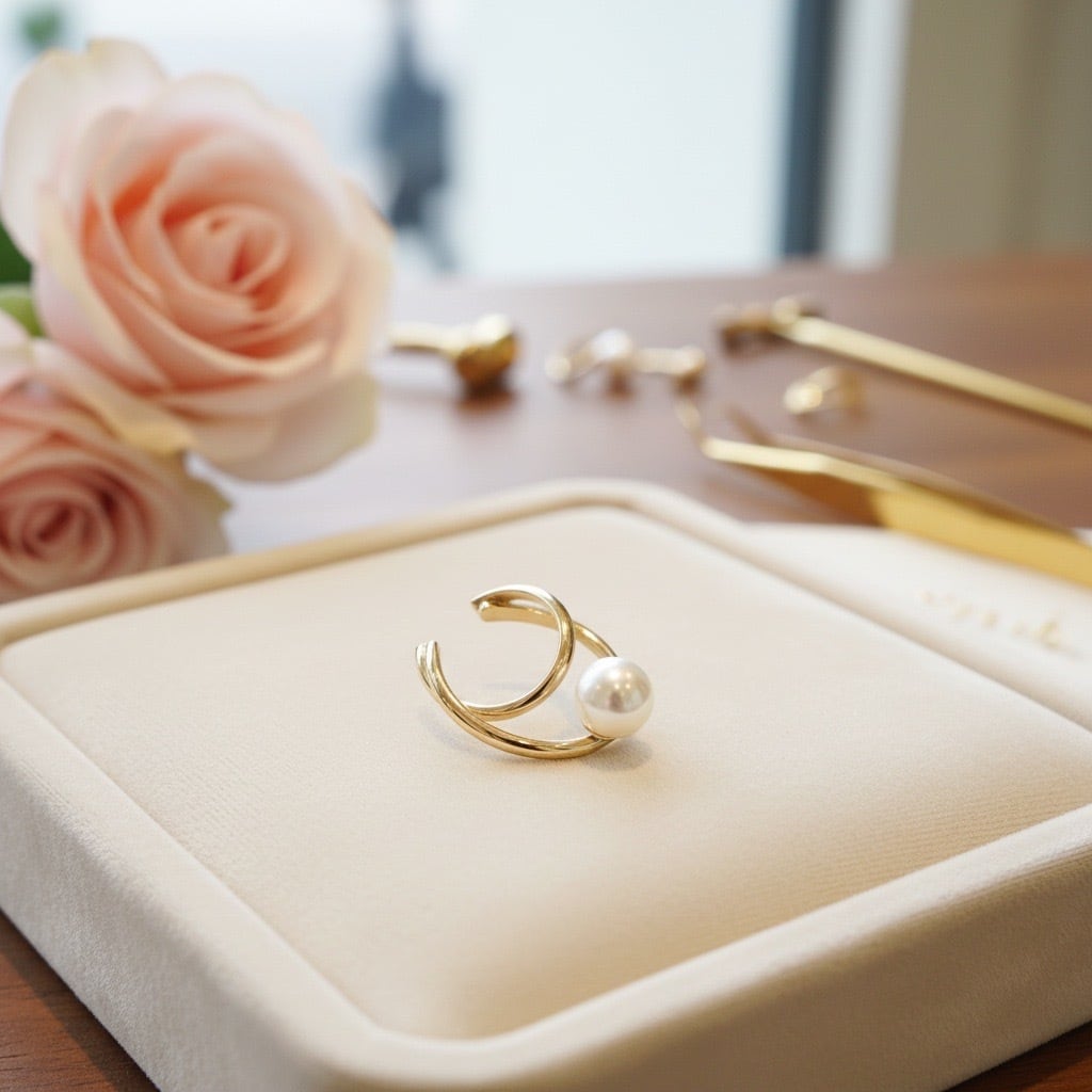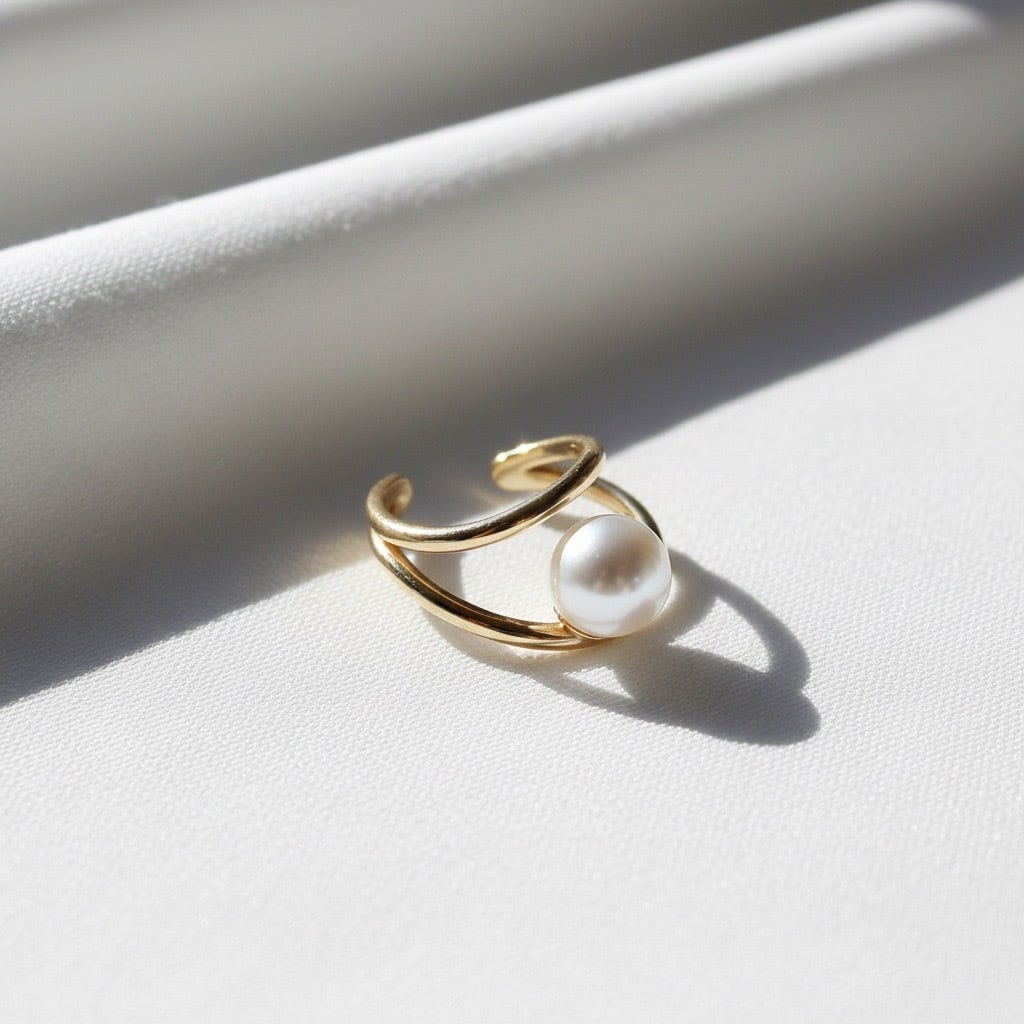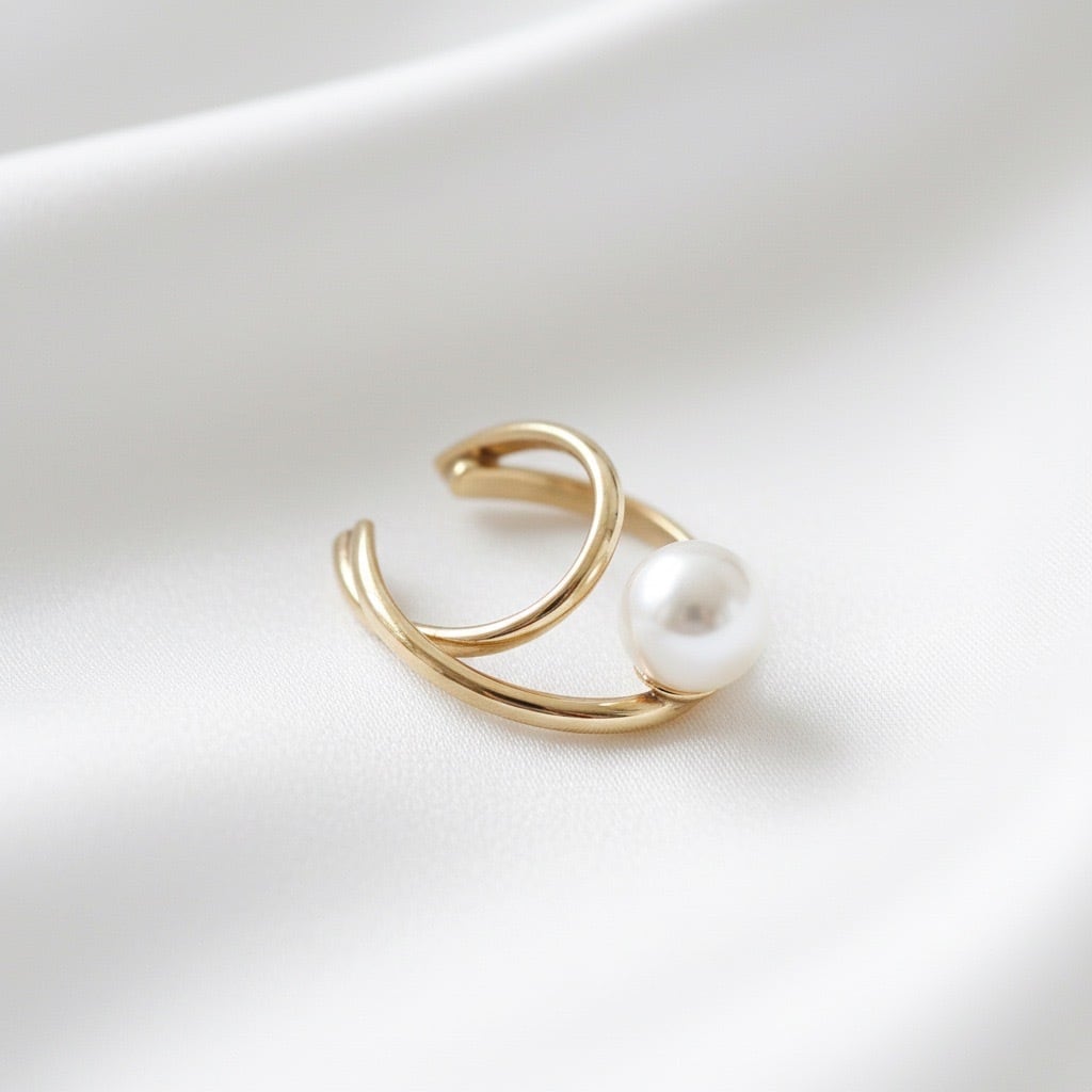 シンプルな二連のオーバルに大粒のガラスパールをセット。カジュアルなエレガントさ、ディリーやトラベルジュエリーにご愛用いただけるイヤーカフです。