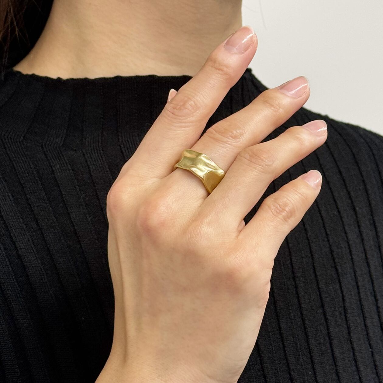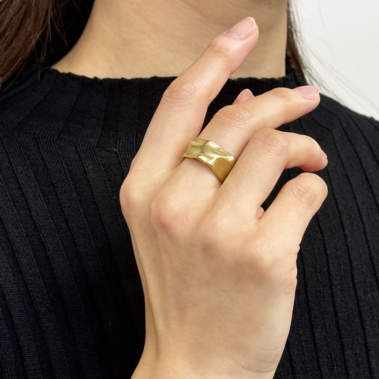 全体が手作り感ある歪み、押されたようなシワ感が個性的で大ぶりなオープンリング、指輪です。ボリューム感あるリングは指を細く見せる効果もあり、一つで存在感を発揮します。シーンや服装を選ばないシンプルなデザインが魅力です。
